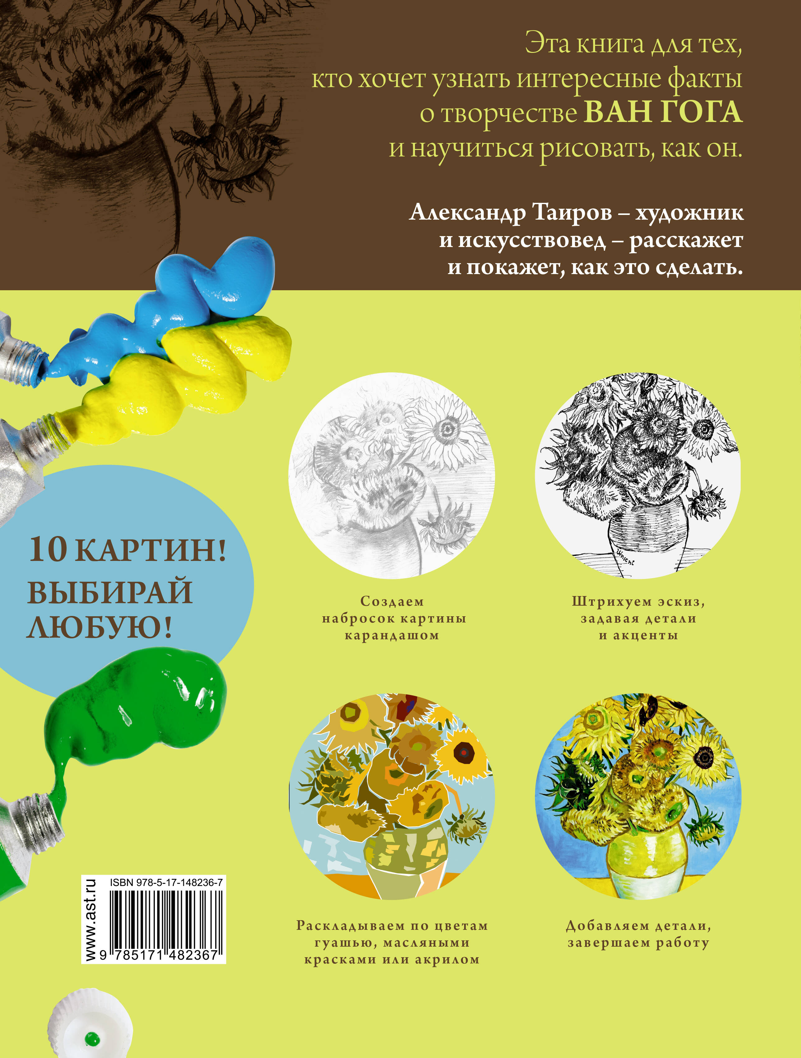 Эта книга для тех, кто не умеет рисовать, но хочет научиться, а также для тех, кто рисует неплохо, но готов совершенствоваться дальше. На примере десяти картин Ван Гога разных жанров, - а среди них "Звездная ночь", "Кафе в Арле", "Автопортрет", "Подсолнухи", - художник, известный искусствовед Александр Таиров поэтапно показывает, как работал мастер. Повторяя, вы сможете нарисовать картину, похожую на вангоговскую, добавив фантазии и глубже раскрыв свой собственный талант живописца. Лучше понять композицию и распределение цвета на полотне помогут раскраски, сделанные для каждой работы Ван Гога. Из книги вы также узнаете, какие Ван Гог использовал приемы, как выбирал цвета, почему столько внимания уделял свету и тени, каким видел и изображал мир и что в конечном итоге определило его столь узнаваемый всеми стиль.| Издательство | ИЗДАТЕЛЬСТВО "АСТ" |