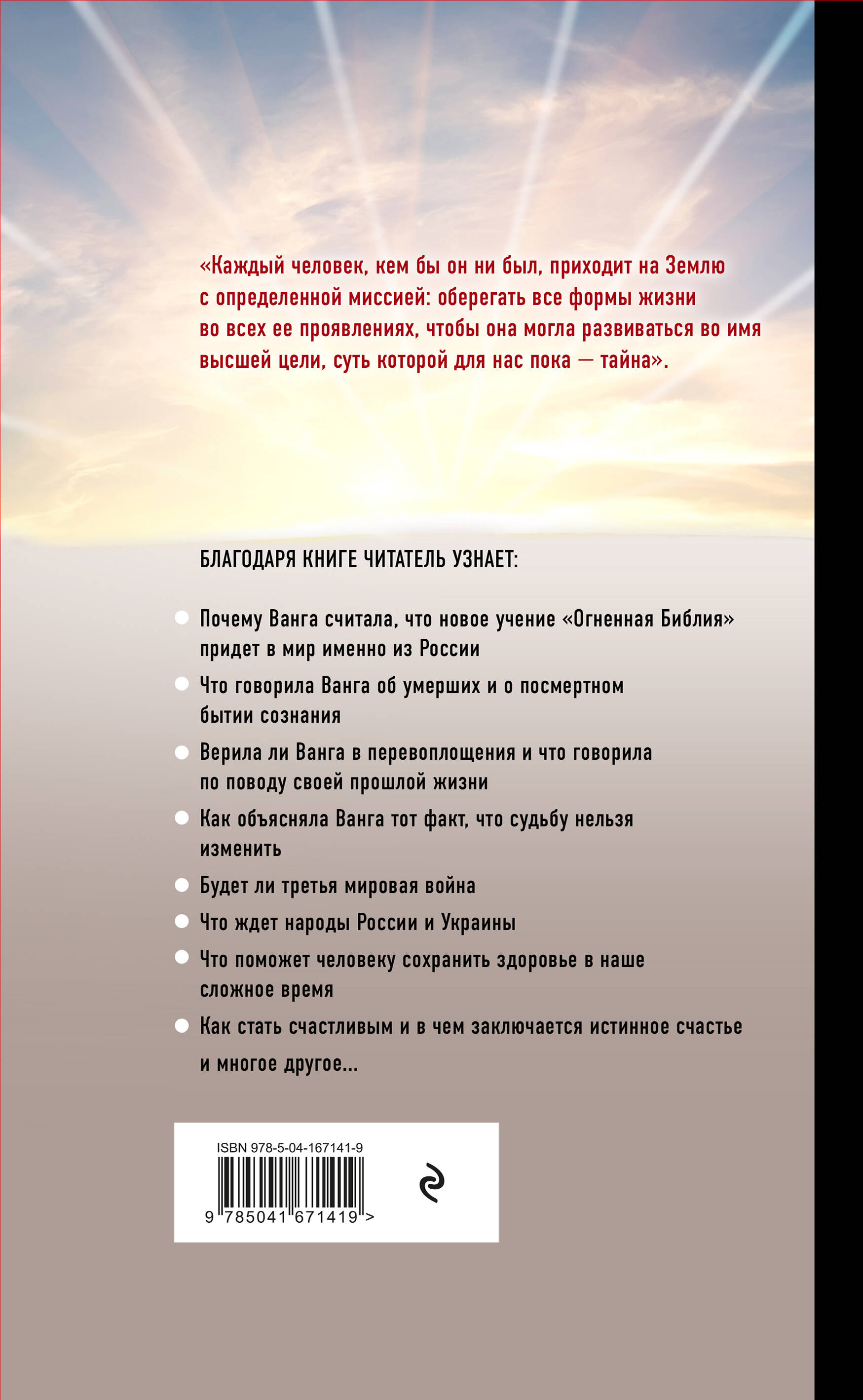 В этой книге изложены многие предсказания Ванги. Ее последние пророчества стали известны сравнительно недавно благодаря свидетельствам общавшихся с ней в 1990-е годы людей. Эти пророчества касались самых важных событий наших дней. Ванга успела предсказать и появление нового опасного вируса, который придет с Востока и вызовет эпидемию, и кризис в российско-украинских отношениях, и то, чем это закончится. В этой книге приводятся также многие советы провидицы, полезные для всех, и ее предсказания, касающиеся апокалипсического будущего всего мира и в том числе России. А самое главное - эта книга раскрывает читателям удивительное мировоззрение Ванги, тайные знания о мире и человеке, которыми она обладала. Эти знания сами по себе представляют собой целое учение о невидимой стороне жизни, играющей огромную роль в человеческих судьбах. Без этих знаний не обойтись тому, кто хочет постичь тайны своей собственной жизни и судьбы…| Издательство | Эксмо |