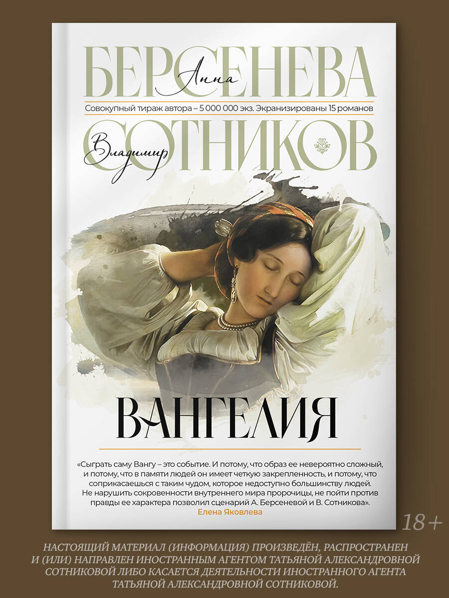 НАСТОЯЩИЙ МАТЕРИАЛ (ИНФОРМАЦИЯ) ПРОИЗВЕДЕН ИНОСТРАННЫМ АГЕНТОМ ТАТЬЯНОЙ АЛЕКСАНДРОВНОЙ СОТНИКОВОЙ, ЛИБО МАТЕРИАЛ (ИНФОРМАЦИЯ) КАСАЕТСЯ ДЕЯТЕЛЬНОСТИ ИНОСТРАННОГО АГЕНТА ТАТЬЯНЫ АЛЕКСАНДРОВНЫ СОТНИКОВОЙ. Ванга - знаменитая на весь мир провидица - предсказала многие события современной истории: срок жизни Сталина, ввод советских войск в Чехословакию, гибель Индиры Ганди, аварию подводной лодки "Курск", падение башен-близнецов в США. Как сказал Евгений Князев, сыгравший одну из ролей в первом художественном фильме о ясновидящей - "Вангелия", - созданном по сценарию Анны Берсеневой и Владимира Сотникова, "сколько документальных фильмов снято о Ванге! Но ни один из них не раскрывал перед нами характер великой пророчицы, не проливал света на ее драматическую судьбу. А.Берсеневой и В.Сотникову удалось то, что не удавалось никому". Первый роман о Ванге, созданный авторами по мотивам фильма, дает представление о прорицательнице как о человеке, женщине, возлюбленной, жене, матери.| Издательство | ИЗДАТЕЛЬСТВО "АСТ" |