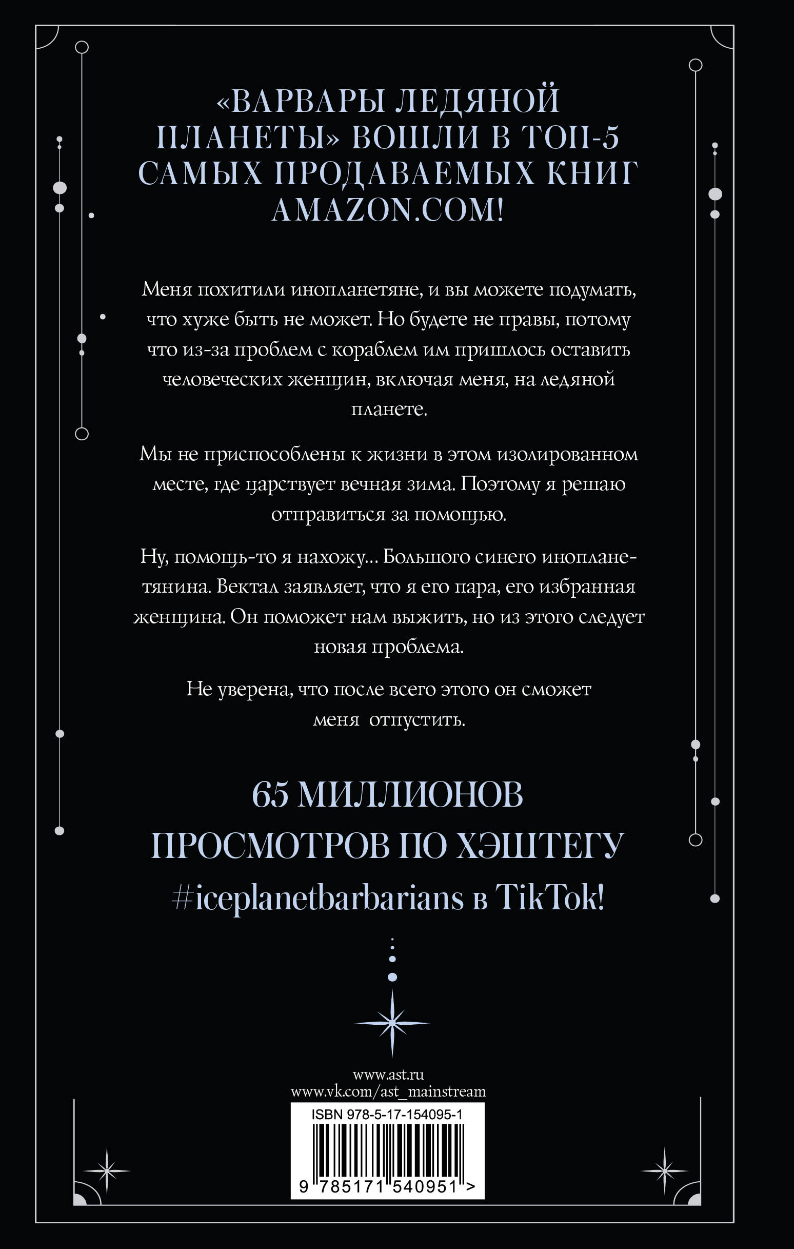 Меня похитили инопланетяне, и вы можете подумать, что хуже быть не может. Но будете неправы, потому что из-за проблем с кораблем им пришлось оставить человеческих женщин, включая меня, на ледяной планете. Мы не приспособлены к жизни в этом изолированном месте, где царствует вечная зима. Поэтому я решаю отправиться за помощью. Ну, помощь-то я нахожу… Большого, синего инопланетянина. Вектал заявляет, что я его пара, его избранная женщина. Он поможет нам выжить, но из этого следует новая проблема. Не уверена, что после всего этого он сможет меня отпустить.| Издательство | ИЗДАТЕЛЬСТВО "АСТ" |