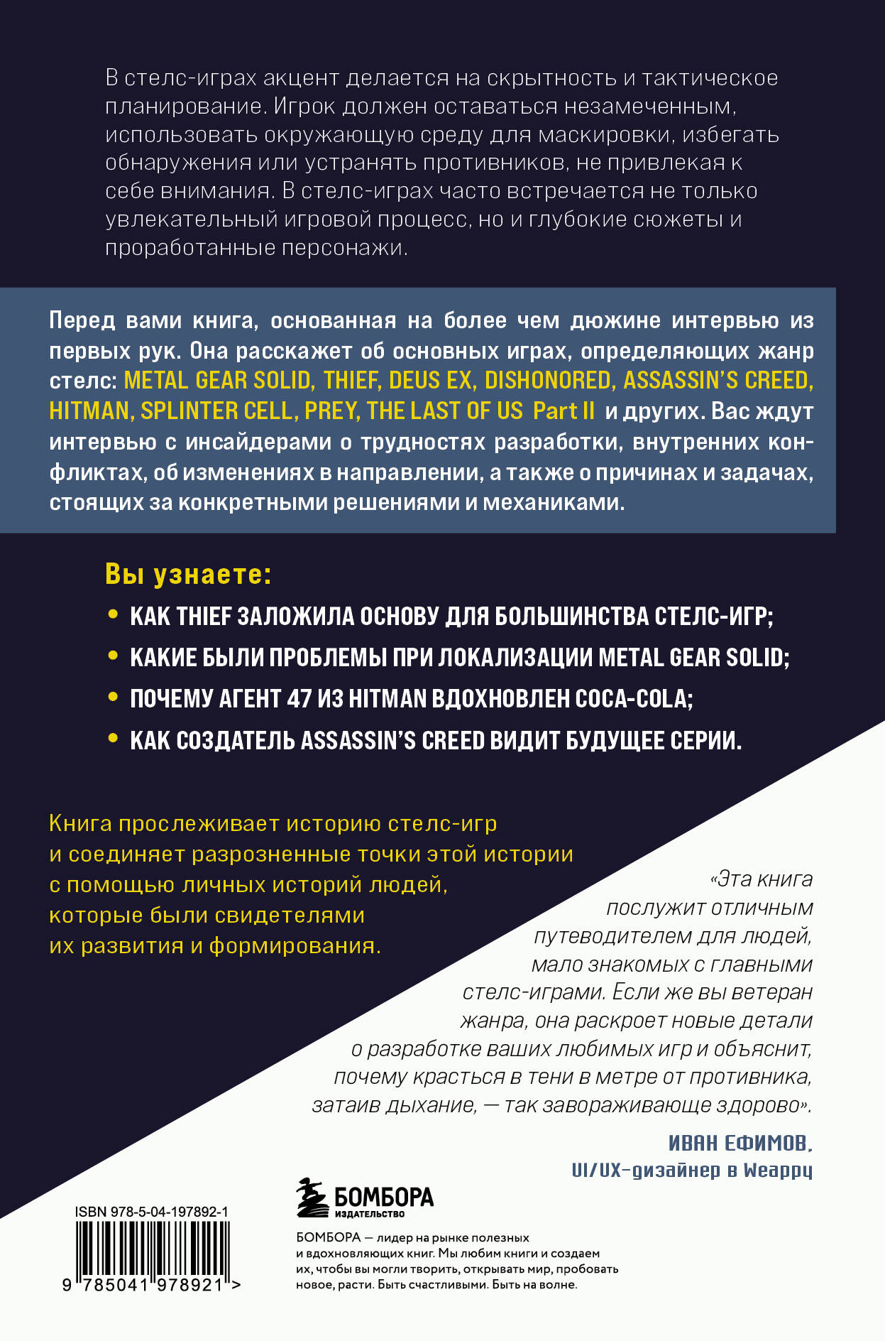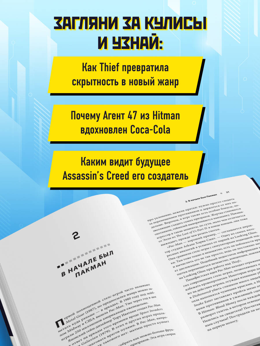 В стелс-играх акцент делается на скрытность и тактическое планирование. Игрок должен оставаться незамеченным, использовать окружающую среду для маскировки, избегать обнаружения или устранять противников, не привлекая к себе внимания. В стелс-играх часто встречается не только увлекательный игровой процесс, но и глубокие сюжеты и проработанные персонажи. Перед вами книга, основанная на более чем дюжине интервью из первых рук. Она расскажет об основных играх, определяющих жанр стелс: Metal Gear Solid, Thief, Deus Ex, Dishonored, Assassin's Creed, Hitman, Splinter Cell, Prey, The Last of Us Part II и других. Вас ждут интервью с инсайдерами о трудностях разработки, внутренних конфликтах, об изменениях в направлении, а также о причинах и задачах, стоящих за конкретными решениями и механиками. Вы узнаете: • как Thief заложила основу для большинства стелс-игр; • какие были проблемы при локализации Metal Gear Solid; • почему Агент 47 из Hitman вдохновлен Coca-Cola; • как создатель Assassin's Creed видит будущее серии. Книга прослеживает историю стелс-игр и соединяет разрозненные точки этой истории с помощью личных историй людей, которые были свидетелями их развития и формирования. «Эта книга послужит отличным путеводителем для людей, мало знакомых с главными стелс-играми. Если же вы ветеран жанра, она раскроет новые детали о разработке ваших любимых игр и объяснит, почему красться в тени в метре от противника, затаив дыхание, - так завораживающе здорово». - Иван Ефимов, UI/UX-дизайнер в Weappy