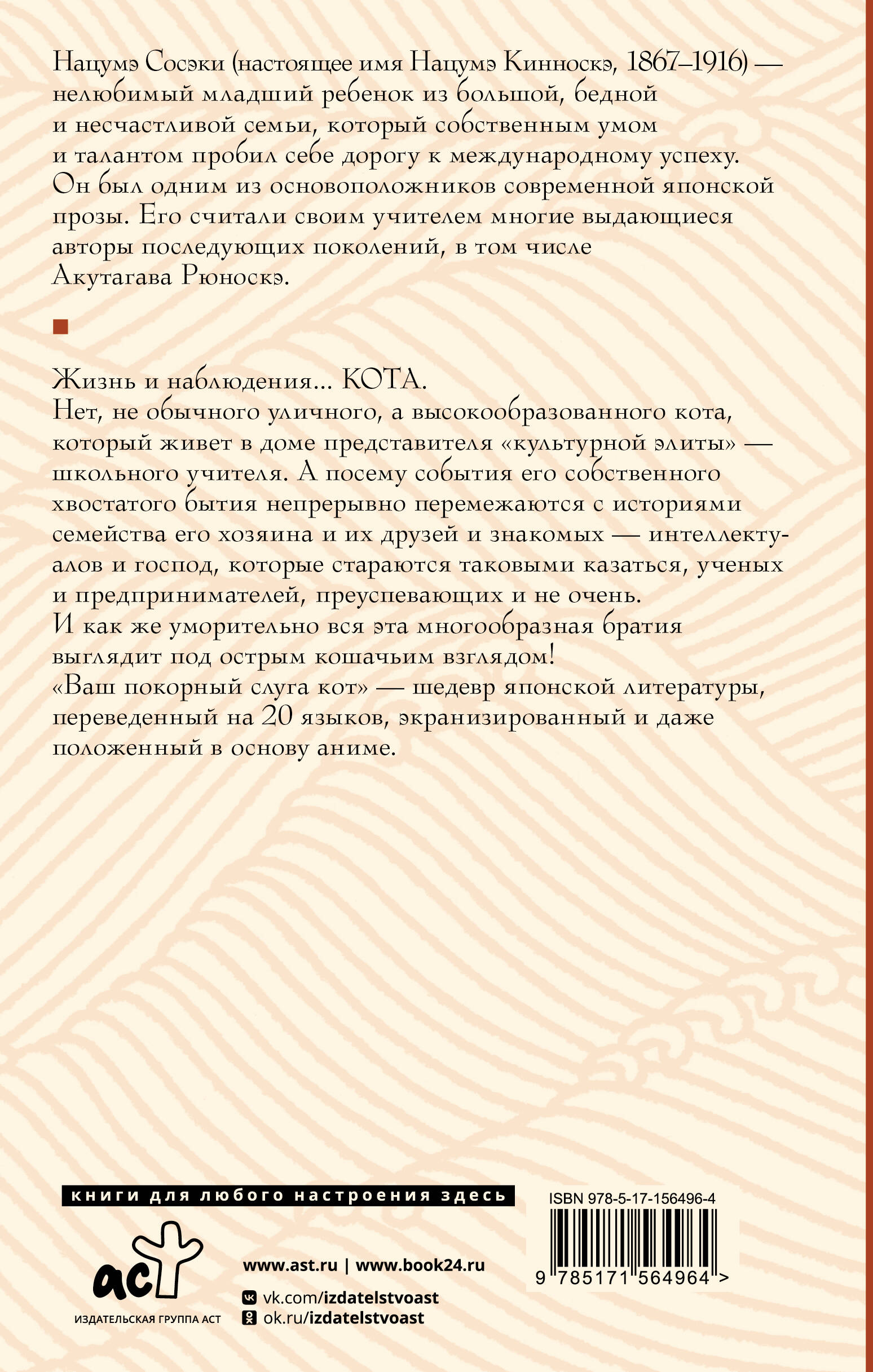 Жизнь и наблюдения… КОТА. Нет, не обычного уличного, а высокообразованного кота, который живет в доме представителя "культурной элиты" - школьного учителя. А посему события его собственного хвостатого бытия непрерывно перемежаются с историями семейства его хозяина и их друзей и знакомых - интеллектуалов и господ, которые стараются таковыми казаться, ученых и предпринимателей, преуспевающих и не очень. И как же уморительно вся эта многообразная братия выглядит под острым кошачьим взглядом! "Ваш покорный слуга кот" - шедевр японской литературы, переведенный на 20 языков, экранизированный и даже положенный в основу аниме.| Издательство | ИЗДАТЕЛЬСТВО "АСТ" |