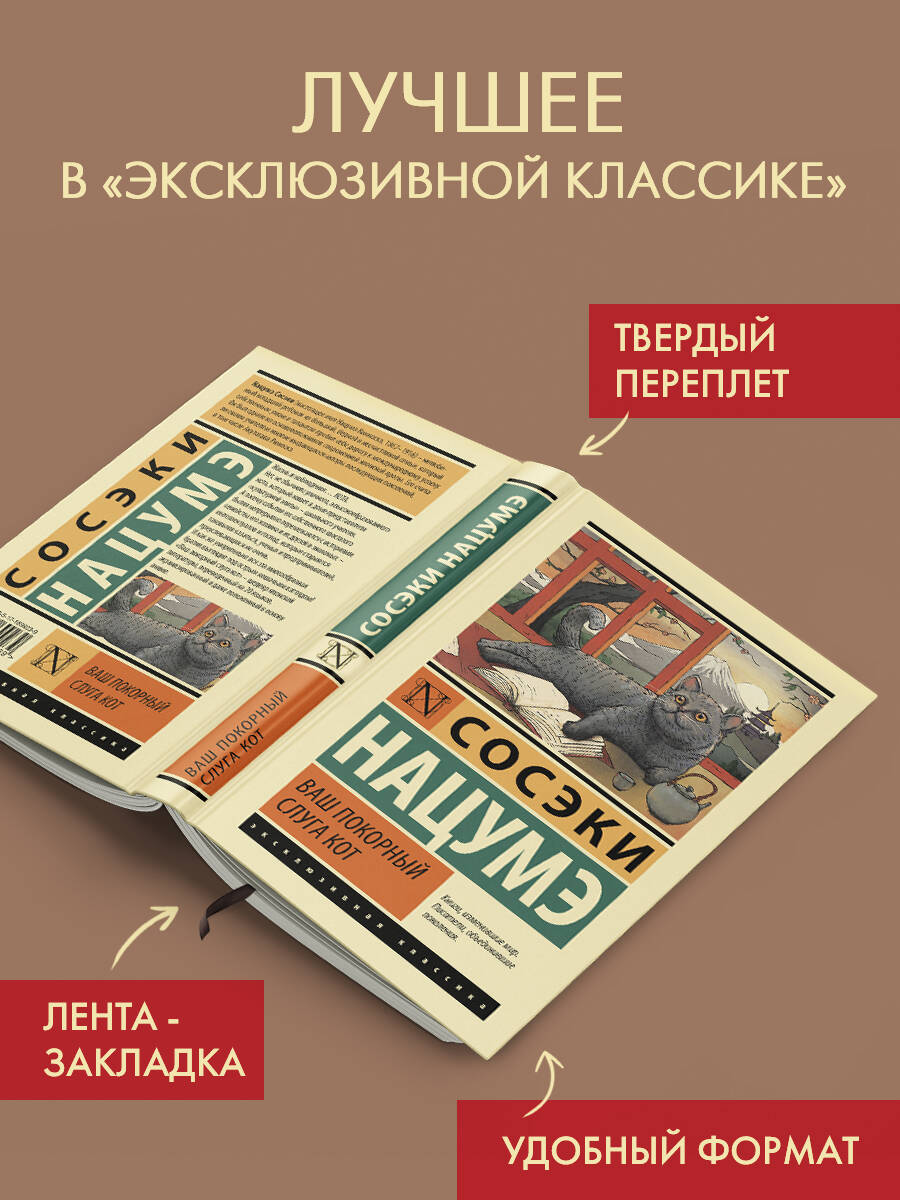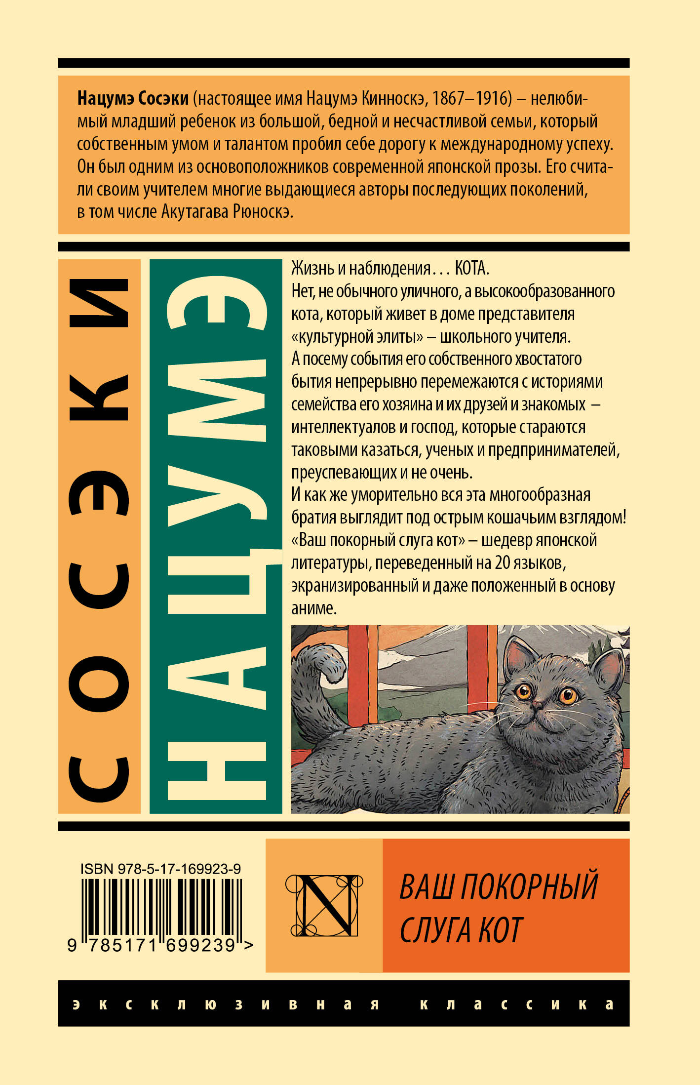 Жизнь и наблюдения… КОТА. Нет, не обычного уличного, а высокообразованного кота, который живет в доме представителя "культурной элиты" - школьного учителя. А посему события его собственного хвостатого бытия непрерывно перемежаются с историями семейства его хозяина и их друзей и знакомых - интеллектуалов и господ, которые стараются таковыми казаться, ученых и предпринимателей, преуспевающих и не очень. И как же уморительно вся эта многообразная братия выглядит под острым кошачьим взглядом! "Ваш покорный слуга кот" - шедевр японской литературы, переведенный на 20 языков, экранизированный и даже положенный в основу аниме.| Издательство | Издательство "АСТ" |