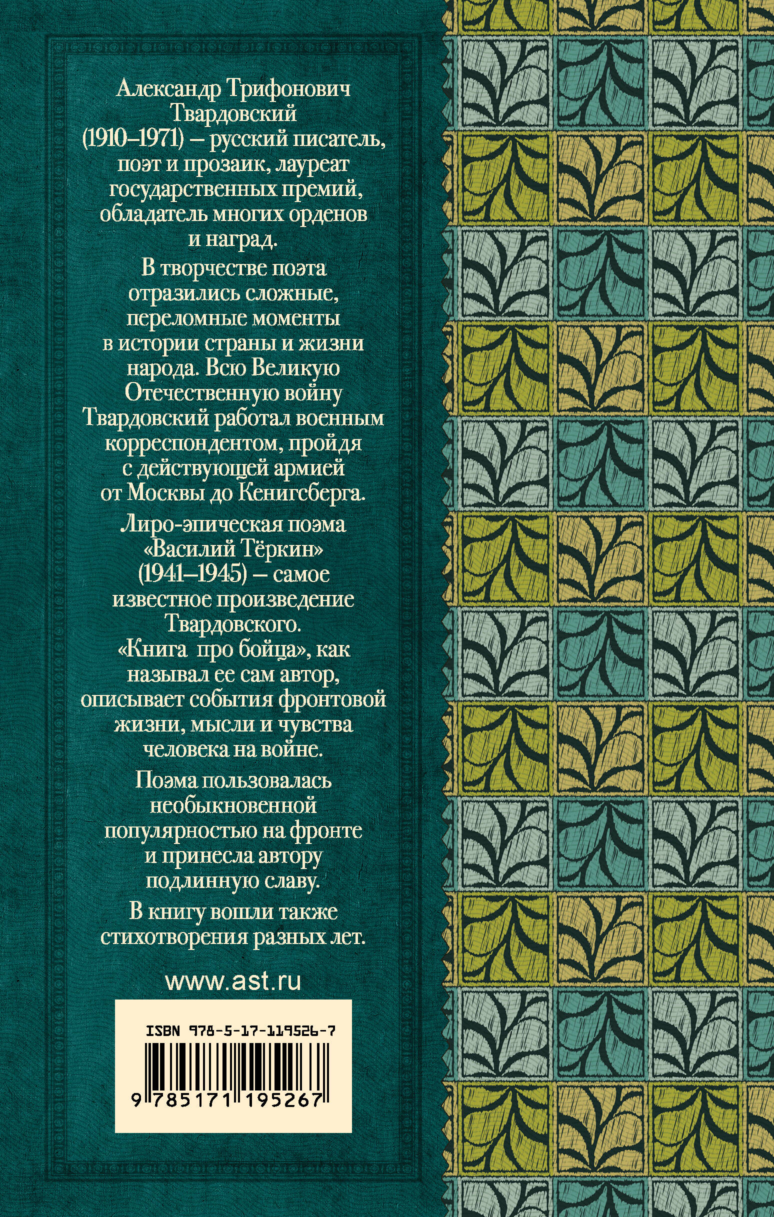 Александр Трифонович Твардовский (1910-1971) - русский писатель, поэт и прозаик, лауреат государственных премий, обладатель многих орденов и наград. В творчестве поэта отразились сложные, переломные моменты в истории страны и жизни народа. Всю Великую Отечественную войну Твардовский работал военным корреспондентом, пройдя с действующей армией от Москвы до Кенигсберга. Лиро-эпическая поэма «Василий Тёркин» (1941-1945) - самое известное произведение Твардовского. «Книга про бойца», как называл ее сам автор, описывает события фронтовой жизни, мысли и чувства человека на войне. Поэма пользовалась необыкновенной популярностью на фронте и принесла автору подлинную славу. В книгу вошли также стихотворения разных лет.