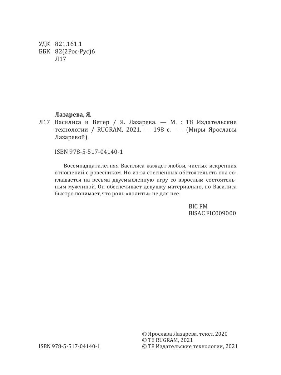Восемнадцатилетняя Василиса жаждет любви, чистых искренних отношений с ровесником. Но из-за стесненных обстоятельств она соглашается на весьма двусмысленную игру со взрослым состоятельным мужчиной. Он обеспечивает девушку материально, но Василиса быстро понимает, что роль «лолиты» не для нее.| Издательство | Т8 RUGRAM |