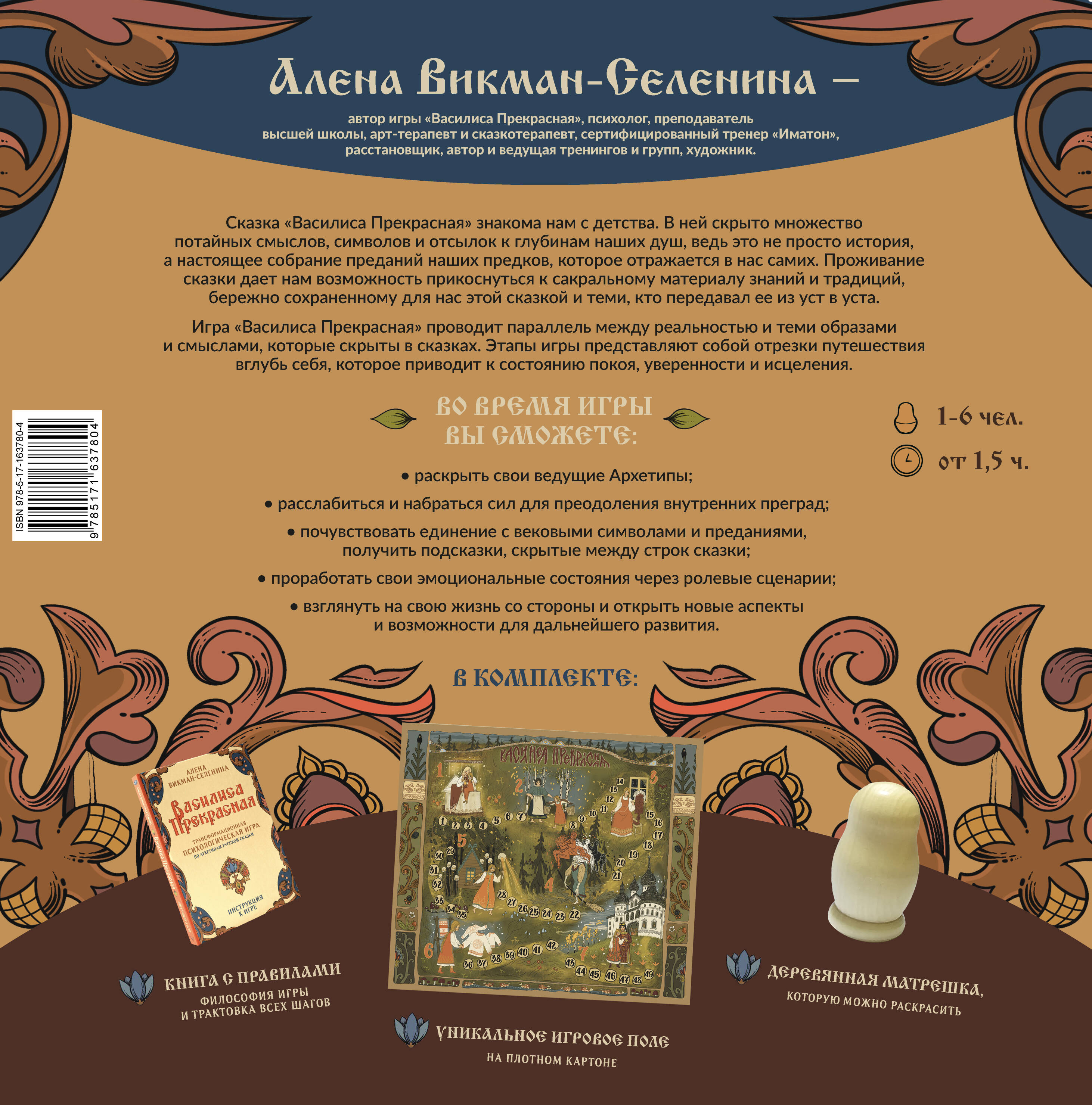Алена Викман-Селенина - психолог, преподаватель Высшей школы экономики, арт-терапевт и сказкотерапевт, расстановщик, автор и ведущая тренингов. Сказка "Василиса Прекрасная" знакома нам с детства. В ней скрыто множество потайных смыслов, символов и отсылок к глубинам наших душ, ведь это не просто история, а настоящее собрание преданий наших предков, которое отражается в нас самих. Проживание сказки дает нам возможность прикоснуться к сакральному материалу знаний и традиций, бережно сохраненному для нас этой сказкой и теми, кто передавал ее из уст в уста. Трансформационная игра "Василиса Прекрасная" проводит параллель между реальностью и теми образами и смыслами, которые скрыты в сказках. Этапы игры представляют собой отрезки путешествия вглубь себя, которое приводит к состоянию покоя, уверенности и исцеления. Во время игры вы сможете: • раскрыть свои ведущие Архетипы; • расслабиться и набраться сил для преодоления внутренних преград; • почувствовать единение с вековыми символами и преданиями, получить подсказки, скрытые между строк сказки; • проработать свои эмоциональные состояния через ролевые сценарии. В комплекте: • книга с правилами; • уникальное игровое поле на плотном картоне; • деревянная матрешка, которую можно раскрасить!| Издательство | Издательство "АСТ" |
