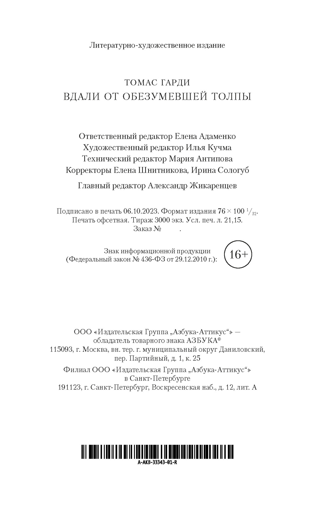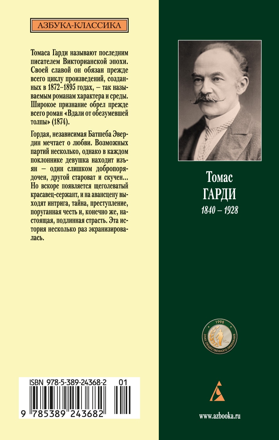 Томаса Гарди (1840-1928) называют последним писателем Викторианской эпохи. Своей славой он обязан прежде всего циклу произведений, созданных в 1872-1895 годах, - так называемым романам характера и среды. Широкое признание обрел прежде всего роман «Вдали от обезумевшей толпы» (1874). Гордая, независимая Батшеба Эвердин мечтает о любви. Возможных партий несколько, однако в каждом поклоннике девушка находит изъян - один слишком добропорядочен, другой староват и скучен... Но вскоре появляется щеголеватый красавец-сержант, и на авансцену выходят интрига, тайна, преступление, поруганная честь и, конечно же, настоящая, подлинная страсть. Эта история несколько раз экранизировалась.| Издательство | Азбука |