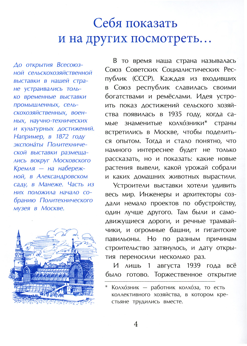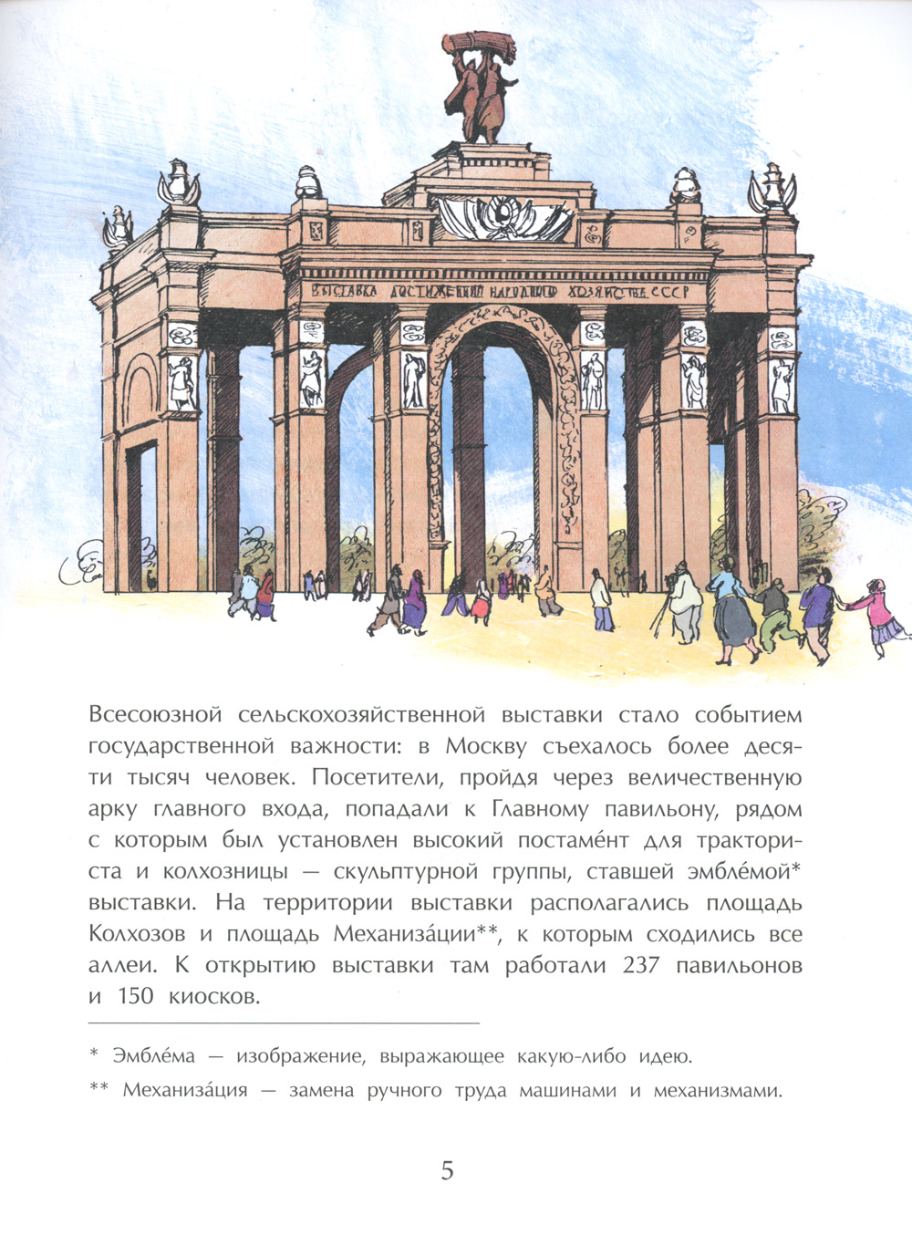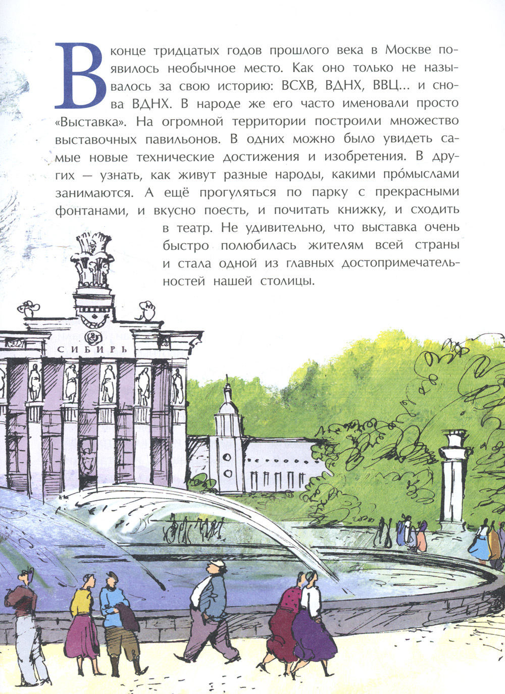 Скульптура «Рабочий и колхозница», Зелёный театр, сказочной красоты фонтаны... ВДНХ - не только замечательный парк. В павильонах этой легендарной выставки всегда можно было увидеть самые новые технические достижения и изобретения, узнать, как живут разные народы. Яркие страницы истории «выставки чудес» - тема этой книги.| Издательство | Настя и Никита |