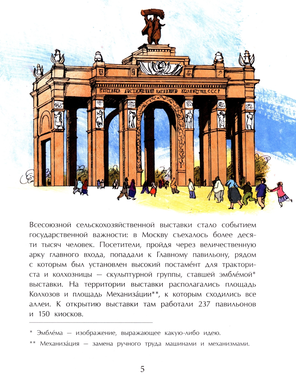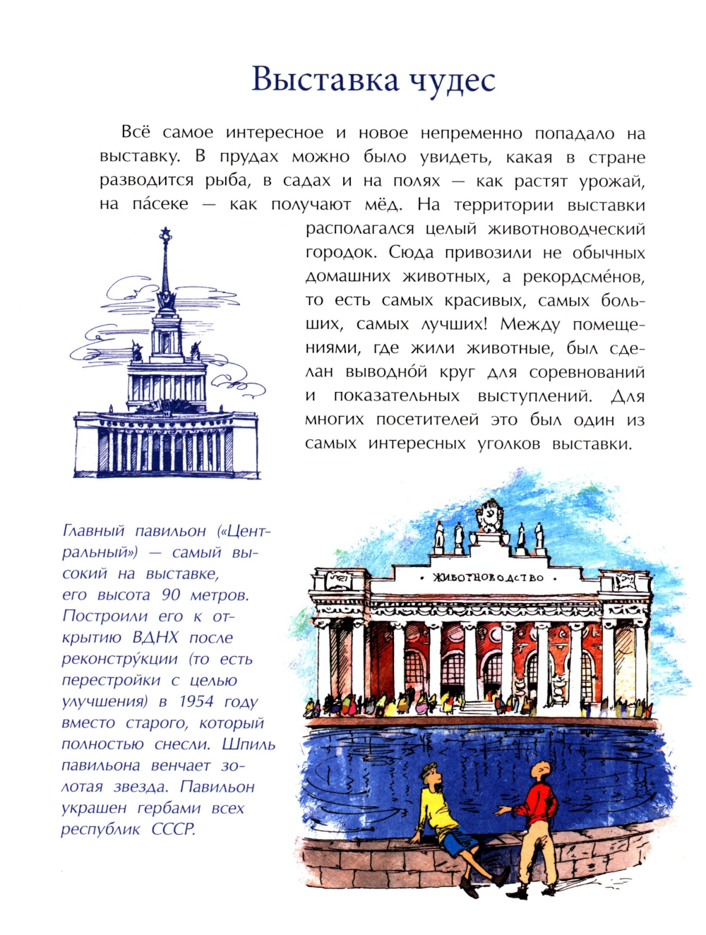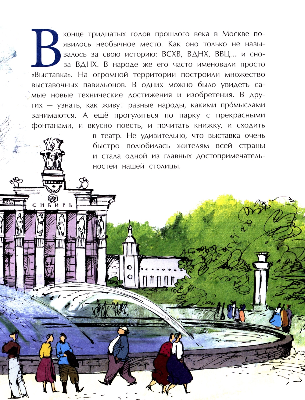 Скульптура «Рабочий и колхозница», Зелёный театр, сказочной красоты фонтаны... ВДНХ - не только замечательный парк. В павильонах этой легендарной выставки всегда можно было увидеть самые новые технические достижения и изобретения, узнать, как живут разные народы. Яркие страницы истории «выставки чудес» - тема этой книги.| Издательство | Настя и Никита |