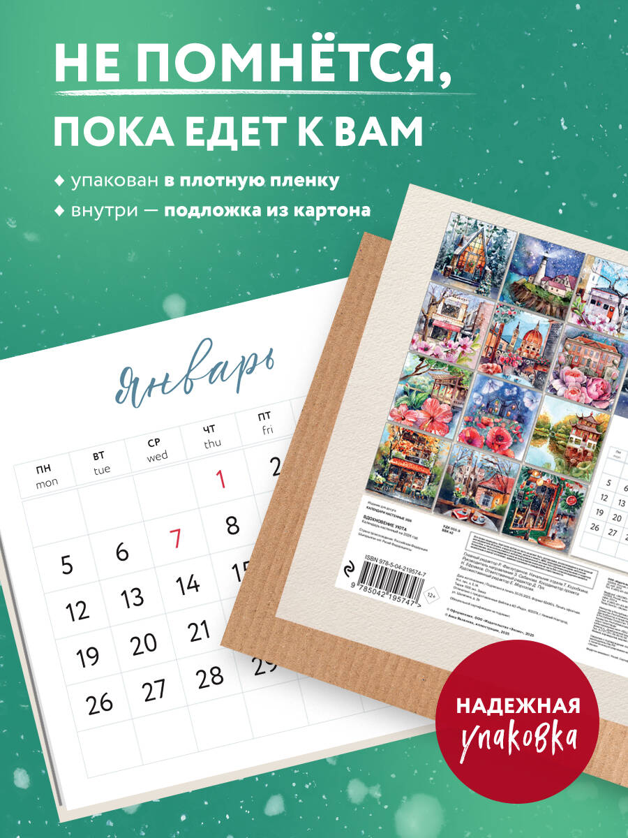 О календаре: Этот календарь - как путешествие без билетов, наполненное красками, вдохновением и атмосферой маленьких радостей. Каждый месяц вас ждет новая акварельная история: уютные домики, живописные улочки и теплые пейзажи со всего света авторства чудесной ANAYAKOO (13 тысяч подписчиков). В крупной минималистичной сетке календаря удобно записывать планы на месяц, отмечать важные дни. Удобный формат 170х170 мм позволит повесить его абсолютно везде. Подарите себе или близкому путешествие в счастье! О серии: Наши настенные календари отличаются высоким качеством исполнения! Тщательно подобранные иллюстрации, напечатанные на глянцевой бумаге высочайшего качества, станут настоящим украшением дома, а в календарной сетке найдется место для ваших планов: большие клетки позволят делать записи и организовать свой год! В календаре также отмечены все государственные праздники. В серии настенных календарей издательства «ЭКСМО» каждый найдет тему по вкусу: великие художники, великолепные подборки с самыми знаменитыми произведениями искусства, легендарные кинематографические саги и игры, главные книжные авторы и бестселлеры, фотографии и иллюстрации любимых животных и многое-многое другое! Технические параметры: • Тип календаря - настенный перекидной. • Год - 2026. • Календарная сетка - с разбивкой по месяцам. • Вид скрепления - скрепка. • Ширина - 17 см. • Высота - 17 см. • Внутренний блок - мелованная бумага 130 г/м2. • Подложка - плотный гофрокартон для поддержания формы. • Индивидуальная упаковка в плотный целлофановый пакет.| Издательство | ООО "Издательство "Эксмо" |