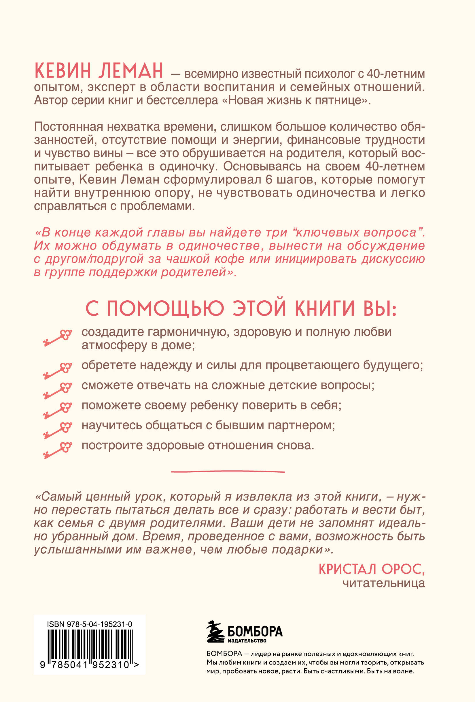 Постоянная нехватка времени, слишком большое количество обязанностей, отсутствие помощи и энергии, финансовые трудности и чувство вины - все это обрушивается на родителя, который воспитывает ребенка в одиночку. Основываясь на своем 40-летнем опыте, Кевин Леман, всемирно известный психолог, эксперт в области воспитания и семейных отношений, сформулировал 6 шагов, которые помогут найти внутреннюю опору, не чувствовать одиночества и легко справляться с проблемами. «В конце каждой главы вы найдете три "Ключевых вопроса". Их можно обдумать в одиночестве, вынести на обсуждение с другом/подругой за чашкой кофе или инициировать дискуссию в группе поддержки родителей». С ПОМОЩЬЮ ЭТОЙ КНИГИ ВЫ: - создадите гармоничную, здоровую и полную любви атмосферу в доме; - обретете надежду и силы для процветающего будущего; - сможете отвечать на сложные детские вопросы; - поможете своему ребенку поверить в себя; - научитесь общаться с бывшим партнером; - построите здоровые отношения снова. Об авторе Кевин Леман - всемирно известный психолог с 40-летним опытом, эксперт в области воспитания и создания семьи. Автор популярной серии книг и бестселлера «Новая жизнь к пятнице».| Издательство | ООО "Издательство "Эксмо" |