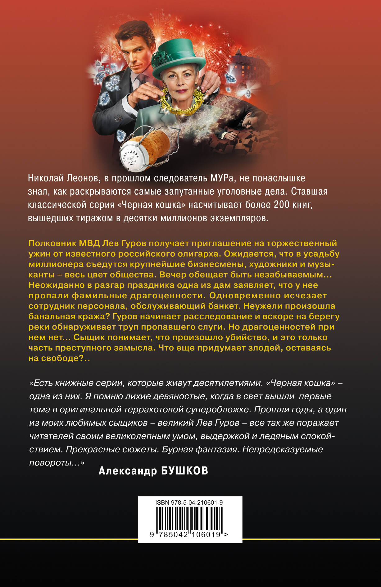 Легендарный детективный тандем Леонов-Макеев. Полковник МВД Лев Гуров получает приглашение на торжественный ужин от известного российского олигарха. Ожидается, что в усадьбу миллионера съедутся крупнейшие бизнесмены, художники и музыканты - весь цвет общества. Вечер обещает быть незабываемым… Неожиданно в разгар праздника одна из дам заявляет, что у нее пропали фамильные драгоценности. Одновременно исчезает сотрудник персонала, обслуживающий банкет. Неужели произошла банальная кража? Гуров начинает расследование и вскоре на берегу реки обнаруживает труп пропавшего слуги. Но драгоценностей при нем нет… Сыщик понимает, что произошло убийство, и это только часть преступного замысла. Что еще придумает злодей, оставаясь на свободе?.. Николай Леонов, в прошлом следователь МУРа, не понаслышке знал, как раскрываются самые запутанные уголовные дела. Поэтому каждая его книга - это правдивая захватывающая история с непредсказуемой интригой и неожиданным финалом. Главный герой этих книг, полковник Лев Гуров - сыщик высокого класса, к тому же с массой положительных человеческих качеств. Его уважают друзья, боятся враги и любят женщины. Он - настоящий отечественный супермен. Романы о Льве Гурове вот уже сорок лет неизменно привлекают поклонников отечественного детектива. Ставшая классической серия «Черная кошка» насчитывает более 200 книг, вышедших тиражом в десятки миллионов экземпляров.| Издательство | ООО "Издательство "Эксмо" |