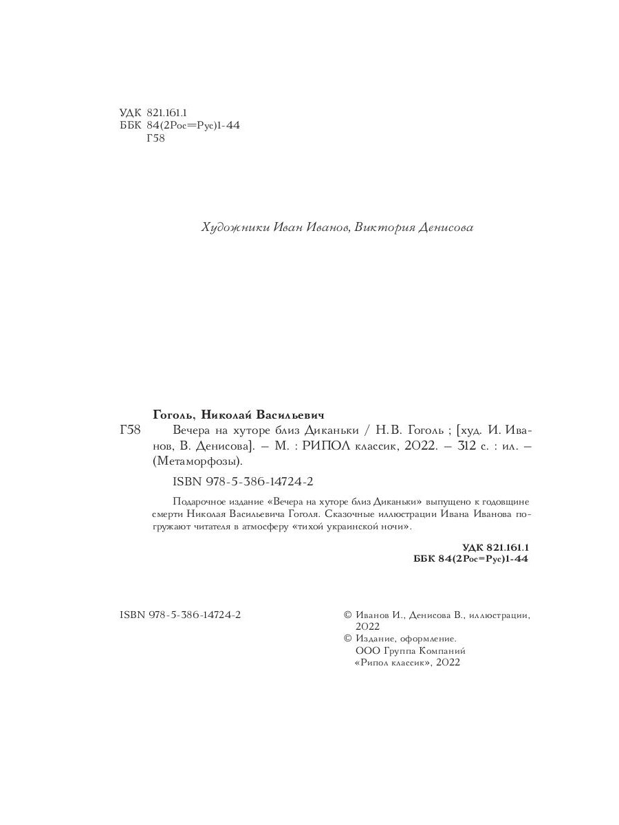 Подарочное издание «Вечера на хуторе близ Диканьки» выпущено к годовщине смерти Николая Васильевича Гоголя. Сказочные иллюстрации Ивана Иванова погружают читателя в атмосферу «тихой украинской ночи».| Издательство | Рипол Классик |