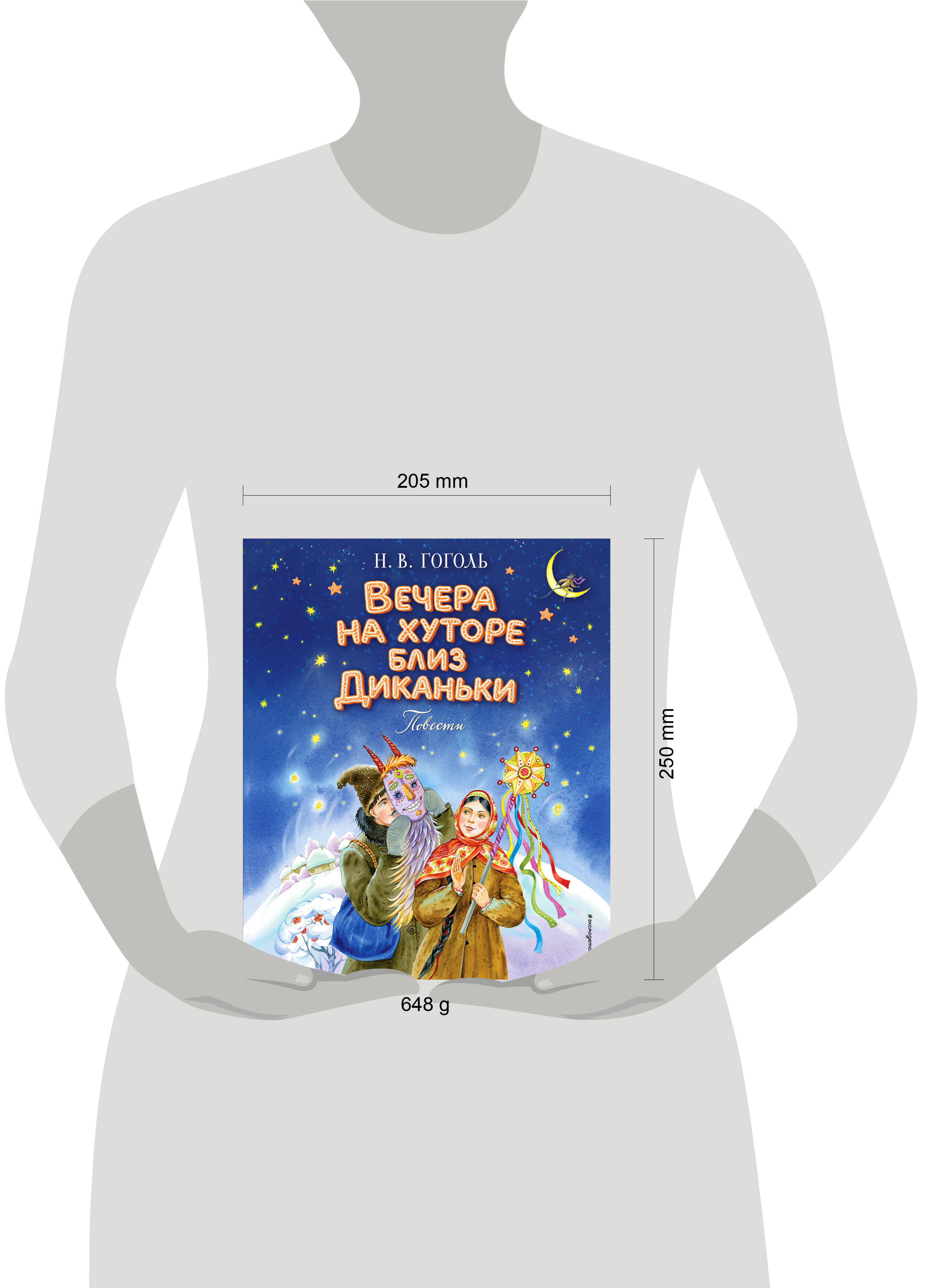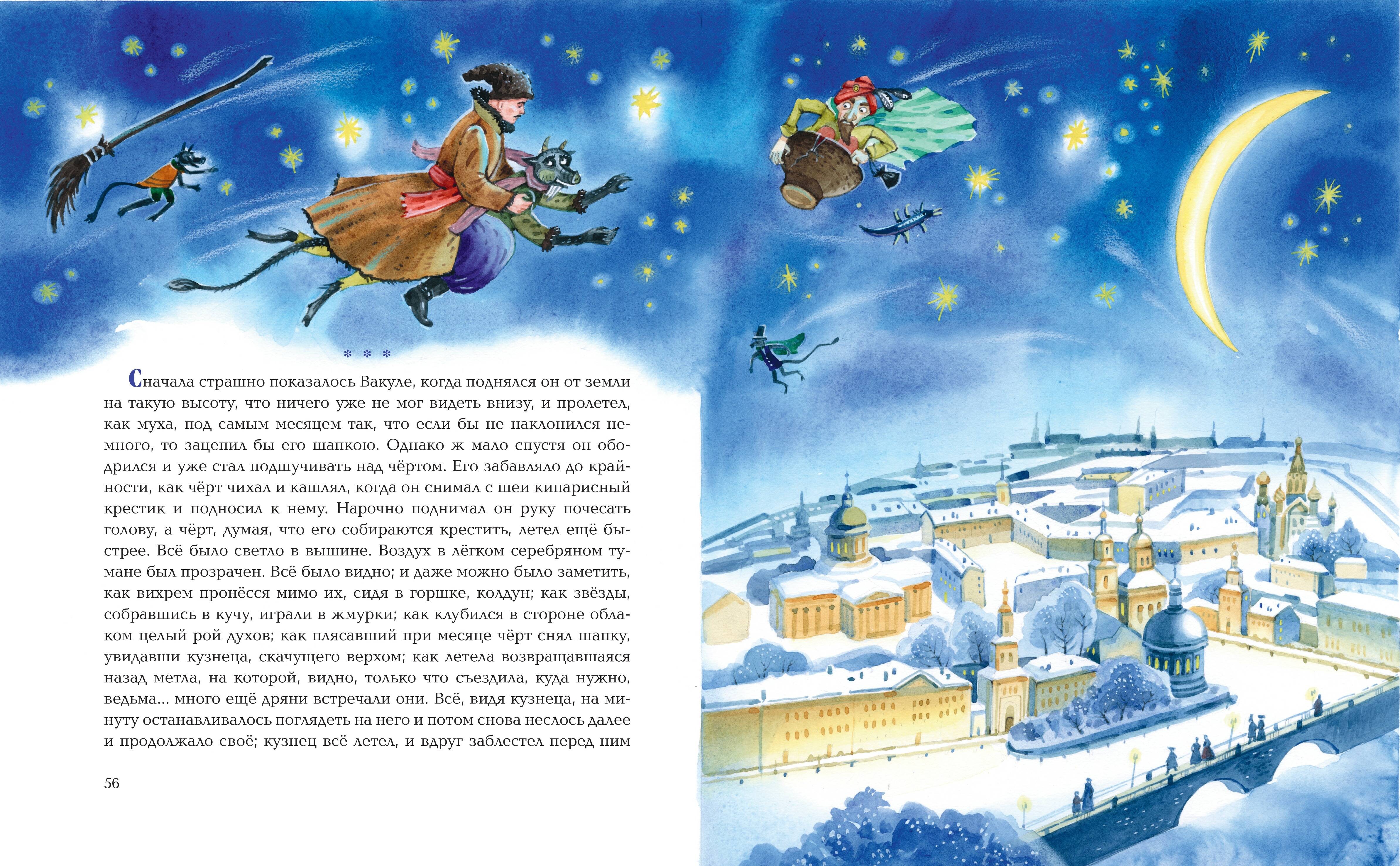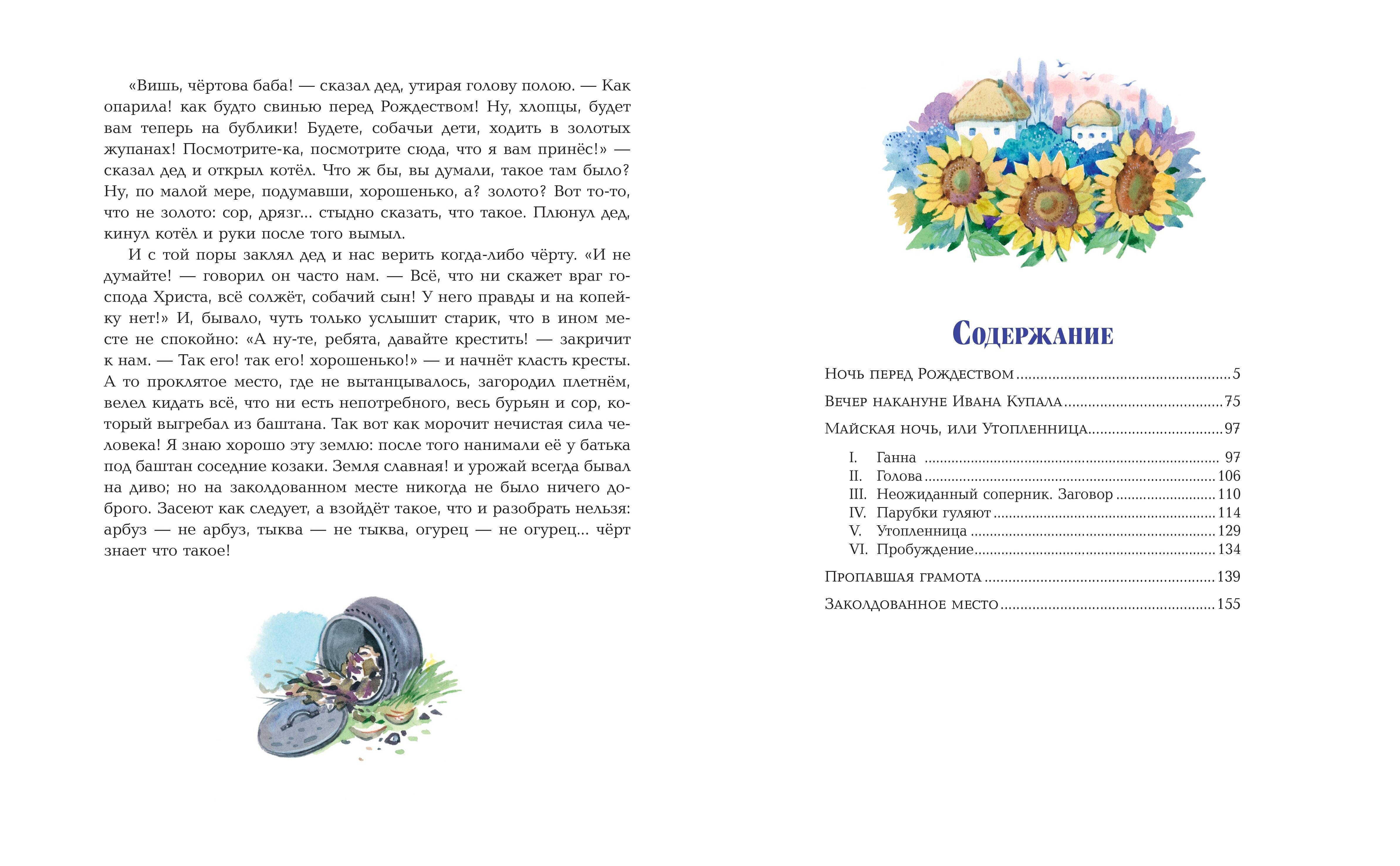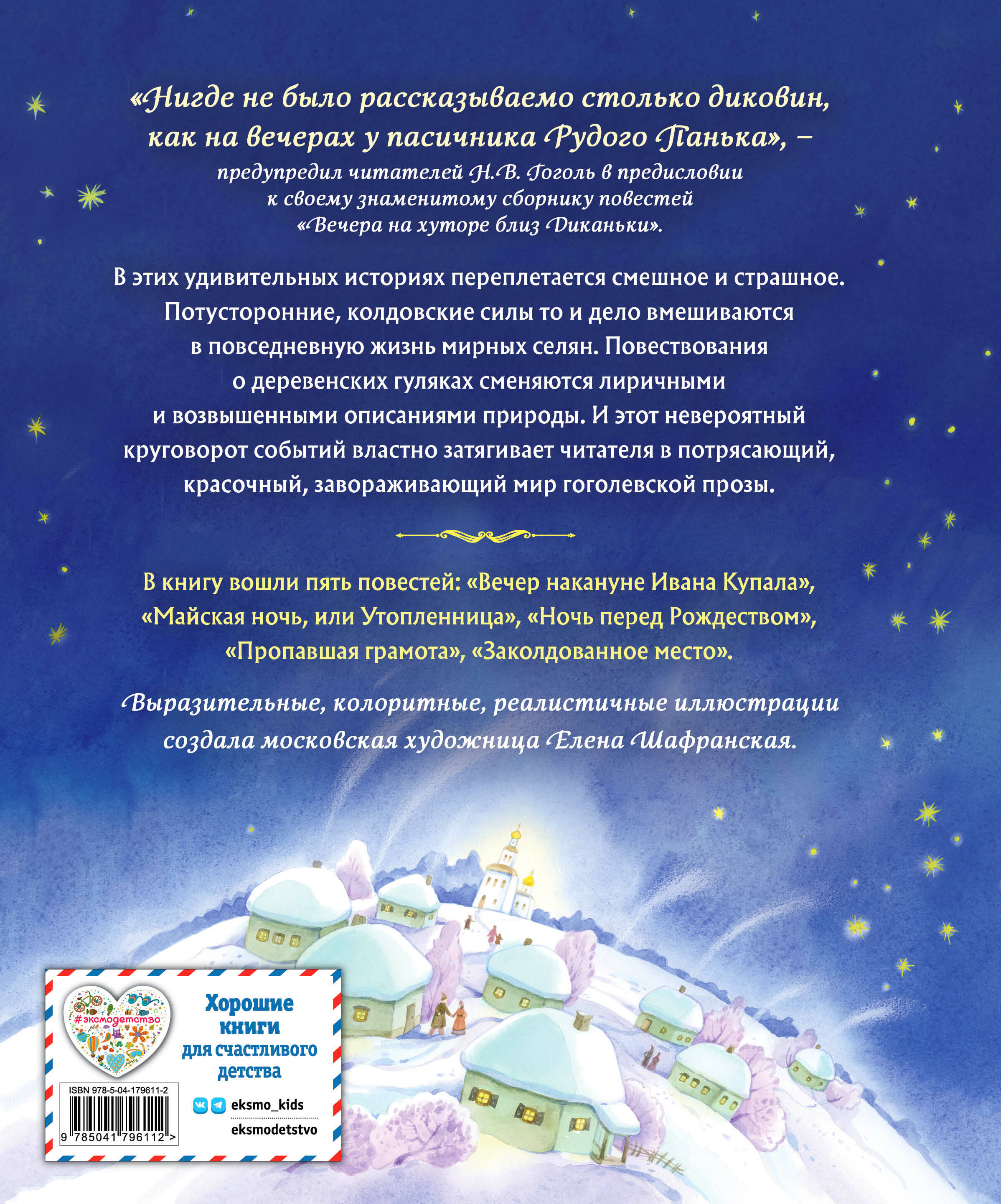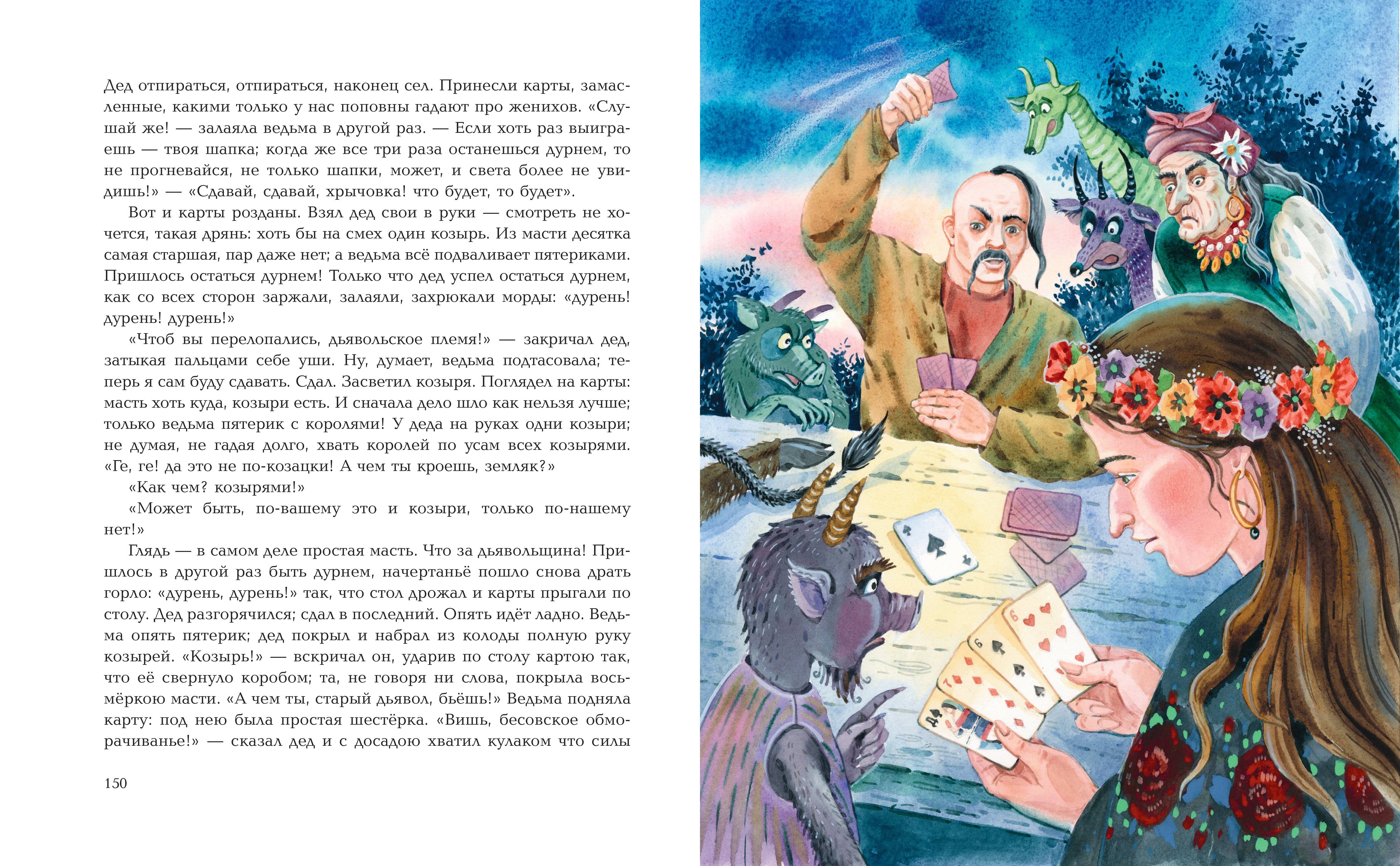 Подарочный формат. Твердый переплет с выпуклыми элементами и частичным лаком. Оригинальное, праздничное оформление. Плотная бумага. Четкий крупный шрифт. Полноцветные иллюстрации. В книгу вошли пять повестей Н. В. Гоголя из всемирно известного сборника «Вечера на хуторе близ Диканьки»: «Ночь перед Рождеством», «Вечер накануне Ивана Купала», «Майская ночь, или Утопленница», «Пропавшая грамота», «Заколдованное место». Увлекательные истории, наполненные захватывающими, мистическим событиями, то предостерегают читателя от общения с ведьмами и колдунами, то заставляют хохотать над проделками удалых молодцев, лихо одурачивающих нечистую силу. А невезучего ухажера-черта, вынужденного возить на себе дюжего кузнеца, порой становится даже жалко. Остроумные, лиричные повести Н. В. Гоголя неоднократно становились литературной основой для кинолент и мультфильмов, аудиоспектаклей и мюзиклов. Сочный колорит старинных преданий, поэтичные описания природы, выразительные образы героев великолепно отражены в ярких, стильных, реалистичных иллюстрациях московской художницы Елены Шафранской.