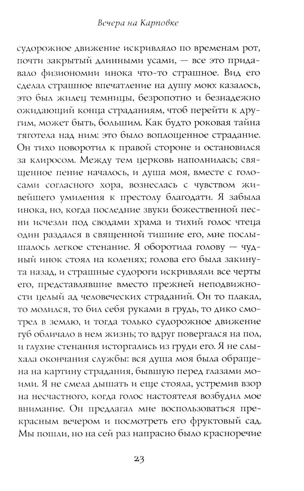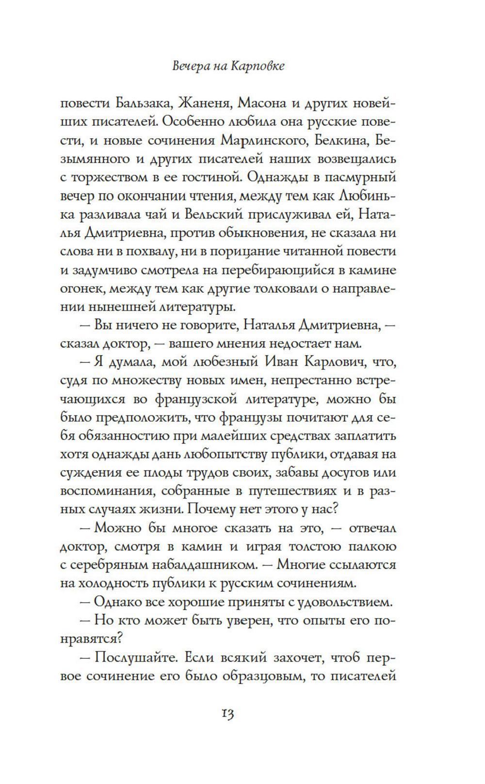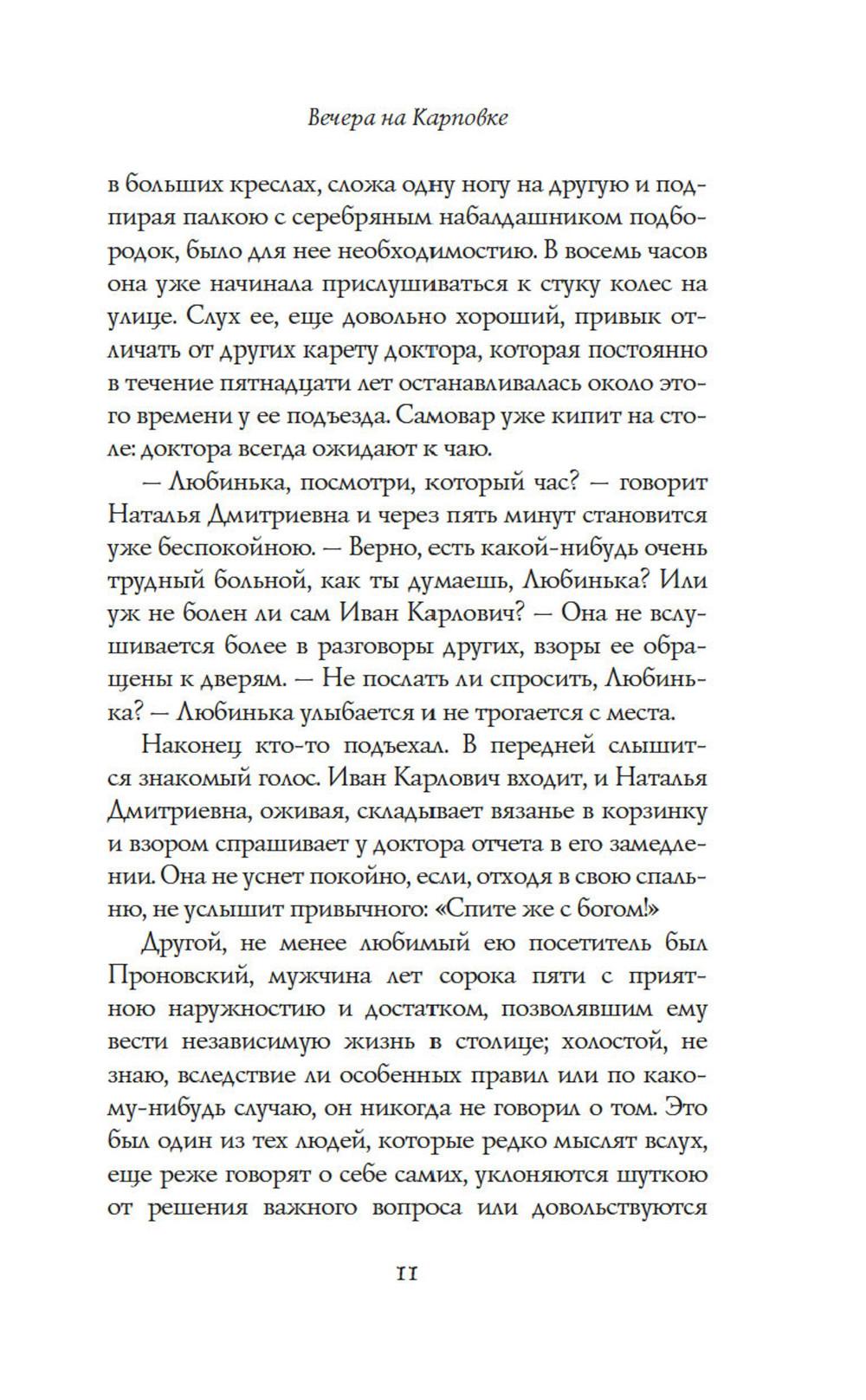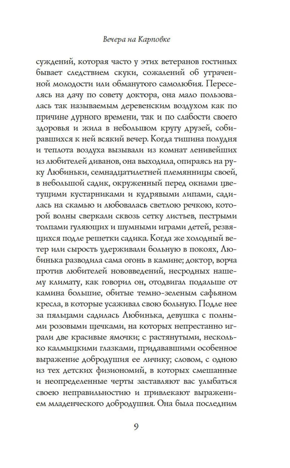 Дождливым петербургским летом юная Любинька скучает на даче своей тетушки Натальи Дмитриевны. Единственная радость у Любиньки - вечерние посиделки дачного общества. Ведь среди присутствующих он, герой ее девичьих грез, артиллерийский офицер Вельский. Вот только вряд ли тетушка даст свое согласие на этот брак: племянница достойна куда более выгодной партии. Однажды гости Натальи Дмитриевны решают сочинить по повести и прочитать их для друзей. И вот уже Любинька с упоением слушает про гордых купчих, несчастных бесприданниц, блестящих аристократок. Уходит скука, а вместе с ней и страх, и Любинька наконец-то понимает, что она готова на все, чтобы быть с Вельским. Книга «Вечера на Карповке», словно забытая шкатулка с чудными украшениями, окажется прекрасной находкой для мечтательных, но решительных барышень.| Издательство | Азбука |