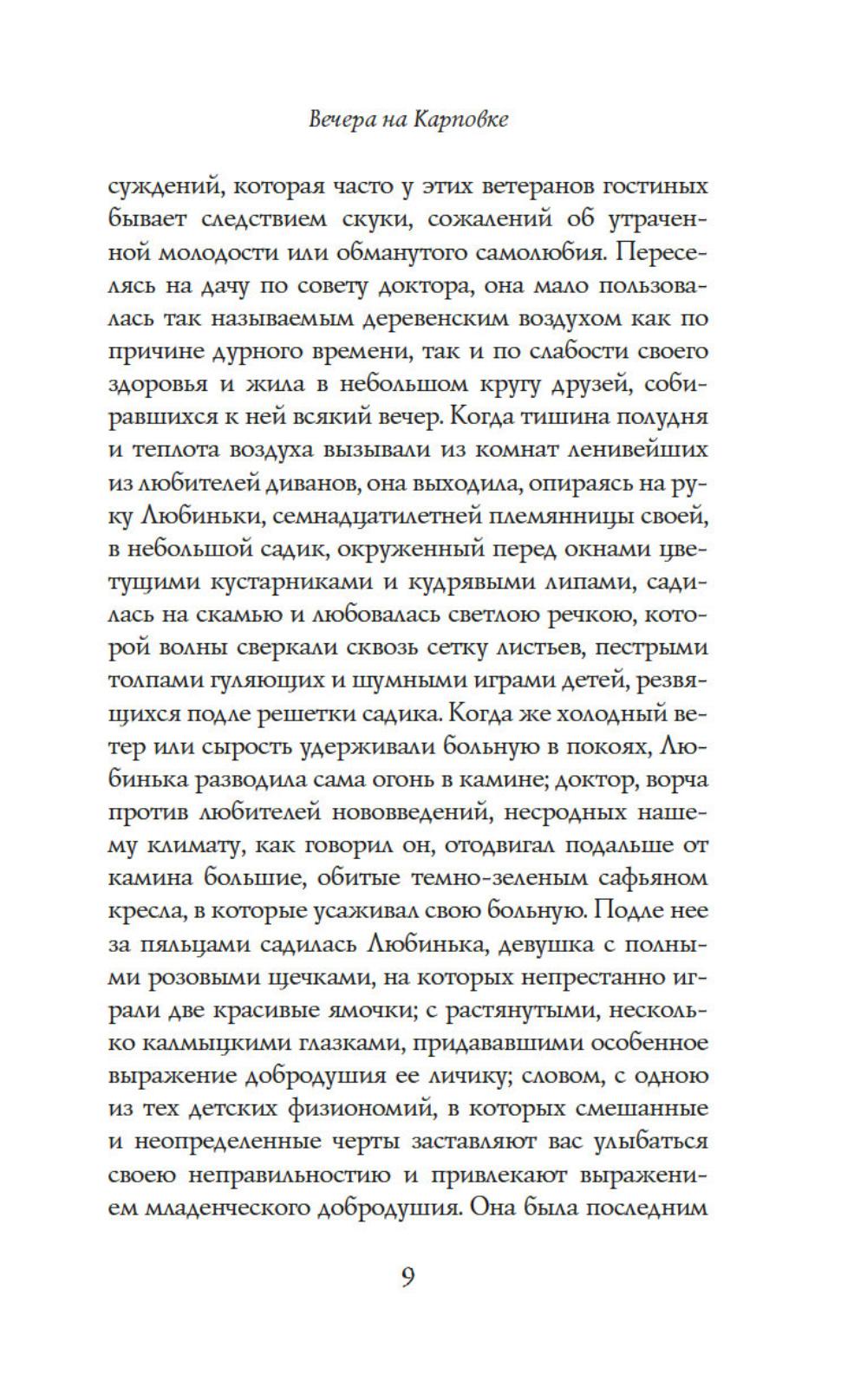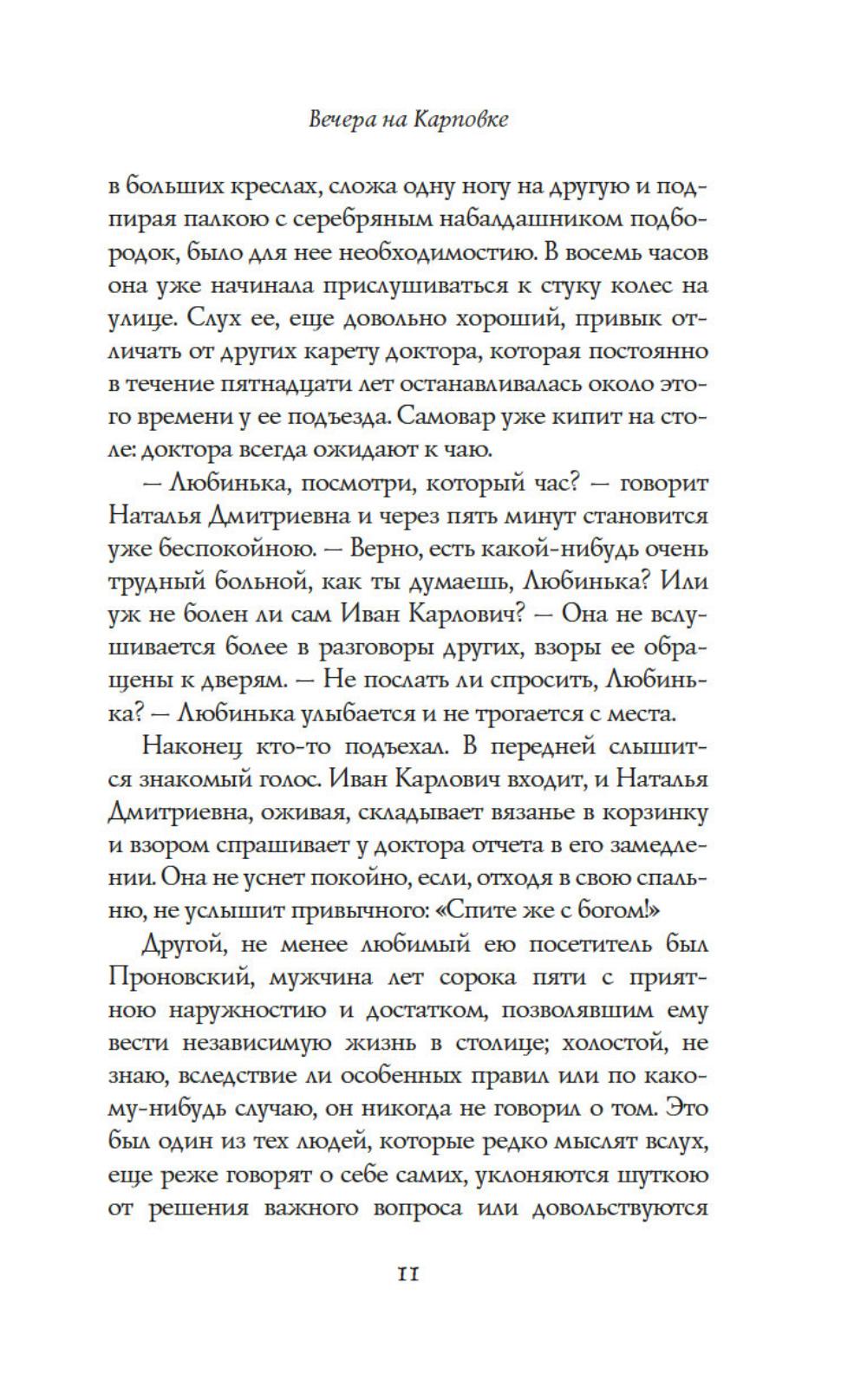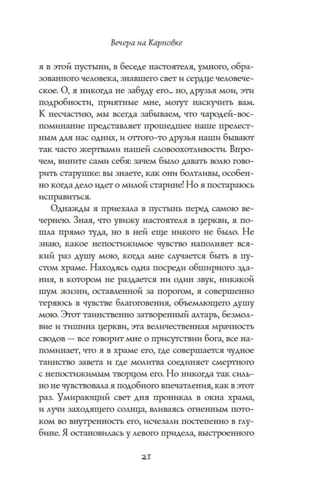 Петербург. Белые ночи. Дачи на реке Карповке. В доме почтенной старушки Натальи Дмитриевны часто собирается небольшой кружок, коротающий дождливые вечера за чтением, музыкой, разговорами. Однажды после спора о литературе они решают сочинить по повести, основанной на своих воспоминаниях, и предоставить эти повести на суд общества. Перед скучающими дачниками проносятся истории о балах и интригах большого света, купеческих семьях, тишине монастырских келий и первой любви в тени цветущей дворянской усадьбы. Но непременно в центре каждой из этих историй - женщина, с ее интересами и мечтаниями, любовью и страхами, запретами и желаниями. Книга «Вечера на Карповке», словно забытая шкатулка с чудными украшениями, окажется прекрасной находкой для мечтательных, но решительных барышень.| Издательство | Азбука |