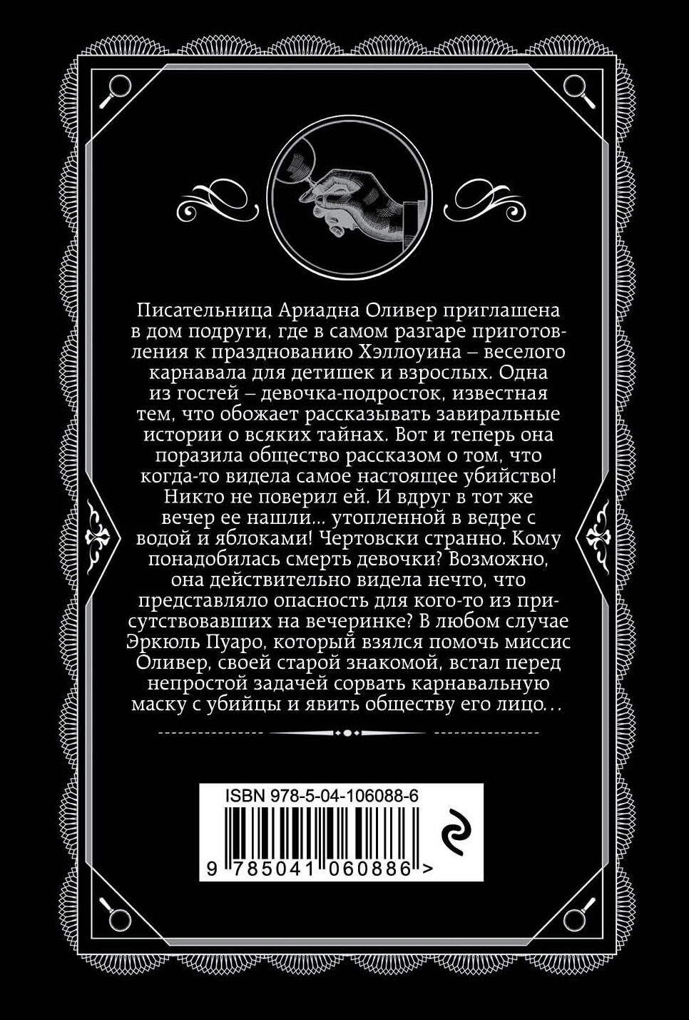 Агата Кристи - самый публикуемый автор всех времен и народов после Шекспира. Тиражи ее книг уступают только тиражам его произведений и Библии. В мире продано больше миллиарда книг Кристи на английском языке и столько же - на других языках. Она автор восьмидесяти детективных романов и сборников рассказов, двадцати пьес, двух книг воспоминаний и шести психологических романов, написанных под псевдонимом Мэри Уэстмакотт. Ее персонажи Эркюль Пуаро и мисс Марпл навсегда стали образцовыми героями остросюжетного жанра. Эта мрачная, зловещая книга была посвящена Агатой Кристи известному британскому юмористу, автору рассказов о Дживсе и Вустере П.Г. Вудхаузу. В частности, в посвящении содержалась благодарность за то, что «он был так добр, говоря, что ему нравятся мои книги». Писательница Ариадна Оливер приглашена в дом подруги, где в самом разгаре приготовления к празднованию Хэллоуина - веселого карнавала для детишек и взрослых. Одна из гостей - девочка-подросток, известная тем, что обожает рассказывать завиральные истории о всяких тайнах. Вот и теперь она поразила общество рассказом о том, что когда-то видела самое настоящее убийство! Никто не поверил ей. И вдруг в тот же вечер ее нашли... утопленной в ведре с водой и яблоками! Чертовски странно. Кому понадобилась смерть девочки? Возможно, она действительно видела нечто, что представляло опасность для кого-то из присутствовавших на вечеринке? В любом случае, Эркюль Пуаро, который взялся помочь миссис Оливер, своей старой знакомой, встал перед непростой задачей сорвать карнавальную маску с убийцы и явить обществу его лицо… -------------------------------------------------- «Несомненно, она гений». - Элизабет Джордж, автор бестселлеров New York Times «Общепринято считать Кристи блестящим мастером острого сюжета. Однако она представляет собой нечто гораздо более значительное». - The Guardian «Если речь о драме с убийством - здесь нет никого изобретательней Кристи». - Sunday Times «Миссис Кристи делает невозможную историю абсолютно реальной». - The Times «…Я до сих пор обожаю романы Кристи». - Луиза Пенни «Читать роман Кристи - словно вгрызаться в спелое яблоко: чистейшее, хрустящее и абсолютное удовлетворение…» - Тана Френч