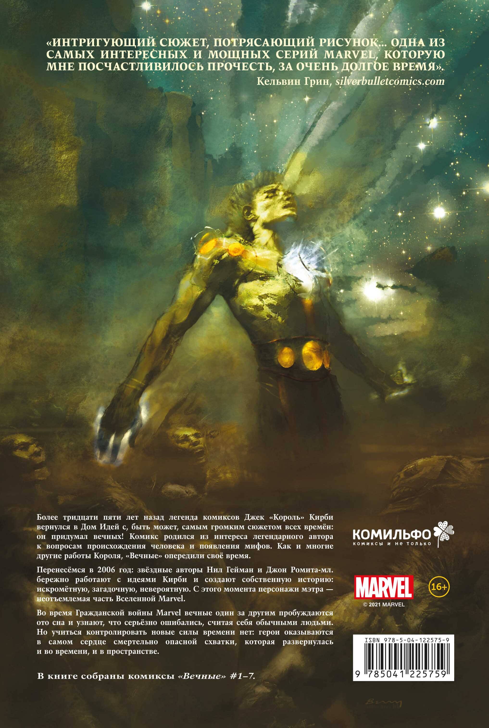 Более тридцати пяти лет назад легенда комиксов Джек «Король» Кирби вернулся в Дом Идей с, быть может, самым громким сюжетом всех времён: он придумал Вечных! Комикс родился из интереса легендарного автора к вопросам происхождения человека и появления мифов. Как и многие другие работы Короля, «Вечные» опередили своё время. Перенесёмся в 2006 год: звёздные авторы Нил Гейман и Джон Ромита-мл. бережно работают с идеями Кирби и создают собственную историю: искромётную, загадочную, невероятную. С этого момента персонажи мэтра неотъемлемая часть Вселенной Marvel. Во время Гражданской войны Marvel Вечные один за другим пробуждаются ото сна и узнают, что серьёзно ошибались, считая себя обычными людьми. Но учиться контролировать новые силы времени нет: герои оказываются в самом сердце смертельно опасной схватки, которая развернулась и во времени, и в пространстве. В книге собраны комиксы «Вечные» #1-7. «Интригующий сюжет, потрясающий рисунок... Одна из самых интересных и мощных серий Marvel, которую мне посчастливилось прочесть, за очень долгое время». Кельвин Грин| Издательство | ООО "Издательство "Эксмо" |