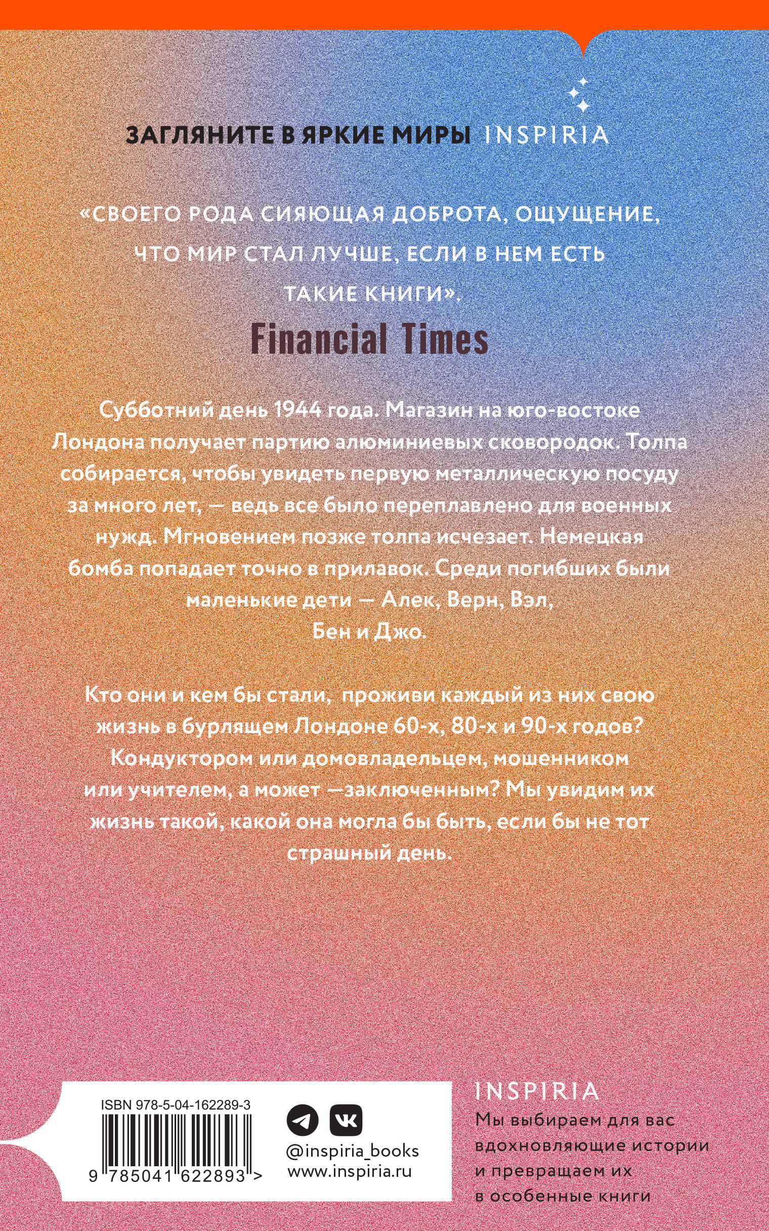 «Спаффорд заставляет своих персонажей резонировать с повседневным чудом того, что значит быть человеком, затронутым как злом, так и добром». - The Spectator Субботний день 1944 года. Магазин на юго-востоке Лондона получает партию алюминиевых сковородок. Толпа собирается, чтобы увидеть первую металлическую посуду за много лет - в конце концов, все было переплавлено для военных нужд. Мгновением позже толпа исчезла. Немецкая бомба попадает точно в прилавок. Среди покупателей было пятеро маленьких детей - Алек, Верн, Вэл, Бен и Джо. Кто они? Какое будущее они потеряли? Этот блестяще сконструированный роман о том, что «могло бы быть», проживи каждый из них свою жизнь в бурлящем Лондоне в 60-е, 80-е и 90-е годы двадцатого века. Их повседневные драмы в роли сыновей и дочерей, супругов, родителей, бабушек и дедушек. Кто стал бы кондуктором или домовладельцем, мошенником, учителем или заключенным? «Явись, другое будущее. Явись, милосердие, вовремя не проявленное. Явись, знание, вовремя не полученное. Явитесь, другие возможности. Явитесь, непотревоженные глубины. Явись, неделимый свет».| Издательство | ООО "Издательство "Эксмо" |