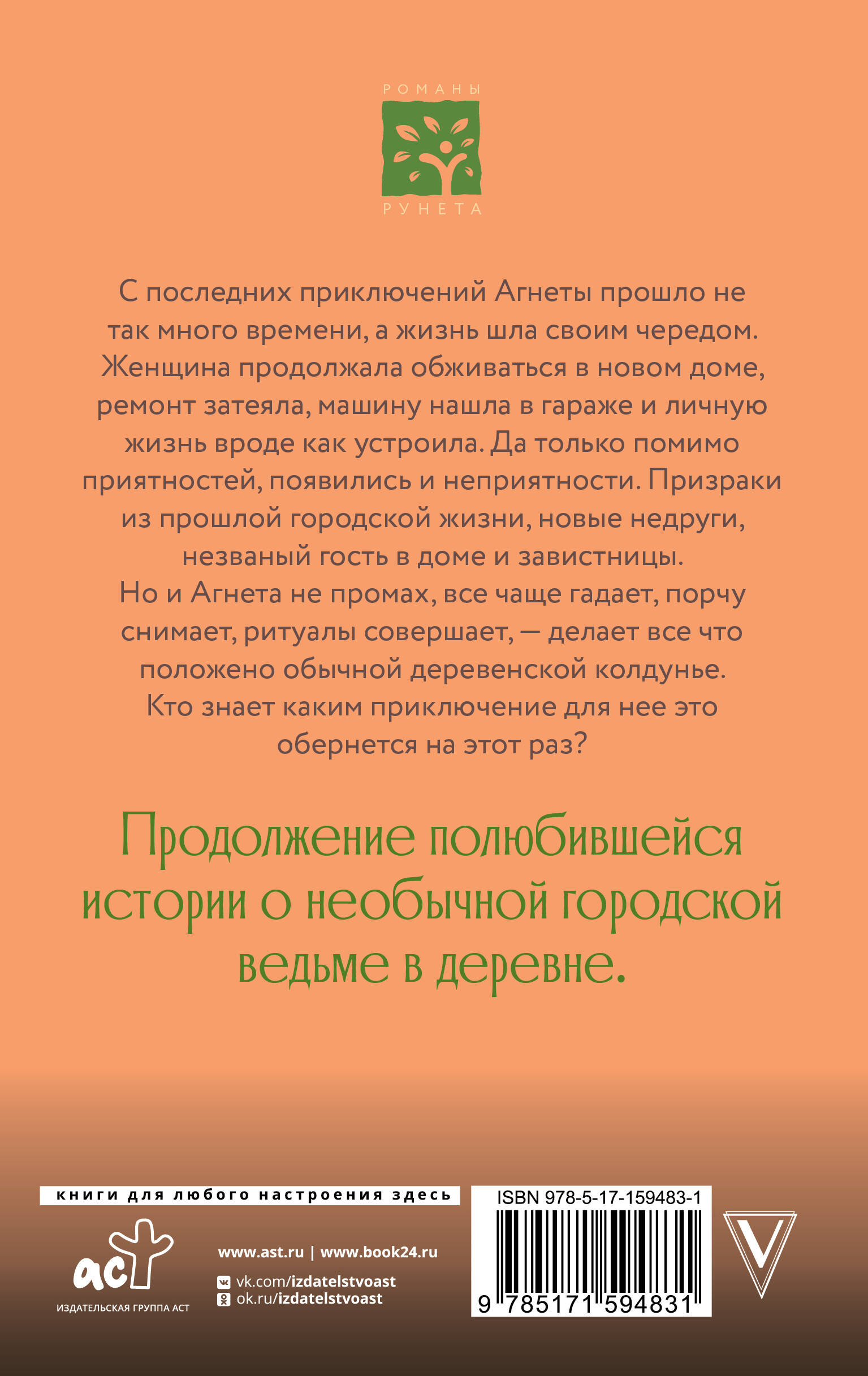 С последних приключений Агнеты прошло не так много времени, а жизнь шла своим чередом. Женщина продолжала обживаться в новом доме, ремонт затеяла, машину нашла в гараже и личную жизнь вроде как устроила. Да только помимо приятностей, появились и неприятности. Призраки из прошлой городской жизни, новые недруги, незваный гость в доме и завистницы. Но и Агнета не промах, все чаще гадает, порчу снимает, ритуалы совершает, - делает все что положено обычной деревенской колдунье. Кто знает каким приключение для нее это обернется на этот раз? Продолжение полюбившейся истории о необычной городской ведьме в деревне.| Издательство | ИЗДАТЕЛЬСТВО "АСТ" |
