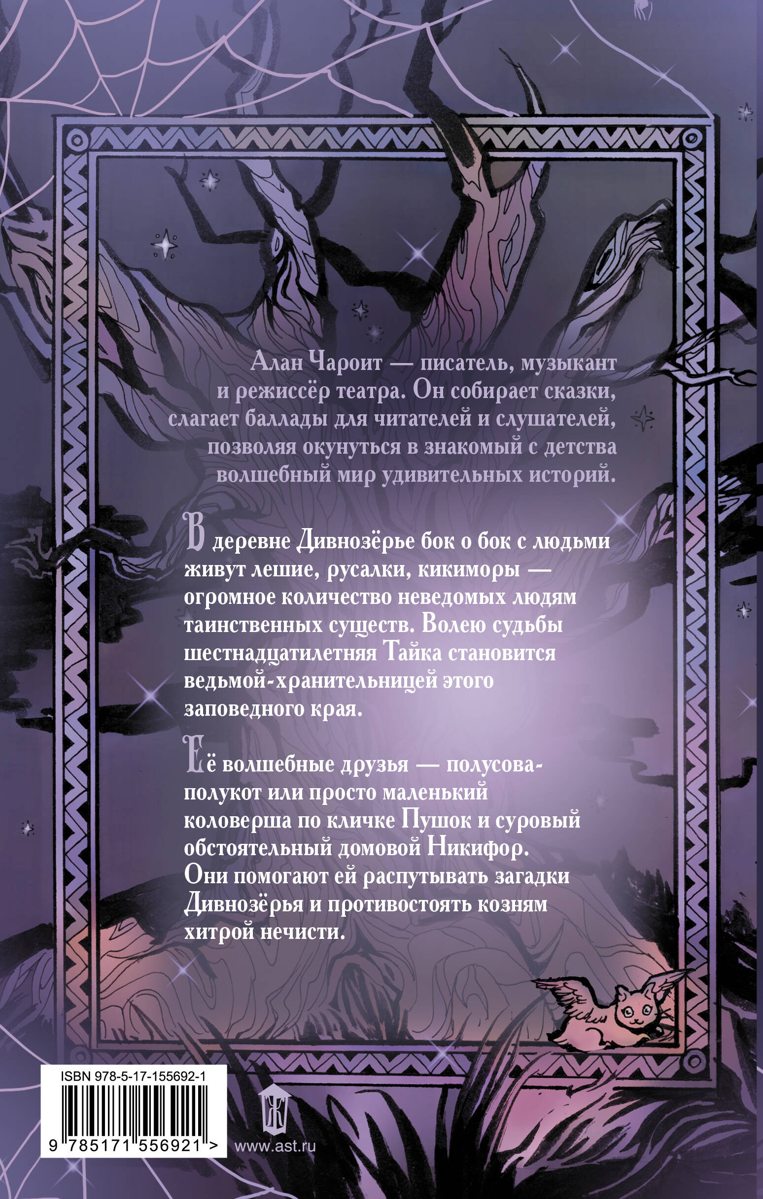 В деревне Дивнозёрье бок о бок с людьми живут лешие, русалки, кикиморы - огромное количество неведомых людям таинственных существ. Волею судьбы шестнадцатилетняя Тайка становится ведьмой-хранительницей этого заповедного края. Её волшебные друзья - полусова-полукот, или просто маленький коловерша, по кличке Пушок и суровый обстоятельный домовой Никифор. Они помогают ей распутывать загадки Дивнозёрья и противостоять козням хитрой нечисти.| Издательство | ИЗДАТЕЛЬСТВО "АСТ" |
