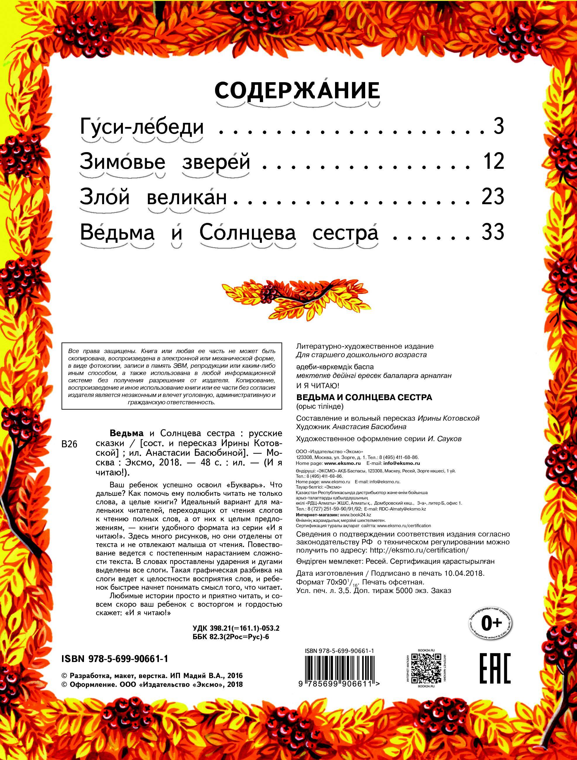 Ваш ребенок успешно освоил «Букварь», что дальше? Как помочь ему полюбить читать не только слова, а целые книги? Идеальный вариант для маленьких читателей, переходящих от чтения слогов к чтению полных слов, а от них к целым предложениям, - книги удобного формата из серии «И я читаю». Здесь много рисунков, но они отделены от текста и не отвлекают малыша от чтения. Повествование ведется с постепенным нарастанием сложности текста. В словах проставлены ударения и дугами выделены все слоги. Такая графическая разбивка на слоги ведет к целостности восприятия слов, и ребенок быстрее начнет понимать смысл того, что читает. Любимые истории просто и приятно читать, и совсем скоро ваш ребенок с восторгом и гордостью скажет: «И я читаю!» В небольшую книгу вошли 4 сказки: «Гуси-лебеди», «Зимовье зверей», «Злой великан», «Ведьма и Солнцева сестра». Чтобы ребенок, успешно освоивший Букварь, легко сделал следующие шаги к чтению с удовольствием, ему на помощь спешат книги из серии «И я читаю!». По своему построению и особенностям каждая книга серии представляет собой тренажер по чтению: • Слова разбиты на слоги, которые выделены дугами, что облегчает чтение. • Повествование ведется с постепенным нарастанием сложности текста. • В словах проставлены ударения. • Книгу удобного формата легко носить с собой. • Красочные картинки даны отдельно, они не отвлекают малыша от чтения. • Любимые сказки: в каждой книге серии их четыре. В серию входят книги со сказками: «Волк и семеро козлят», «Волшебная дудочка», «Елена Премудрая», «Крошечка-Хаврошечка», «Лиса и журавль», «Поди туда - не знаю куда», «Сивка-Бурка», «Скатерть-самобранка».| Издательство | ООО "Издательство "Эксмо" |