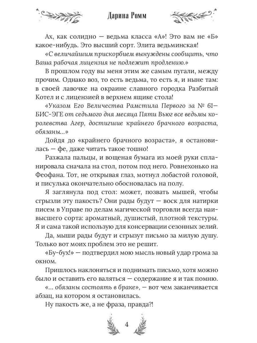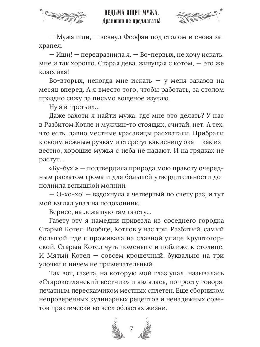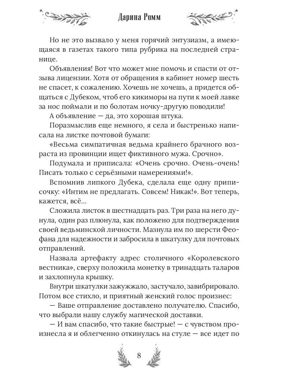 Я взяла в руки перо и написала на листке почтовой бумаги: «Симпатичная ведьма крайнего брачного возраста ищет фиктивного мужа. Срочно». Подумала и добавила: «Очень срочно. Очень-очень! Писать только с серьёзными намерениями!». Вспомнив мерзкого главу Управы, сделала еще одну приписочку: «Интим не предлагать. Совсем! Никак!». Вот теперь, кажется, всё… Ох, не все! На нервах я забыла указать в объявлении самую главную деталь и теперь эта упрямая, красивая и совершенно беспардонная «деталь» обосновалась в моей лавке. Очаровала моего фамильяра, влюбила в себя мою метлу и теперь подбирается ко мне. Ну нет, со мной этот номер не пройдет! Точно-точно не пройдет… В книге нас ждут: Очаровательная ведьмочка - 1 шт. Наглый красавец. Он же дракон, он же жених, он же принц, но это пока секрет! - 1 шт. Рыжий умница фамильяр - 1 шт. А также: ведьминская лавка, метла, противный воздыхатель, городские кумушки и многие другие…| Издательство | Т8 RUGRAM |