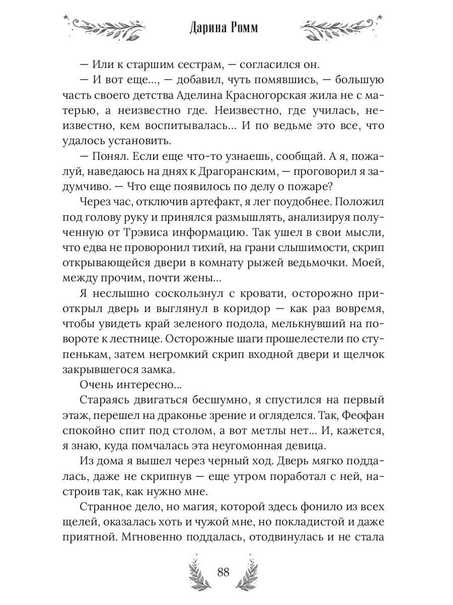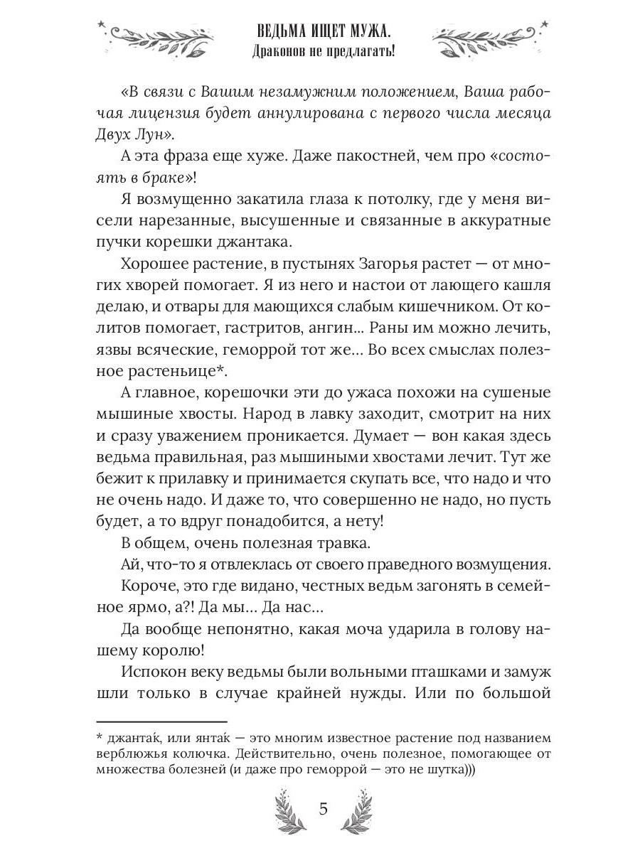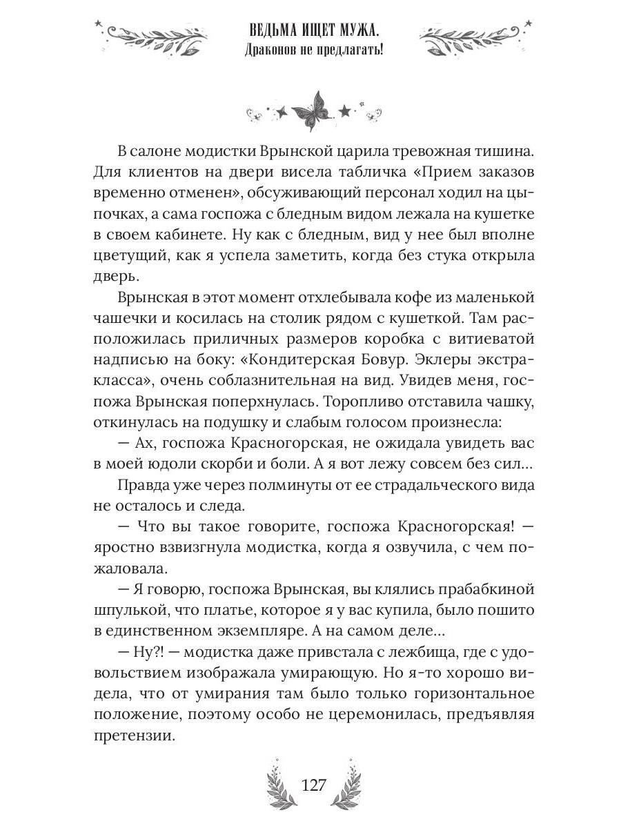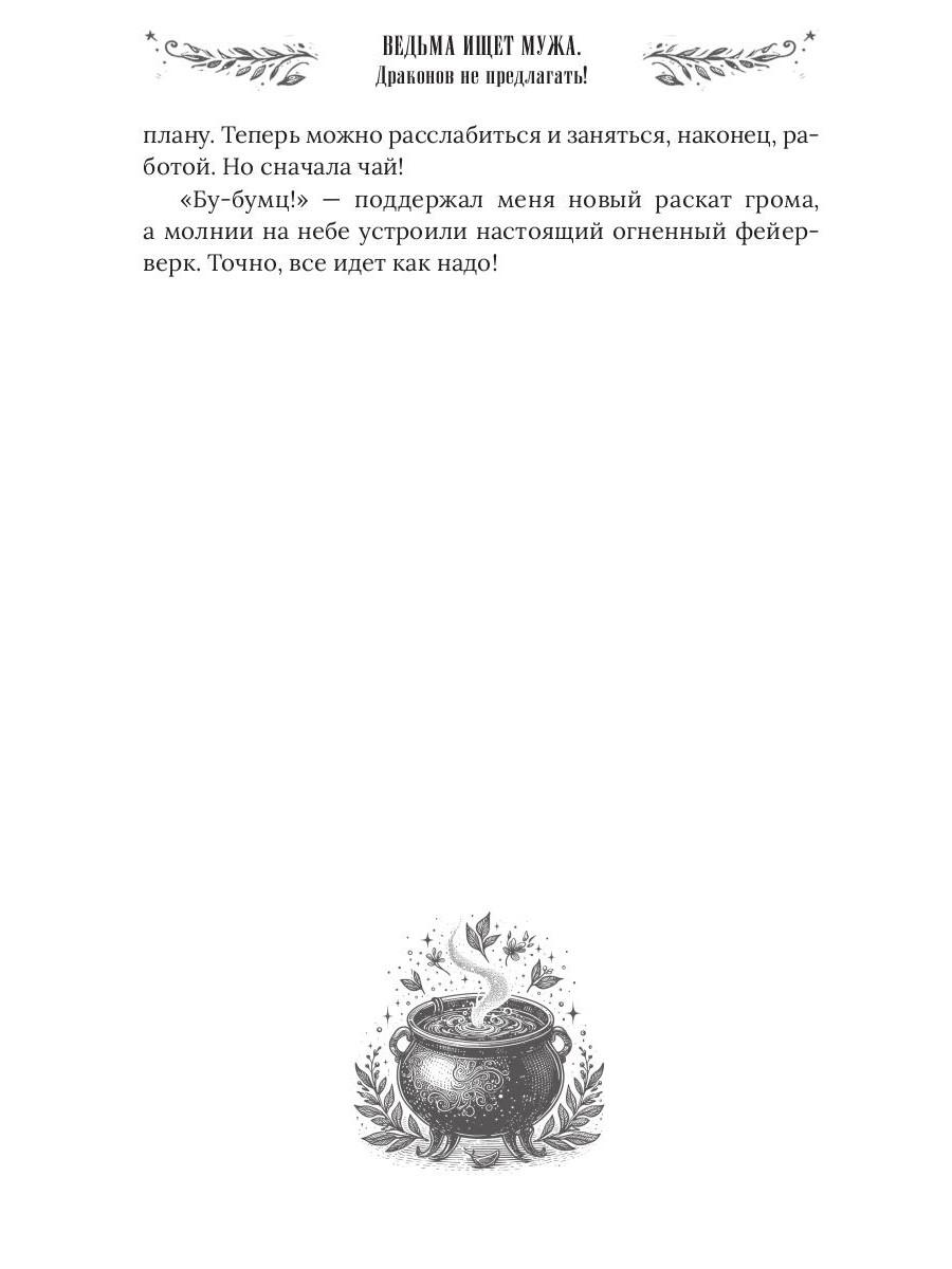 Я взяла в руки перо и написала на листке почтовой бумаги: «Симпатичная ведьма крайнего брачного возраста ищет фиктивного мужа. Срочно». Подумала и добавила: «Очень срочно. Очень-очень! Писать только с серьёзными намерениями!». Вспомнив мерзкого главу Управы, сделала еще одну приписочку: «Интим не предлагать. Совсем! Никак!». Вот теперь, кажется, всё… Ох, не все! На нервах я забыла указать в объявлении самую главную деталь и теперь эта упрямая, красивая и совершенно беспардонная «деталь» обосновалась в моей лавке. Очаровала моего фамильяра, влюбила в себя мою метлу и теперь подбирается ко мне. Ну нет, со мной этот номер не пройдет! Точно-точно не пройдет… В книге нас ждут: Очаровательная ведьмочка - 1 шт. Наглый красавец. Он же дракон, он же жених, он же принц, но это пока секрет! - 1 шт. Рыжий умница фамильяр - 1 шт. А также: ведьминская лавка, метла, противный воздыхатель, городские кумушки и многие другие…| Издательство | Т8 RUGRAM |