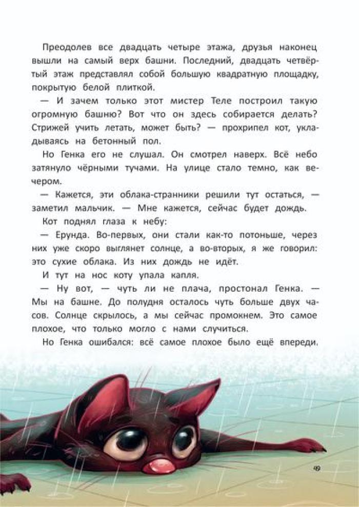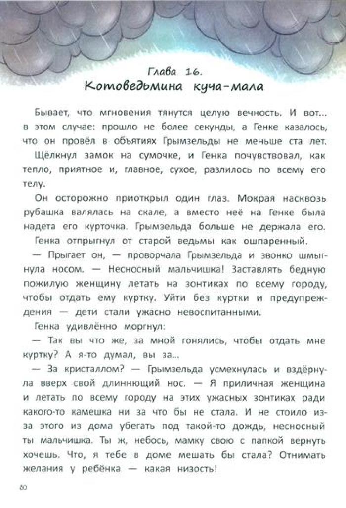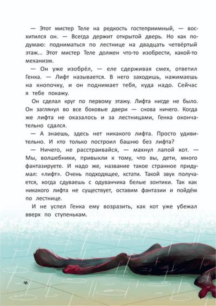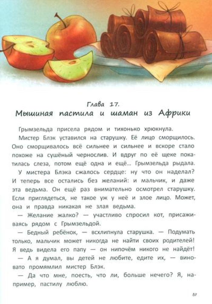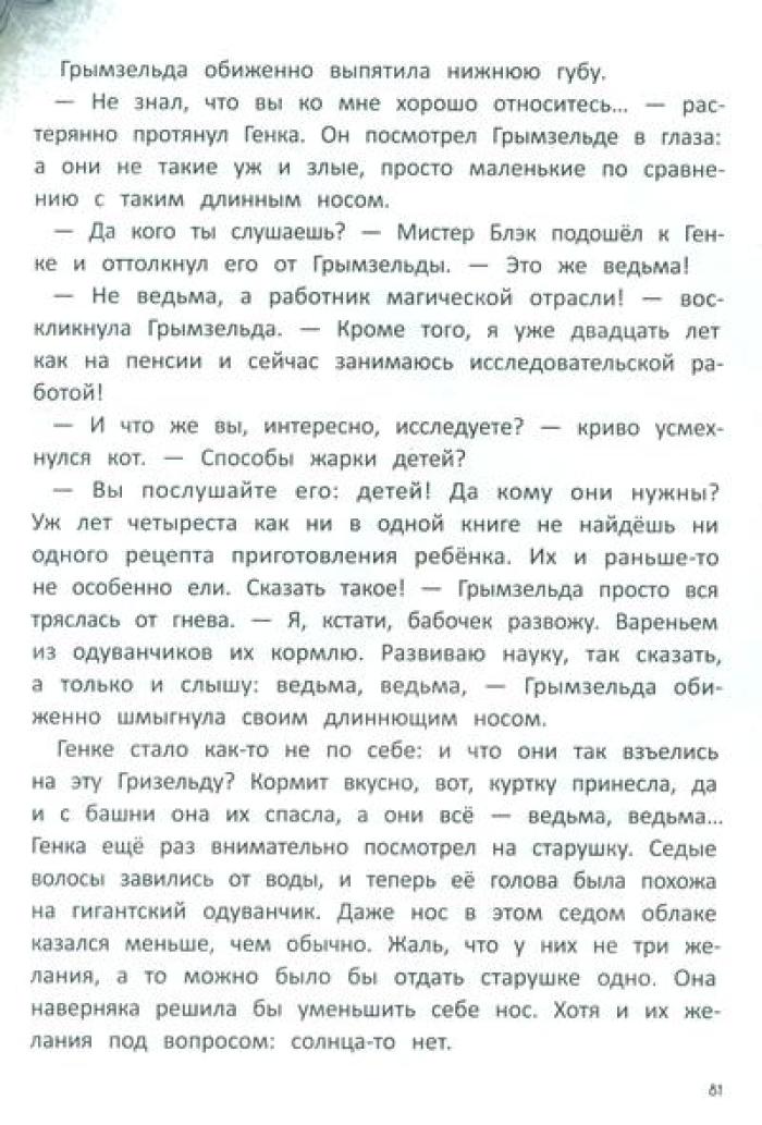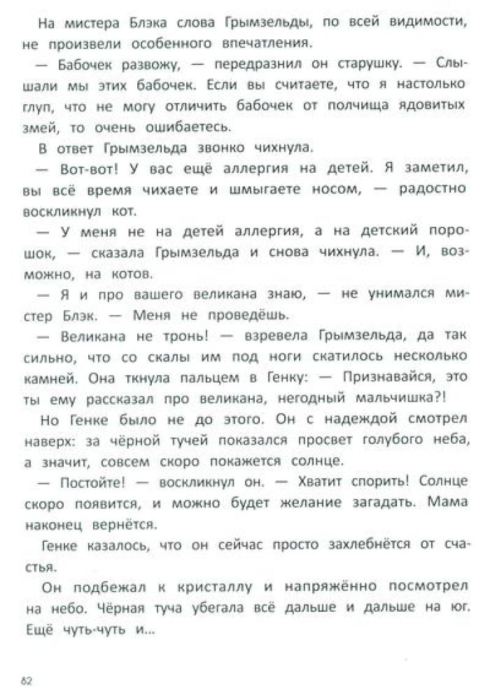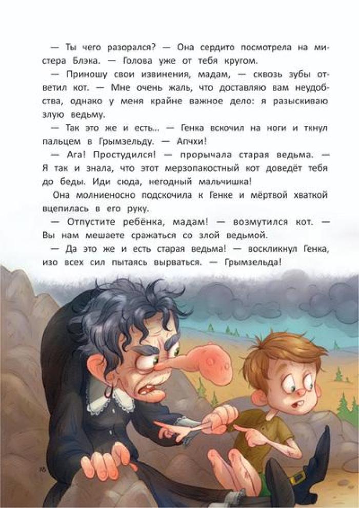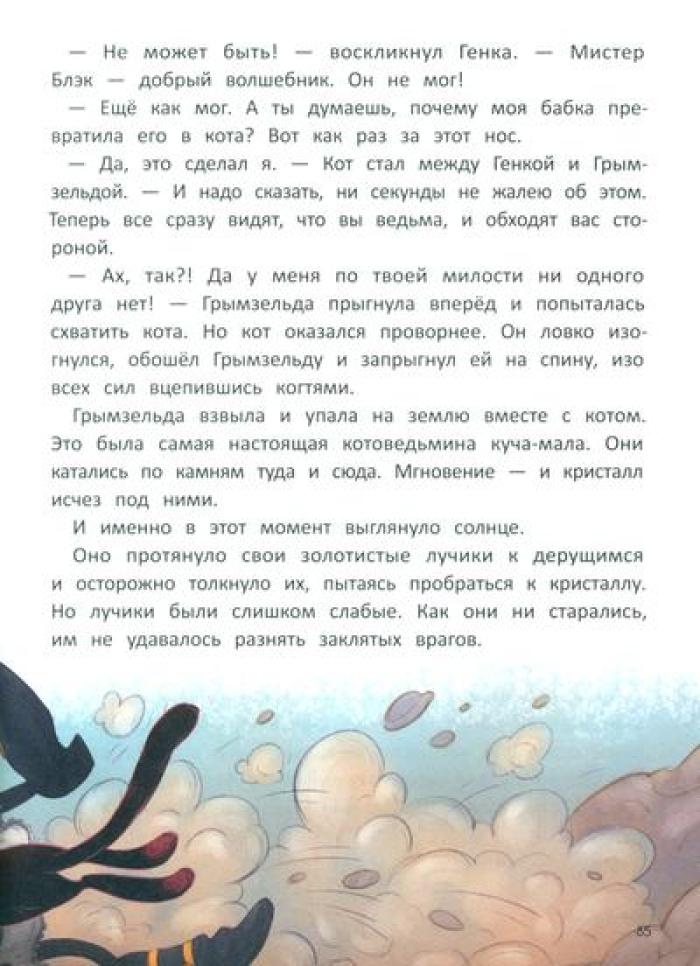 Родители семилетнего Генки исчезают без следа в далёких африканских джунглях. Вернуть их может только чудо. А где водятся чудеса? Конечно, на чердаке у живущей по соседству злющей ведьмы. И ничего, что дом кишит ядовитыми змеями и кровожадными великанами, ради родителей Генка готов на любые подвиги. Но оказывается, что не только он мечтает о чуде: на чердаке Генка знакомится с мистером Блэком, волшебником, сто лет назад превращенным в кота жившей тут ведьмой. Мистер Блэк разыскивает волшебный кристалл, который раз в сто лет может исполнить два желания. Впереди у друзей приключения и неожиданные открытия, которые показывают, что в жизни не всегда всё так, как кажется на первый взгляд.| Издательство | Феникс |
