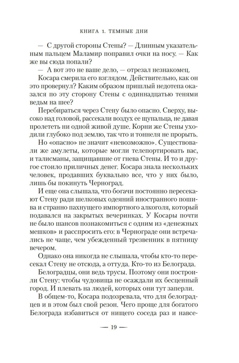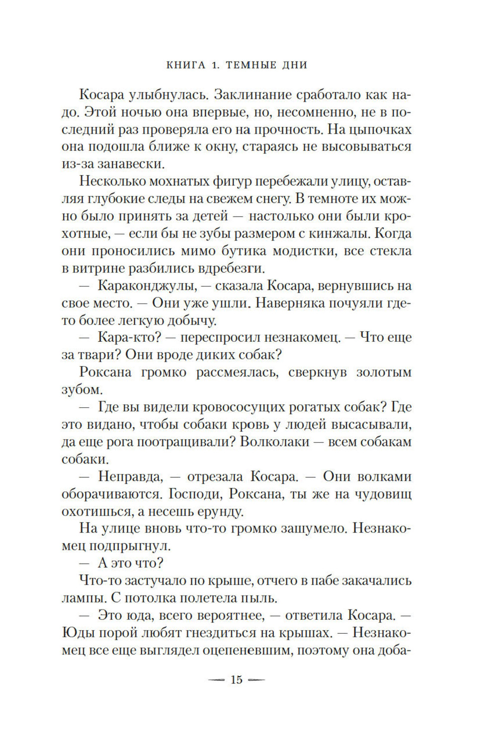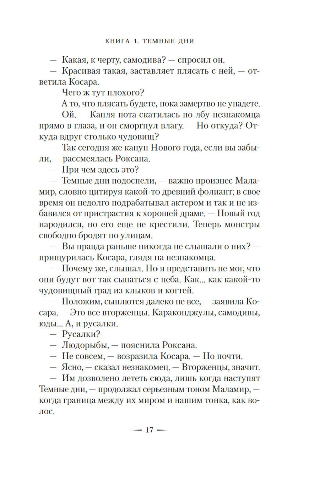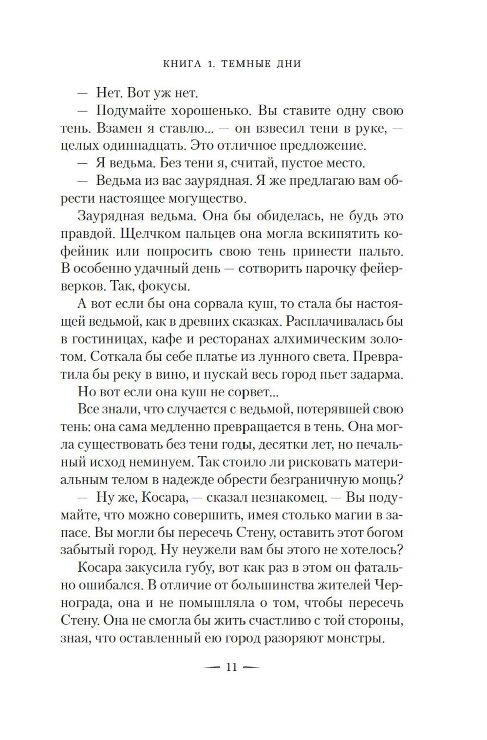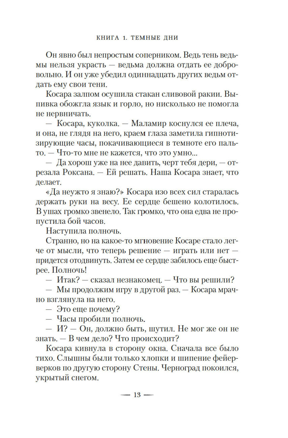 Двенадцать дней после Нового года называют Темными. Только в это время опасные чудовища всех видов и мастей - упыри, русалки, волколаки, самодивы и прочие - могут проникать в мир людей. В городе-крепости Чернограде с нечистью сражается юная ведьма Косара. Как назло, в канун Нового года ей чертовски не везет, и, чтобы спастись от могущественного врага, она вынуждена отдать свою тень и вместе с ней теряет магическую силу. Ведьма без тени обречена на гибель, и Косара обращается за помощью к одному подозрительно благородному детективу. Все улики указывают в одном направлении - тень Косары находится в руках Змея, непобедимого Царя чудовищ. Она бросала ему вызов много раз, а теперь он охотится на нее. Успеет ли ведьма вернуть свою магию, ведь в ее распоряжении всего двенадцать дней?..| Издательство | Азбука |