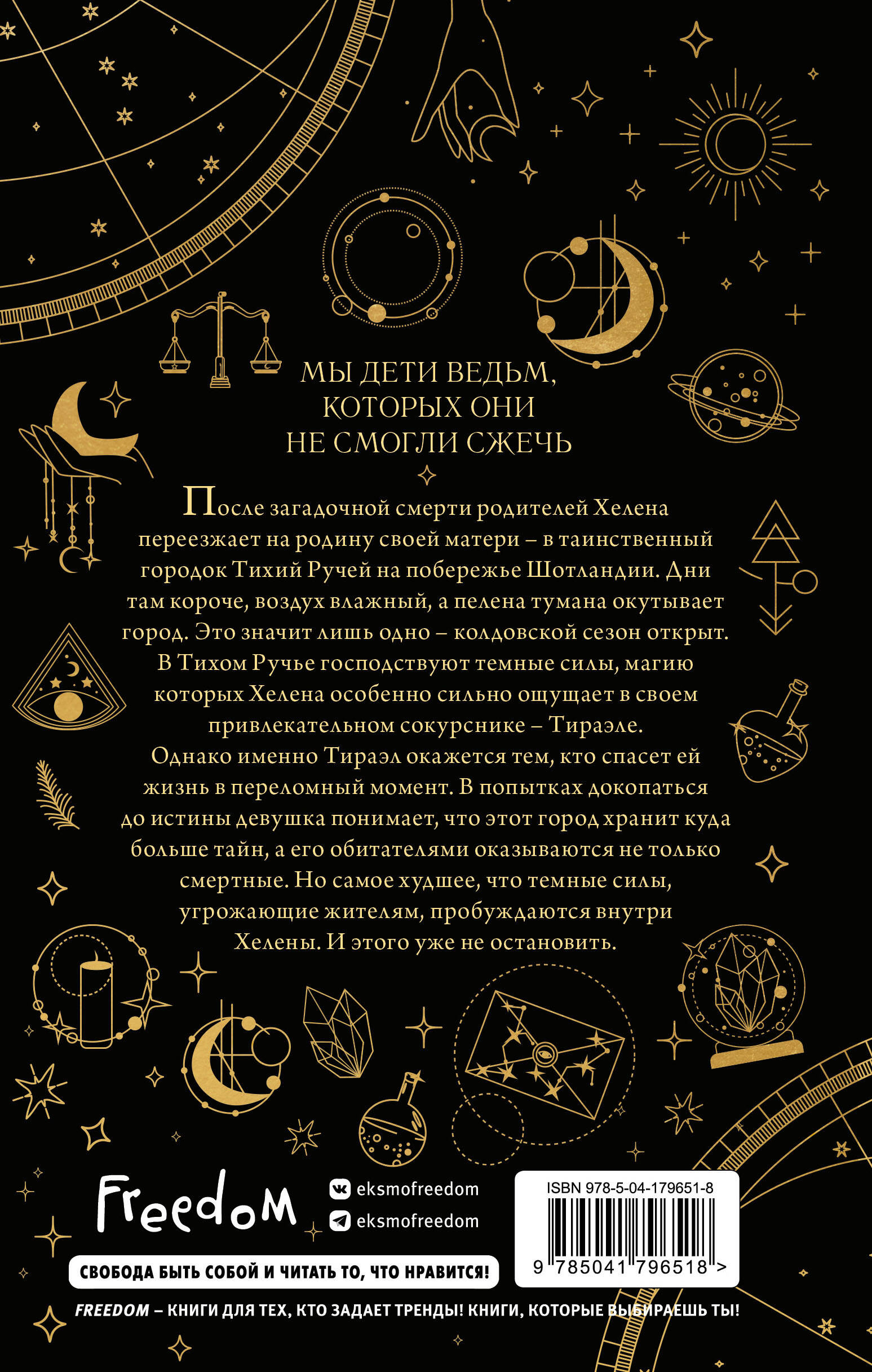 Мрачное атмосферное фэнтези Айлы Дейд о ведьмах из прибрежного городка в Шотландии, манящего своей таинственностью. Невероятная находка для любителей историй про ведьм. После загадочной смерти родителей, Хелена переезжает на родину своей матери - в таинственный городок Тихий ручей на побережье Шотландии. Дни там короче, воздух влажный, а пелена тумана окутывает город. Это значит лишь одно - колдовской сезон открыт. В Тихом ручье господствуют темные силы, магию которых Хелена особенно сильно ощущает в своем привлекательном сокурснике - Тираэле. Однако именно Тираэль окажется тем, кто спасет ей жизнь в переломный момент. В попытках докопаться до истины, девушка понимает, что этот город хранит куда больше тайн, а его обитателями оказываются не только смертные. Но самое худшее, что темные силы, угрожающие жителям, пробуждаются внутри Хелены. И этого уже не остановить. Темная обложка с золотой фольгой, цветные форзацы, генеалогическое древо и атмосферный макет. Идеальная книга для чтений в темноте.| Издательство | ООО "Издательство "Эксмо" |