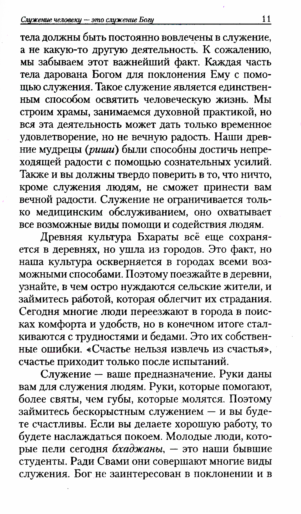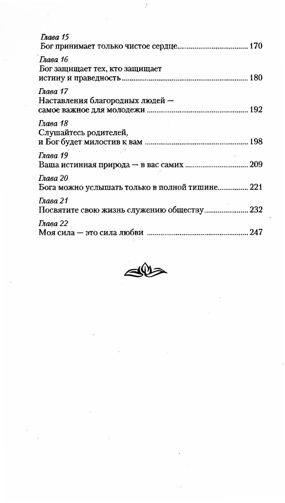 В очередном томе лекций Аватара Шри Сатья Саи Бабы изложены практические знания для людей, которые встали на путь духовного Освобождения. В книге в доступной форме комментируются простые ведические наставления о правилах и образе жизни человека, как ему использовать древние божественные знания во всех сферах своей жизнедеятельности, как ему достичь вершин духовного развития, как добиться исчезновения страдания, боли, страха, беспокойства и многих других проблем. Чтение этой книги и применение этих знаний в жизни принесет человеку радость и свободу, а самое главное, он получит ответ на такие вопросы как: зачем он пришел в этот мир, что он должен делать в жизни и какие высокие цели стоят перед ним.| Издательство | Амрита-Русь |