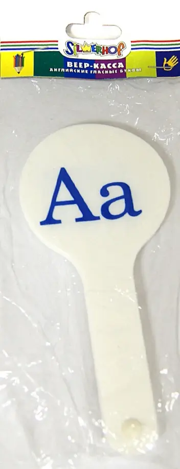 Веер-касса с английскими гласными буквами предназначен для обучения детей английскому алфавиту.