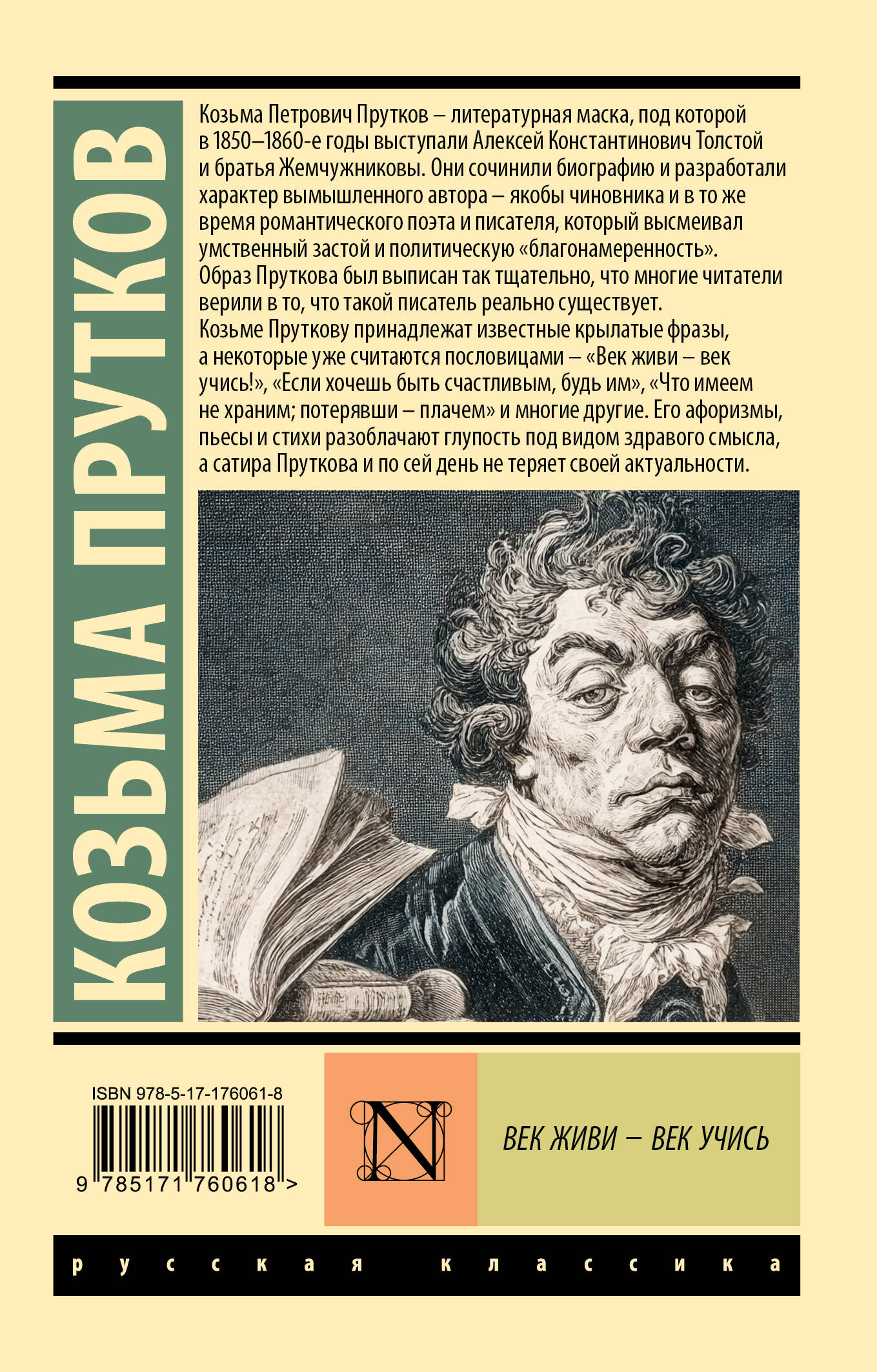 Козьма Петрович Прутков - литературная маска, под которой в 1850-1860-е годы выступали Алексей Константинович Толстой и братья Жемчужниковы. Они сочинили биографию и разработали характер вымышленного автора - якобы чиновника и в то же время романтического поэта и писателя, который высмеивал умственный застой и политическую "благонамеренность". Образ Пруткова был выписан так тщательно, что многие читатели верили в то, что такой писатель реально существует. Козьме Пруткову принадлежат известные крылатые фразы, а некоторые уже считаются пословицами - "Век живи - век учись!", "Если хочешь быть счастливым, будь им", "Что имеем не храним; потерявши - плачем" и многие другие. Его афоризмы, пьесы и стихи разоблачают глупость под видом здравого смысла, а сатира Пруткова и по сей день не теряет своей актуальности.| Издательство | Издательство "АСТ" |