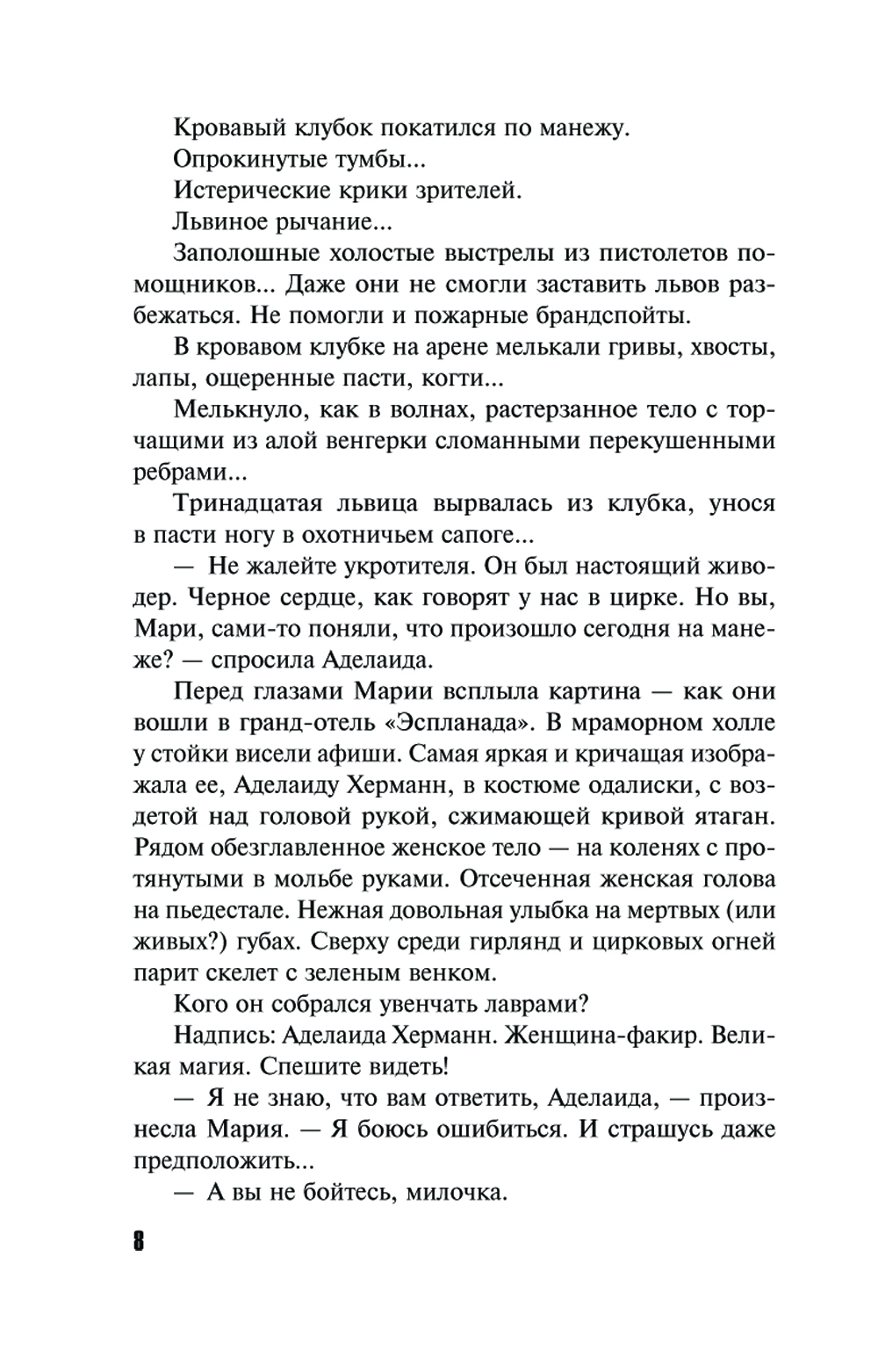 Женщина-факир Мегалания Коралли могла загипнотизировать целый зал зрителей, заставить львов напасть на дрессировщика, и еще много всего... Недаром к ней тайком ездили жены членов политбюро. Но главным желанием Великой Мегалании было найти приемника, которому она могла бы передать сокровенные знания. Поэтому-то она и собирала вокруг себя талантливых детей-воспитанников, чтобы суметь разглядеть дар, подобный ее собственному. И каждый из них пытался доказать и ей - Великой - и себе, что он и есть тот самый - уникальный... Даже спустя много лет, уже во взрослой жизни, это соперничество не прекращалось. В подмосковном дачном поселке найдена убитой успешная деловая женщина Регина Гришина. То, как было совершено и обставлено преступление, сразу навело на мысли криминального обозревателя Екатерину Петровскую и полковника Гектора Борщова, что дело это весьма загадочное и совсем непростое. А таинственные и зловещие предметы, найденные в доме жертвы, лишь подтверждали догадки...| Издательство | Эксмо |