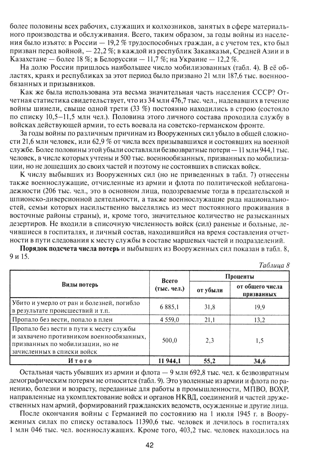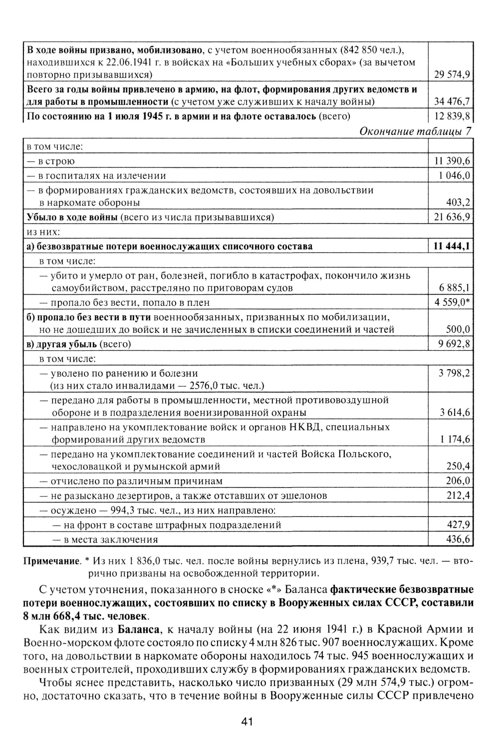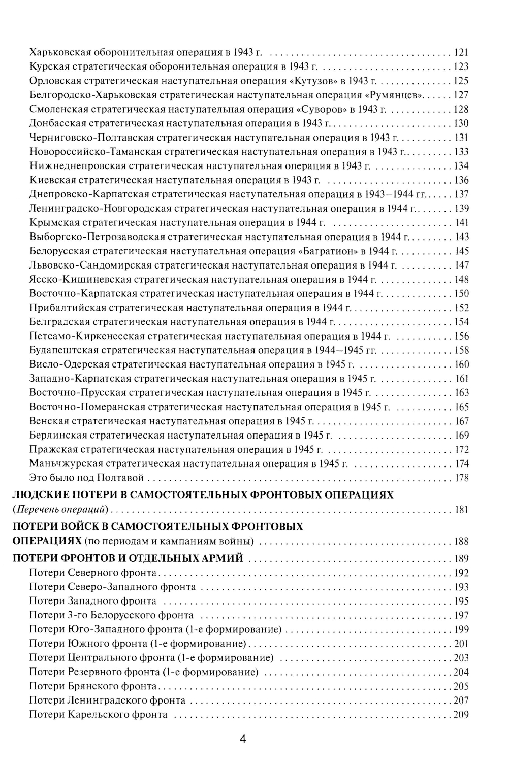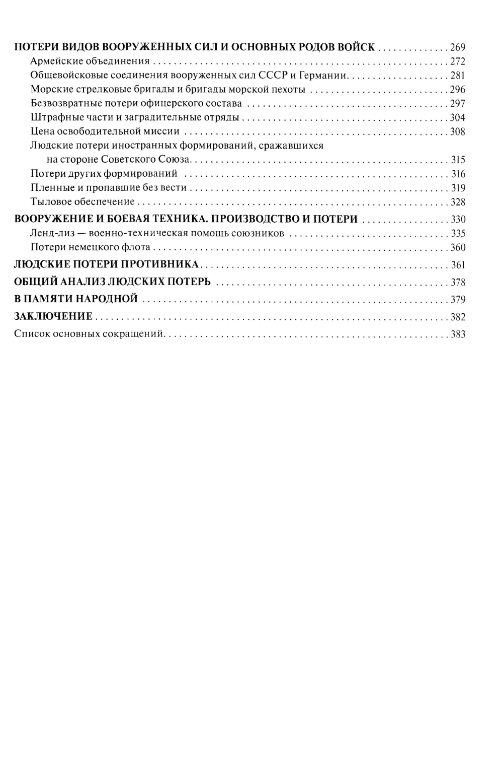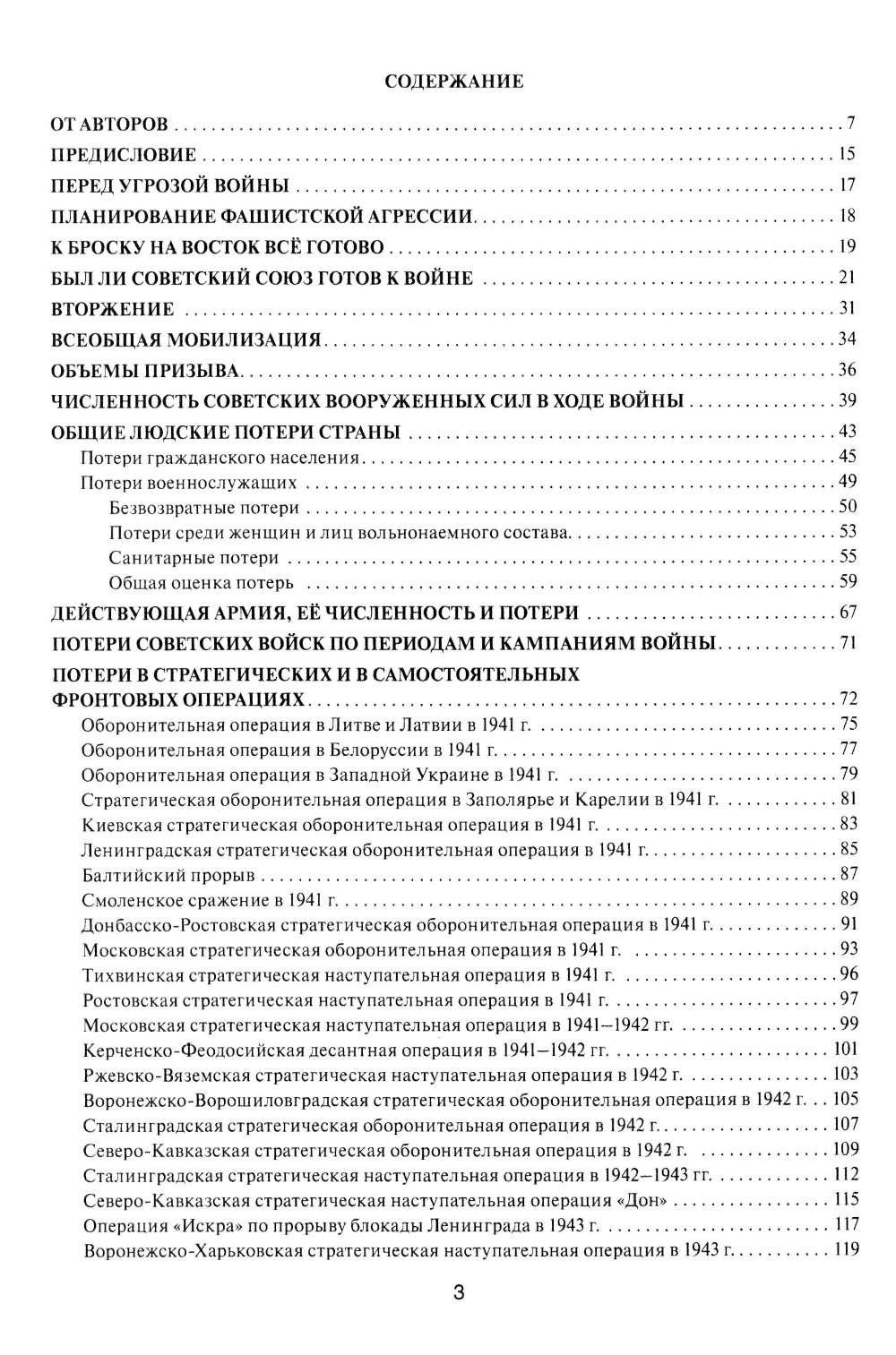 Авторская группа Генерального штаба и Военно-мемориального центра ВС РФ, ныне Департамент МО РФ по увековечению памяти погибших при защите Отечества, используя ранее закрытые для печати архивные документы Генерального штаба и главных штабов видов Вооруженных Сил, МВД, ФСБ, погранвойск и других архивных учреждений бывшего СССР, исследовала итоги проведенных советскими войсками операций во время Великой Отечественной войны. Авторы существенно уточнили общие потери людей и военной техники по периодам, кампаниям войны, по фронтам и флотам, отдельным армиям и военным флотилиям. В книге также представлены уточненные сведения о составе войск противника и его потерях. Кроме того, показано количество захоронений, расположенных на территории России и за рубежом. Данное дополненное издание является уникальным, неоднократно переиздавалось в России и не имеет аналогов в современной военно-исторической литературе.