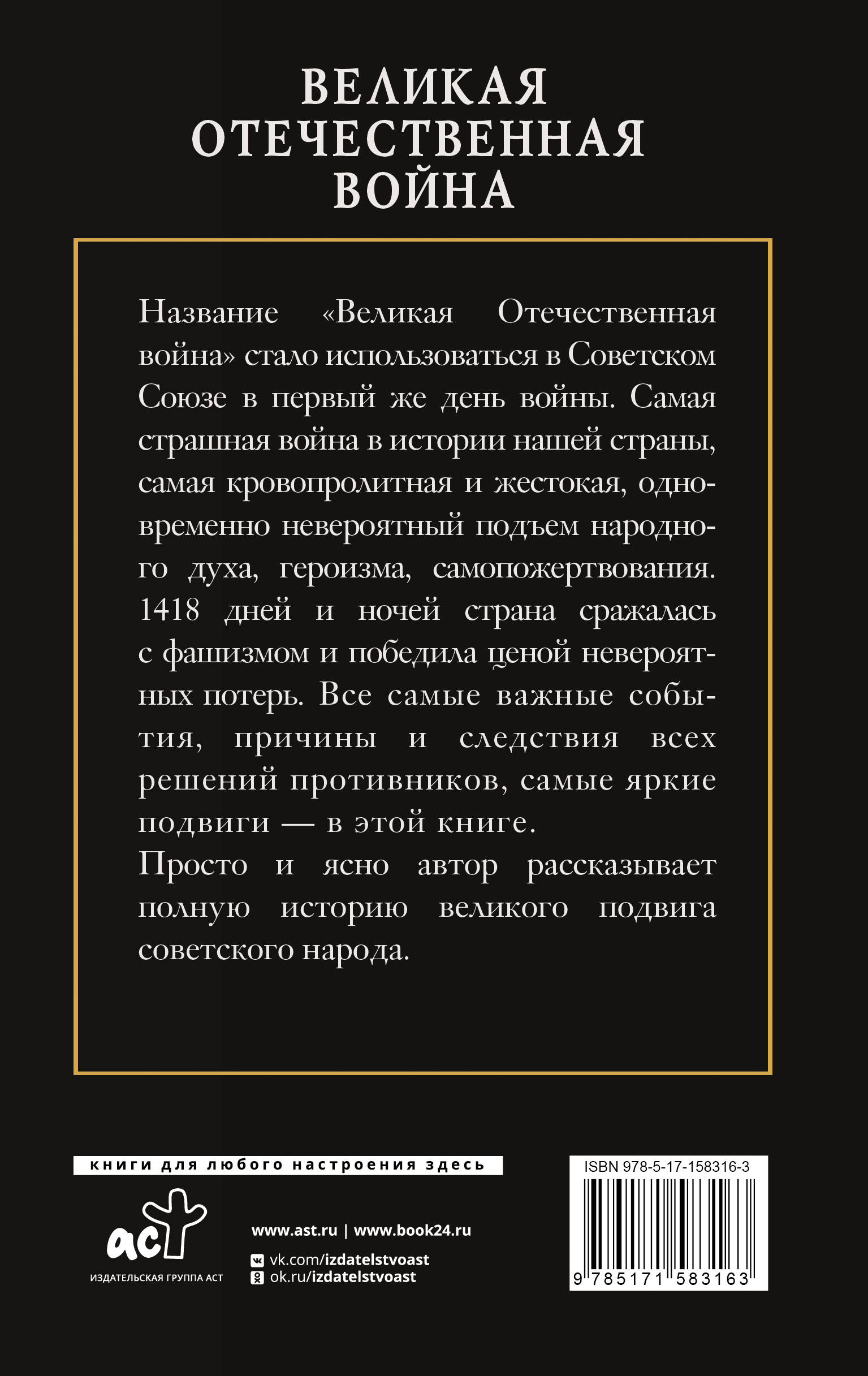 Название "Великая Отечественная война" стало использоваться в Советском Cоюзе в первый же день войны. Самая страшная война и истории нашей страны, самая кровопролитная и жестокая, а одновременно вызывавшая невероятный подъем народного духа, героизма, самопожертвования. 1418 дней и ночей страна сражалась и фашизмом и победила ценой невероятных потерь. Все самые важные события, причины и следствия всех решений противников, самые яркие подвиги - в этой книге. Просто и ясно автор рассказывает полную историю великого подвига советского народа.| Издательство | Издательство "АСТ" |