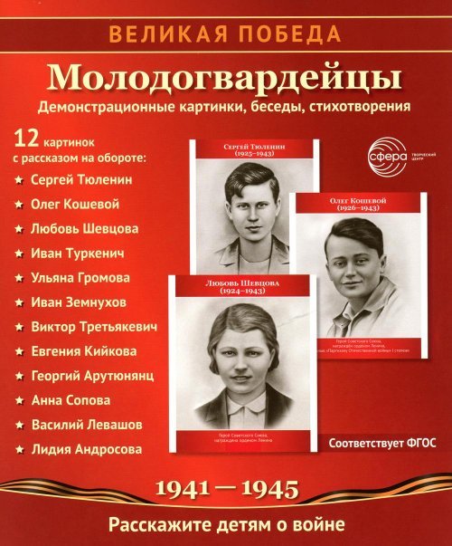 Комплект «Молодогвардейцы» - это уникальная возможность познакомить ребёнка с историей Великой Отечественной войны через призму подвига юных героев. Пособие посвящено 12 участникам подпольной организации «Молодая гвардия», которые в годы Великой Отечественной войны (1941-1945) показали пример невероятного мужества и героизма в борьбе с фашистскими оккупантами. В комплект входят: - краткие биографии молодогвардейцев; - описания подвигов и военных операций, в которых они участвовали; - отрывки из воспоминаний очевидцев и архивных материалов. Фотографии делают рассказ образным и интересным, помогают детям лучше представить себе события тех лет. Пособие поможет ребёнку 6-14 лет лучше понять историю своей страны, узнать о подвигах юных подпольщиков и гордиться ими. В состав входят: - Сергей Тюленин - Олег Кошевой - Любовь Шевцова - Иван Туркенич - Ульяна Громова - Иван Земнухов - Виктор Третьякевич - Евгения Кийкова - Георгий Арутюнянц - Анна Сопова - Василий Левашов - Лидия Андросова.| Издательство | М.: ТЦ СФЕРА |