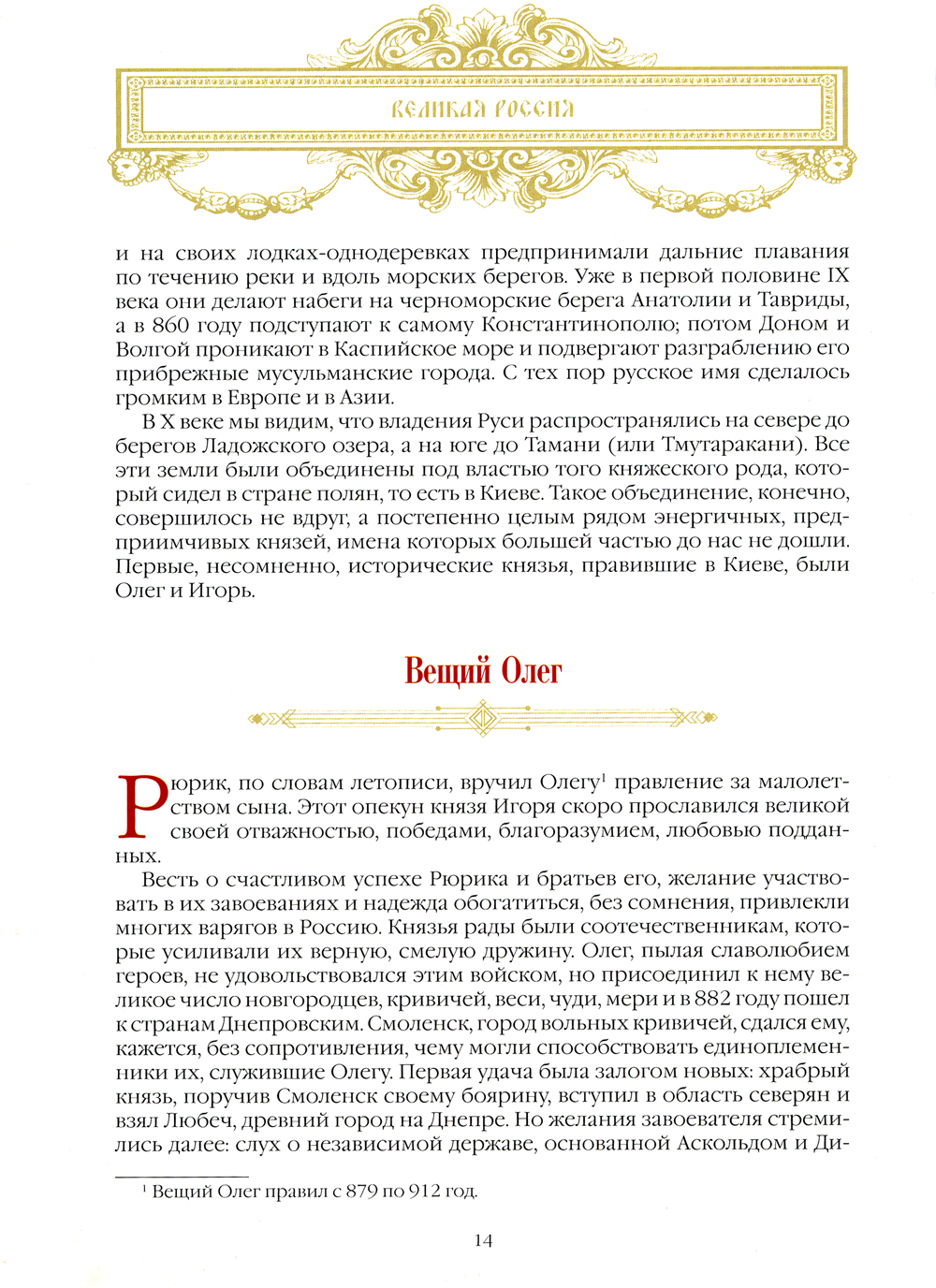Главная книга о тысячелетней истории России - от легендарного призвания основателя первой правящей династии Рюрика до великой Российской империи начала XX века! «Великая Россия» - квинтэссенция труда величайших русских историков за 300 лет: впервые в одной книге сведены и согласованы между собой данные всех главных книг по истории России - от легендарной «Русской истории» Михаила Ломоносова, работ Карамзина, Ключевского, Костомарова и Соловьева до трудов их продолжателей Дмитрия Иловайского и Сергея Платонова. Увлекательное повествование охватывает главнейшие этапы развития государства, важнейшие события, судьбы исторических деятелей и правителей российской державы, олицетворяющих своими трудами, подвигами и именами наше государство. Книга красочно иллюстрирована произведениями классической живописи.| Издательство | Просвещение-Союз |