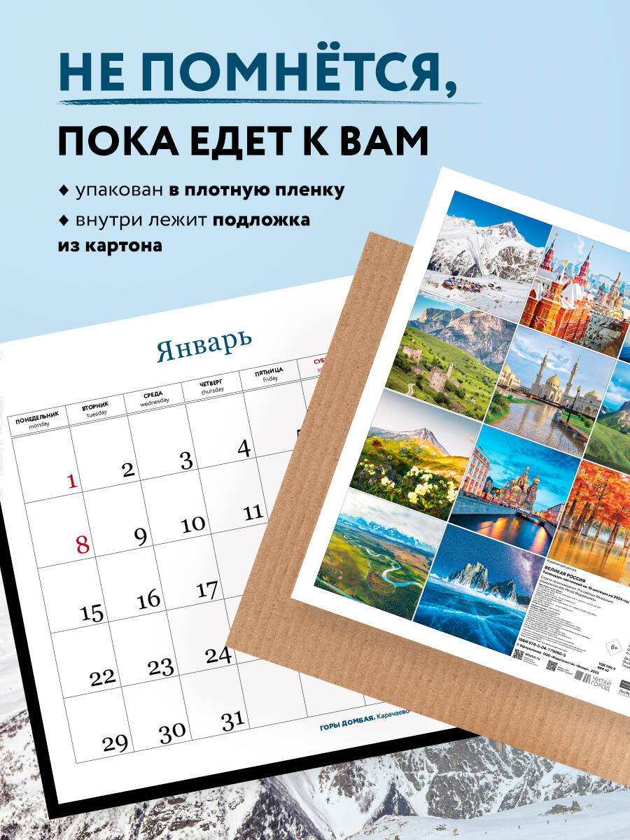 О серии: Наши настенные календари отличаются высоким качеством исполнения! Тщательно подобранные иллюстрации, напечатанные на глянцевой бумаге высочайшего качества, станут настоящим украшением дома, а в календарной сетке найдется место для ваших планов: большие клетки позволят делать записи и организовать свой год! В календаре также отмечены все государственные праздники. В серии настенных календарей издательства «ЭКСМО» каждый найдет тему по вкусу: великие художники, великолепные подборки с самыми знаменитыми произведениями искусства, легендарные кинематографические саги и игры, главные книжные авторы и бестселлеры, фотографии и иллюстрации любимых животных и многое-многое другое! О календаре: Календарь раскроет всю красоту нашей великой страны. Невероятные горы, реки и озера, удивительная архитектура, бескрайние просторы и природа, от которой захватывает дух, - всем этим богата Россия. В календаре собраны разнообразные достопримечательности нашей страны от панорамы Москвы до вулканов Камчатки. Благодаря большому формату и высокому качеству изображений этот календарь может стать отличным дополнением интерьера. В нем также отмечены выходные дни, а просторная сетка позволяет удобно планировать время и записывать важные события. А еще включен дополнительный разворот с первыми 4 месяцами 2025 года! Для кого: Для тех, кто любит свою страну и путешествия по ней. Вдохновитесь красотами России и отправляйтесь в самостоятельное путешествие! Технические параметры: - Тип календаря - настенный перекидной. - Год - 2024. - Календарная сетка - с разбивкой по месяцам. - Вид скрепления - скрепка. - Ширина - 30 см. - Высота - 30 см. - Внутренний блок - мелованная бумага 150 г/м2. - Подложка - плотный гофрокартон для поддержания формы. - Индивидуальная упаковка в плотный целлофановый пакет.