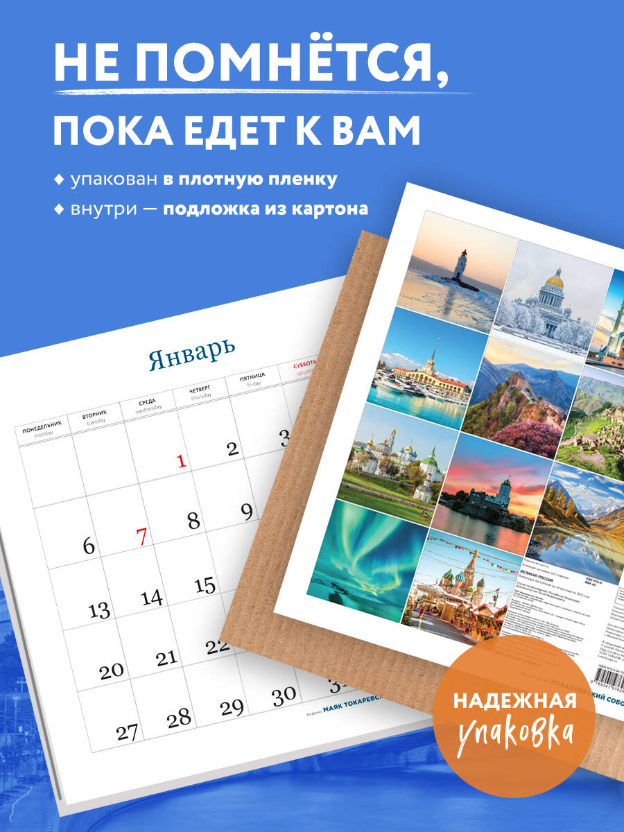 О серии: Наши настенные календари отличаются высоким качеством исполнения! Тщательно подобранные иллюстрации, напечатанные на глянцевой бумаге высочайшего качества, станут настоящим украшением дома, а в календарной сетке найдется место для ваших планов: большие клетки позволят делать записи и организовать свой год! В календаре также отмечены все государственные праздники. В серии настенных календарей издательства «ЭКСМО» каждый найдет тему по вкусу: великие художники, великолепные подборки с самыми знаменитыми произведениями искусства, легендарные кинематографические саги и игры, главные книжные авторы и бестселлеры, фотографии и иллюстрации любимых животных и многое-многое другое! О календаре: Календарь раскроет всю красоту нашей великой страны. Невероятные горы, реки и озера, удивительная архитектура, бескрайние просторы и природа, от которой захватывает дух, - всем этим богата Россия. В календаре собраны разнообразные достопримечательности нашей страны от монументального Санкт-Петербурга до северного сияния на Крайнем Севере. А еще в календарь включен дополнительный разворот с первыми четырьмя месяцами 2026 года! Для кого: Этот путеводитель отлично подойдет для тех, кто хочет насладиться красотами нашей страны. Технические параметры: - Тип календаря - настенный перекидной. - Год - 2025. - Календарная сетка - с разбивкой по месяцам. - Вид скрепления - скрепка. - Ширина - 30 см. - Высота - 30 см. - Внутренний блок - мелованная бумага 150 г/м2. - Подложка - плотный гофрокартон для поддержания формы. - Индивидуальная упаковка в плотный целлофановый пакет.