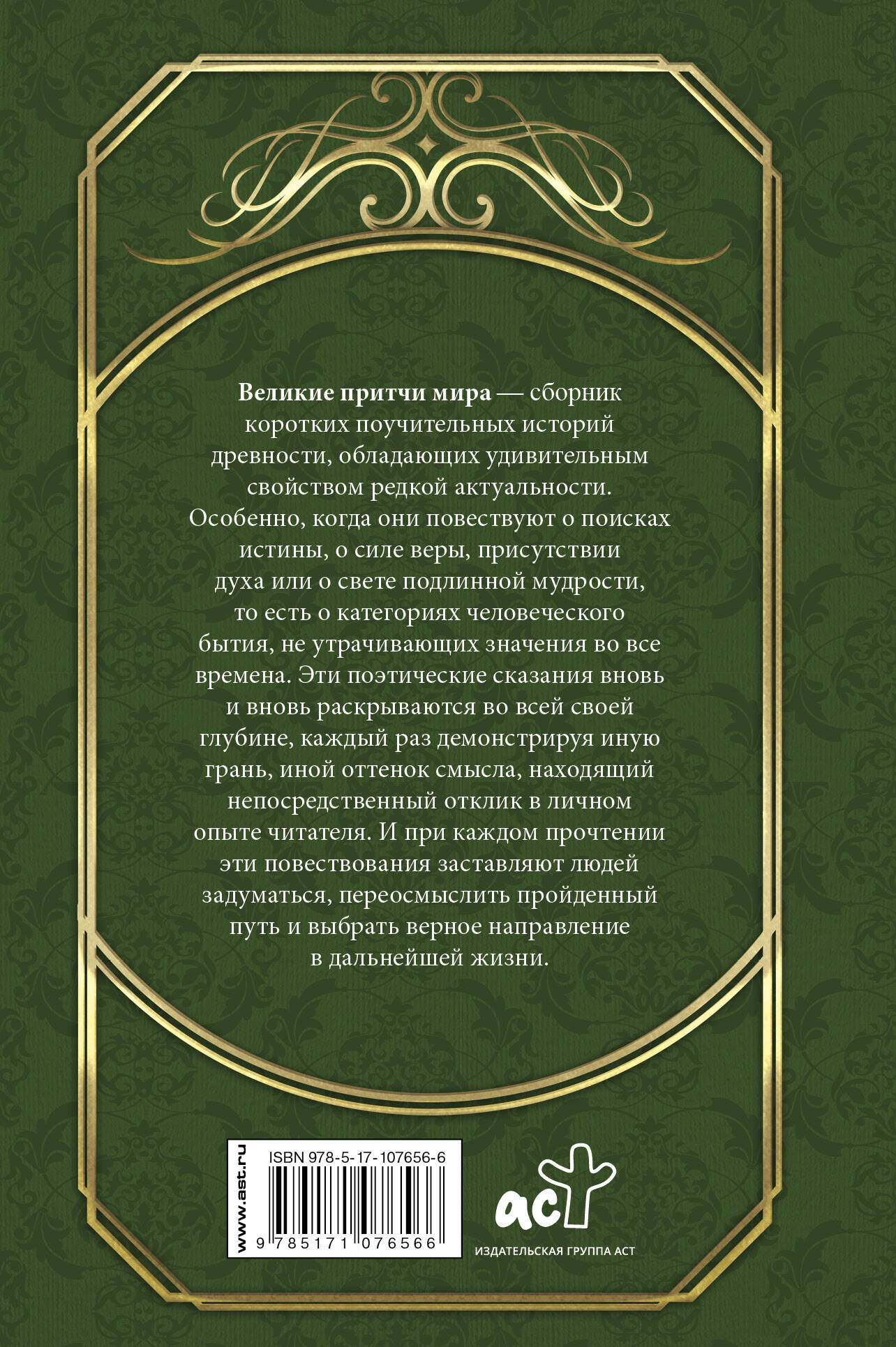 Великие притчи мира - сборник коротких поучительных историй древности, обладающих удивительным свойством редкой актуальности. Особенно когда они повествуют о поисках истины, о силе веры или о свете подлинной мудрости, то есть о категориях человеческого бытия, не утрачивающих значения во все времена. Сколько бы ни выпадало счастливых возможностей их перечитывать, эти поэтические сказания вновь и вновь раскрываются во всей своей глубине, каждый раз демонстрируя иную грань, иной оттенок смысла, находящий непосредственный отклик в личном опыте читателя. И при каждом прочтении эти поэтические повествования заставляют людей задуматься, переосмыслить пройденный путь и выбрать верное направление в дальнейшей жизни.| Издательство | Издательство "АСТ" |