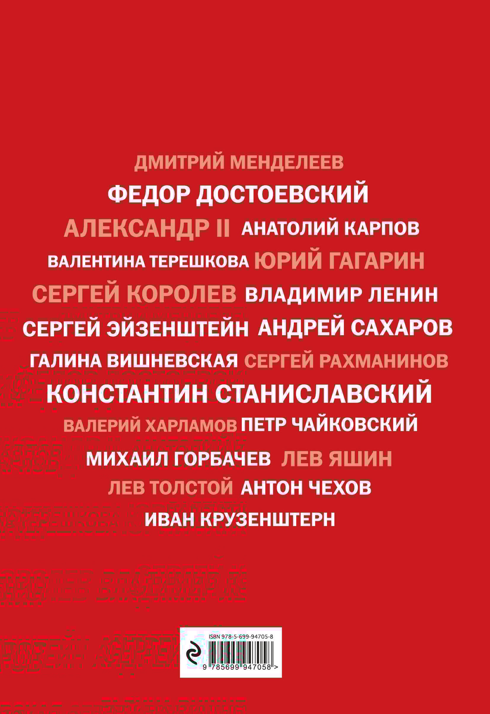 О серии Серия «Подарочные издания. Они изменили мир» - это великолепные издания, заключающие в себе тематические подборки статей о людях, чье значение для истории трудно переоценить. Это биографии личностей, чьи судьбы стали поворотным моментом для своей эпохи. Это рассказы о настоящих героях своего времени. Эти истории удивят и вдохновят вас. О чем книга Во все времена разные народы гордились успехами своих соотечественников. И Россия в этом смысле - не исключение. Наша страна раскинулась на одной седьмой части света, наша история всегда была тесно связана с развитием западной цивилизации, а уникальное расположение между Востоком и Западом породило тот особый менталитет, который описал Тютчев в знаменитых строках: «Умом Россию не понять, аршином общим не измерить». И действительно, судьбы русских людей, ставших знаменитыми на всю планету, тех, чьи имена внесены в список мировых достижений в любой сфере, будь то наука, культура, политика или спорт, чем-то неуловимо похожи друг на друга. На всем, за что брались наши соотечественники, словно лежит отпечаток особенного, «русского» духа. Мы по праву можем гордиться своим народом и его достижениями. Крузенштерн, Менделеев, Чехов, Станиславский, Достоевский, Чайковский, Рахманинов, Гагарин, Макаров, Терешкова, Харламов, Карпов и многие другие - все эти люди служили своему Отечеству, вписав свои имена на страницы истории. И именно об этих людях и пойдет речь в этом подарочном издании. Традиционно, книги выходят в двух подарочных оформлениях. «Фишки» книги • 20 иллюстрированных биографий великих русских людей, оставивших наиболее заметный след в мировой истории • Их основные достижения, интересные факты биографий • уроки мудрости и жизненные правила, которыми они руководствовались • архивные фотографии Для кого эта книга Для патриотов, гордящихся своей страной Для тех, кто мечтает вписать свое имя в историю Для тех, кто ищет первоклассный подарок Цитаты: «Быть человеком между людьми и остаться им навсегда в каких бы то ни было несчастьях, не унывать и не пасть - вот в чем жизнь, в чем задача ее...» Ф. М. Достоевский «Чтобы жить честно, надо рваться, путаться, ошибаться, начинать и бросать… и вечно бороться и лишать¬ся. А спокойствие - душевная подлость» Л.Н. Толстой «Плоды моих трудов - пре¬жде всего в научной извест¬ности, составляющей гор¬дость - не одну мою личную, но и общую русскую» Д.И. Менделеев «Каждый день, в который вы не пополнили своего об¬разования хотя бы малень¬ким, но новым для вас ку¬ском знания… считайте бесплодно и невозвратно для себя погибшим» К.С. Станиславский «Я - русский композитор, и моя родина наложила отпе¬чаток на мой характер и мои взгляды. Моя музыка - это плод моего характера, и по¬тому это русская музыка» С.В. Рахманинов| Издательство | ООО "Издательство "Эксмо" |