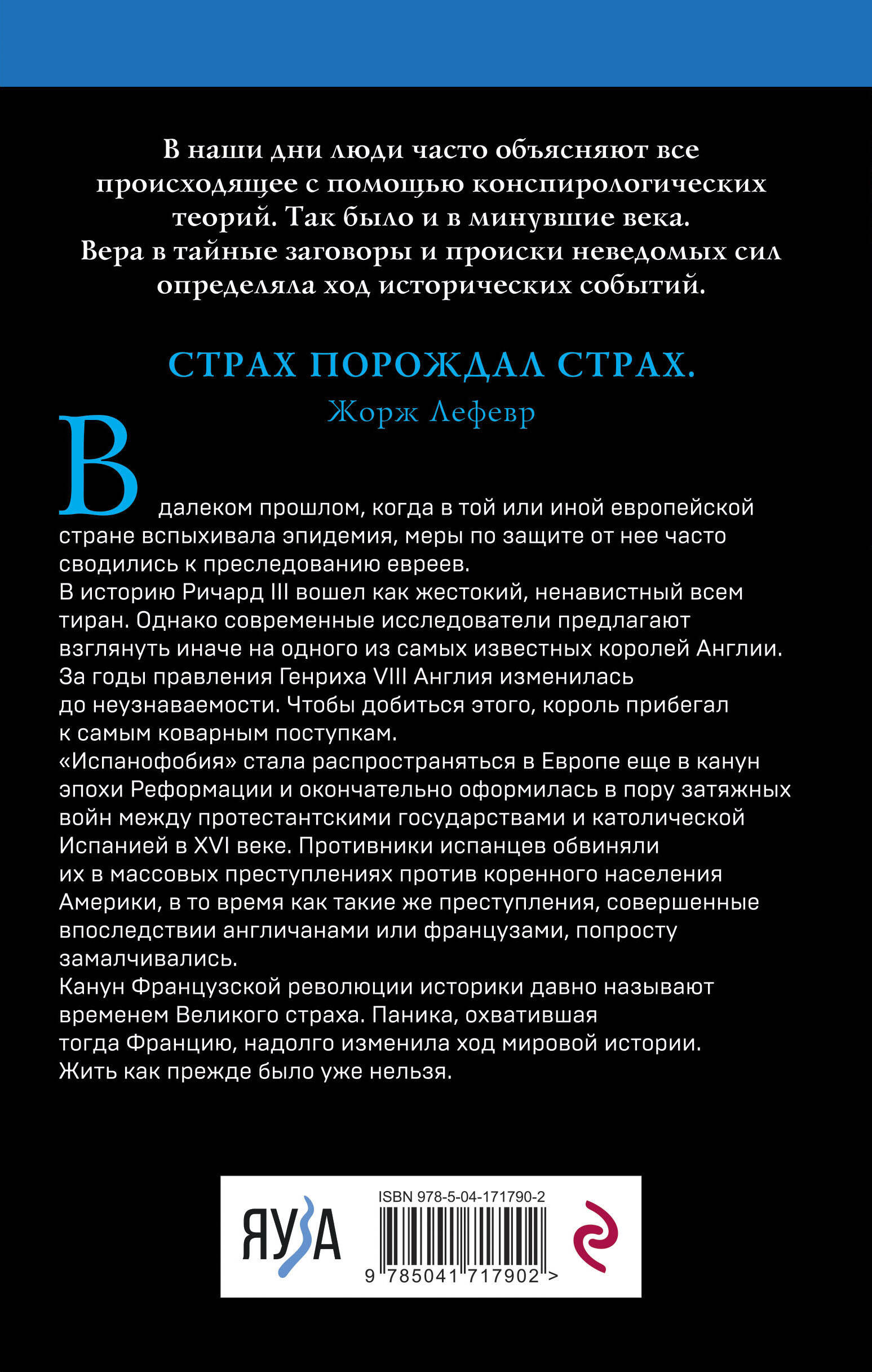 В наши дни люди часто объясняют всё происходящее с помощью конспирологических теорий. Так было и в минувшие века. Вера в тайные заговоры и происки неведомых сил определяла ход исторических событий. В далеком прошлом, когда в той или иной европейской стране вспыхивала эпидемия, распространителями заразы считали чужаков, людей иной веры. Меры по защите от эпидемии часто сводились к преследованию евреев. С давних времен бытует и легенда о том, что евреи используют кровь крещеных младенцев для совершения обрядов в дни своих праздников. В историю Ричард III вошел как жестокий, ненавистный всем тиран. Однако современные исследователи предлагают взглянуть иначе на одного из самых известных королей Англии. За годы правления Генриха VIII Англия изменилась до неузнаваемости. Там, где невозможно было добиться успеха открыто, этот король прибегал к коварству, присущему его душе от рождения. «Худшим англичанином XVII века» был назван Титус Оутс. Кто он такой? «Испанофобия» стала распространяться в Европе еще в канун эпохи Реформации и окончательно оформилась в пору затяжных войн между протестантскими государствами и католической Испанией в XVI веке, но сам термин появился недавно - чуть более ста лет назад. Противники испанцев обвиняли их в массовых преступлениях против коренного населения Америки, в то время как такие же преступления, совершенные впоследствии англичанами в Северной Америке, или англичанами, французами и бельгийцами в Африке, попросту замалчивались. Канун Французской революции историки давно называют временем «Великого страха». Паника, охватившая тогда Францию, надолго изменила ход мировой истории. Жить как прежде было уже нельзя.| Издательство | ООО "Издательство "Эксмо" |