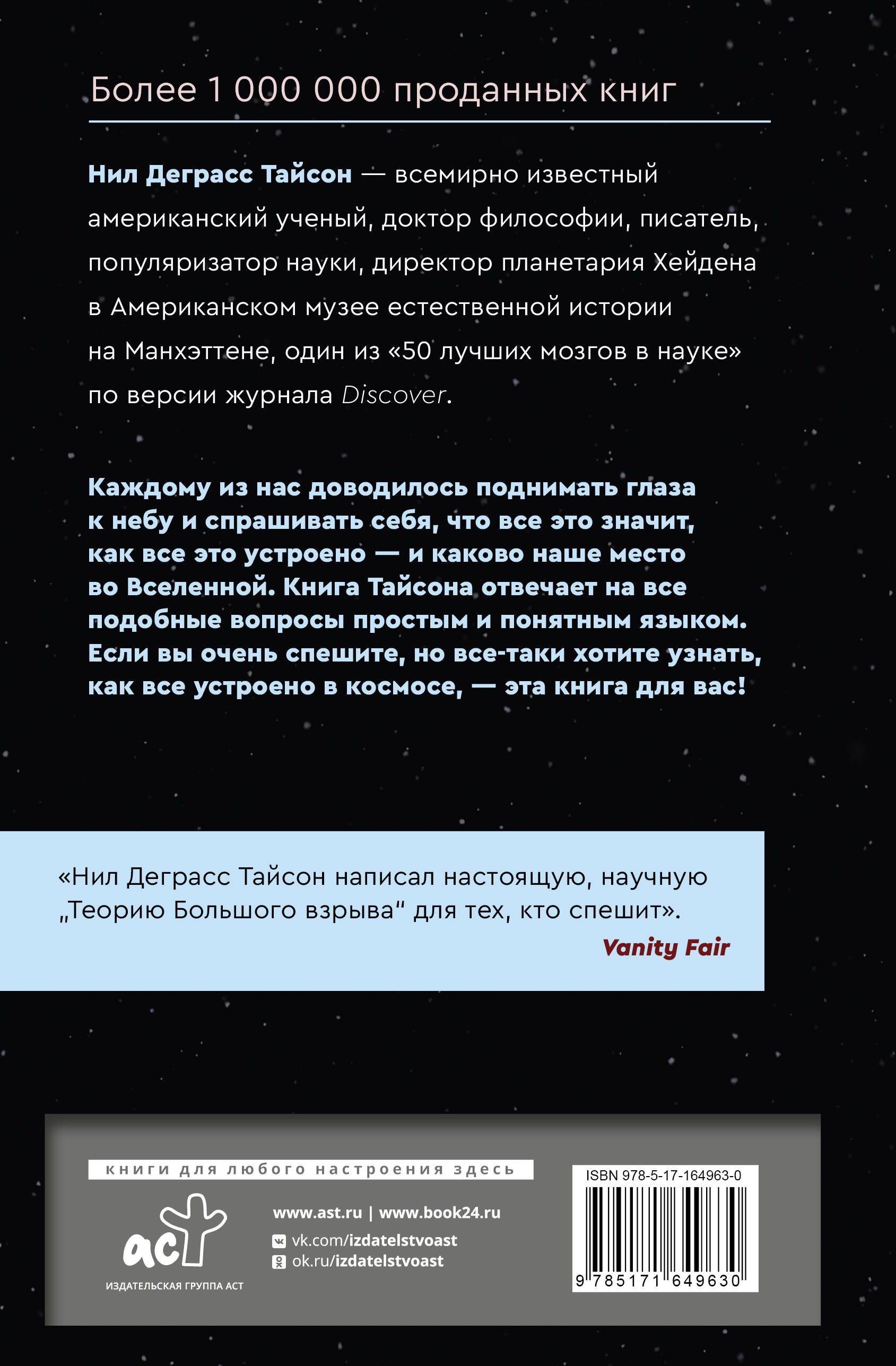 Мировой бестселлер: более 1 000 000 проданных книг! Темное вещество, гравитация, возможность межгалактических полетов и Теория Большого взрыва… Изучение тайн Вселенной подобно чтению захватывающего романа. Но только если вы хорошо понимаете физику, вы знаете, что скрывается за всеми сложными терминами и определениями. В самых головоломных вопросах науки вам поможет разобраться Нил Деграсс Тайсон - один из самых авторитетных и в то же время остроумных астрофизиков нашего времени. Он обладает особым даром рассказывать о сложнейших научных теориях понятно, интересно и с юмором. Книга Нила Тайсона - это захватывающее путешествие в мир современной науки. Вы узнаете о самых последних открытиях, сможете проследить секунда за секундой рождение Вселенной, познакомитесь с новейшими данными о темной материи и происхождении Земли. И чтобы понять все это, вам не понадобится никакого специального образования: достаточно даже слегка подзабытого курса средней школы и любопытства. А закрыв эту книгу, вы поймете, что астрофизика не так сложна, как казалось! Это полезное и увлекательное чтение для всей семьи. Читайте, чтобы не отстать от научно-технического прогресса.| Издательство | Издательство "АСТ" |