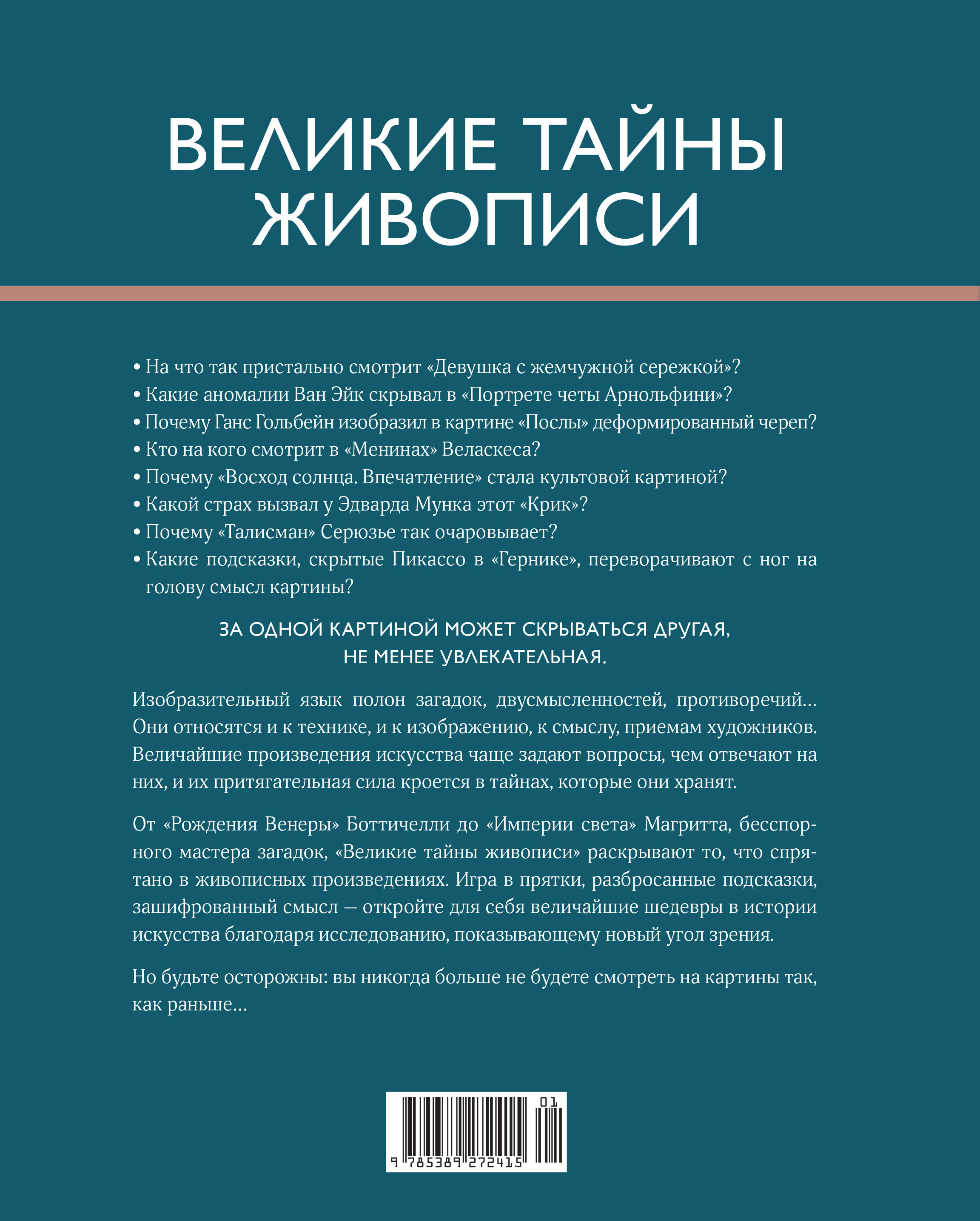 Изобразительный язык полон загадок, двусмысленностей, противоречий… Они относятся и к технике, и к изображению, к смыслу, приемам художников. Величайшие произведения искусства чаще задают вопросы, чем отвечают на них, и их притягательная сила кроется в тайнах, которые они хранят. От "Рождения Венеры" Боттичелли до "Империи света" Магритта, бесспорного мастера загадок, Великие тайны живописи раскрывают то, что спрятано в живописных произведениях. Игра в прятки, разбросанные подсказки, зашифрованный смысл - откройте для себя величайшие шедевры в истории искусства благодаря исследованию, показывающий новый угол зрения. Но будьте осторожны, вы никогда больше не будете смотреть на картины так, как раньше…| Издательство | Издательство АЗБУКА ООО |