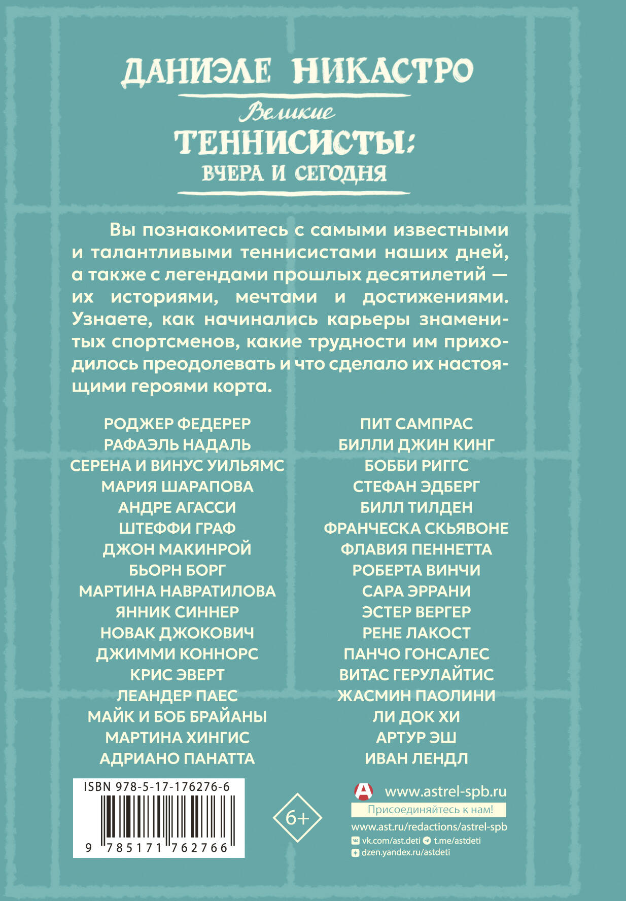 Почувствуйте магию тенниса и зарядитесь энергией больших побед вместе с биографиями великих теннисистов! Совершите увлекательное путешествие по судьбам самых ярких звёзд корта - от Роджера Федерера и Рафаэля Надаля до Новака Джоковича и Янника Синнера, от Марии Шараповой и сестёр Уильямс до Штеффи Граф и Мартины Навратиловой, от Джона Макинроя и Бьорна Борга до Андре Агасси и Рене Лакоста. Познакомьтесь с историями мировых кумиров, узнайте, как начинались их головокружительные карьеры, через какие испытания и разочарования им пришлось пройти, чтобы однажды стать настоящими героями миллионов.| Издательство | Издательство "АСТ" |
