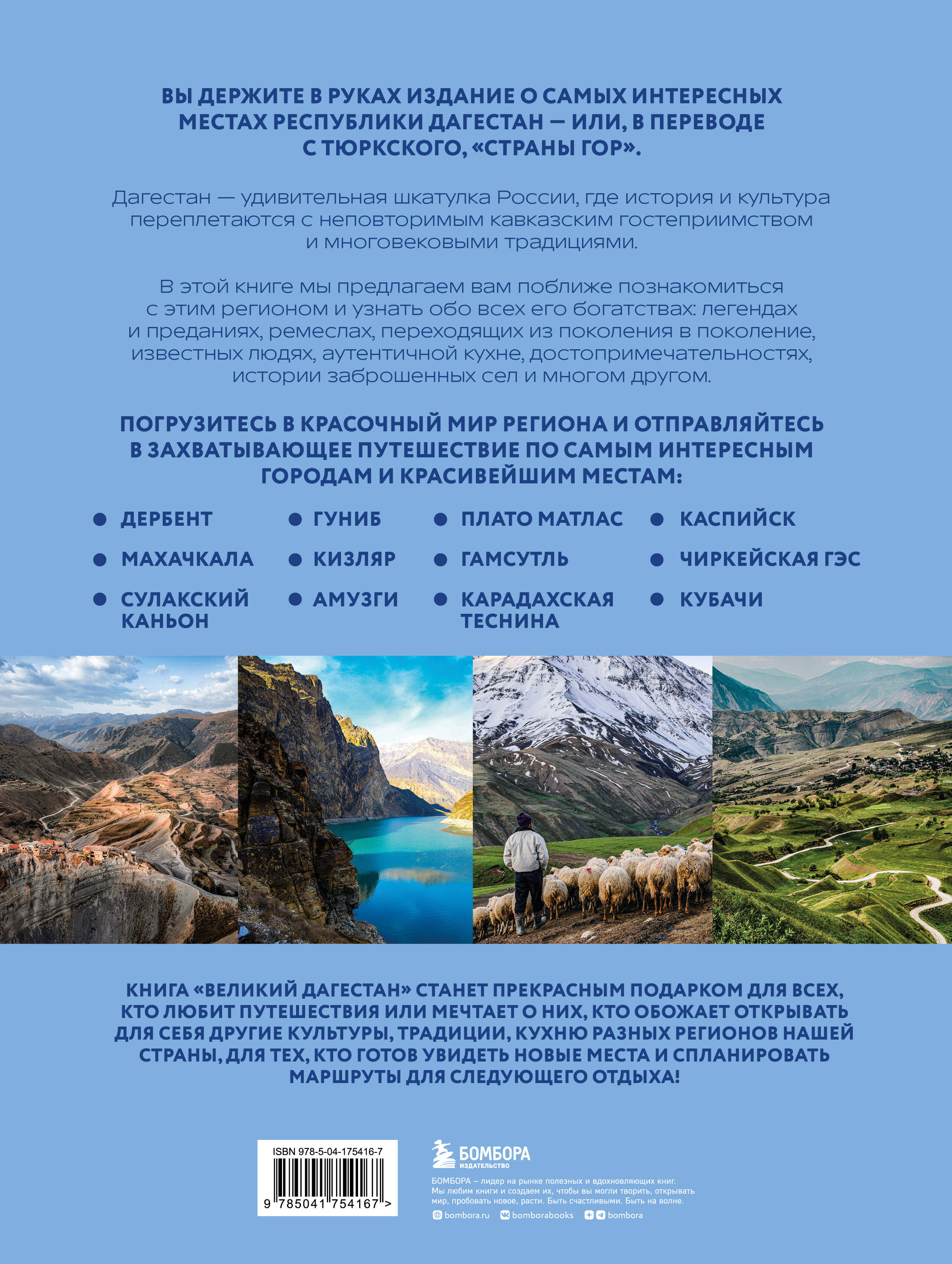 Перед вами книга о самых интересных местах Республики Дагестан - или, в переводе с тюркского, «Страны гор». Дагестан - удивительная шкатулка России, где история и культура переплетаются с неповторимым кавказским гостеприимством и многовековыми традициями. В этой книге мы предлагаем вам поближе познакомиться с этим регионом и узнать о всех его богатствах - легенды и предания, ремесла, переходящие из поколения в поколение, известные люди региона, знаменитая кухня, достопримечательности, истории заброшенных сел и многое другое. Отправляйтесь в захватывающее путешествие по самым интересным городам и достопримечательностям Дербента, Махачкалы, Каспийска, Кизляра, Кубачей, Гамсутля, посетите Чиркейскую ГЭС, Сулакский каньон, Карадахскую теснину, плато Матлас и другие места. Книга «Великий Дагестан» станет прекрасным подарком для всех, кто любит путешествия или мечтает о них, кто обожает открывать для себя другие культуры, традиции, кухню разных регионов нашей страны, для тех, кто готов увидеть новые места и спланировать маршруты для следующего отдыха!| Издательство | ООО "Издательство "Эксмо" |