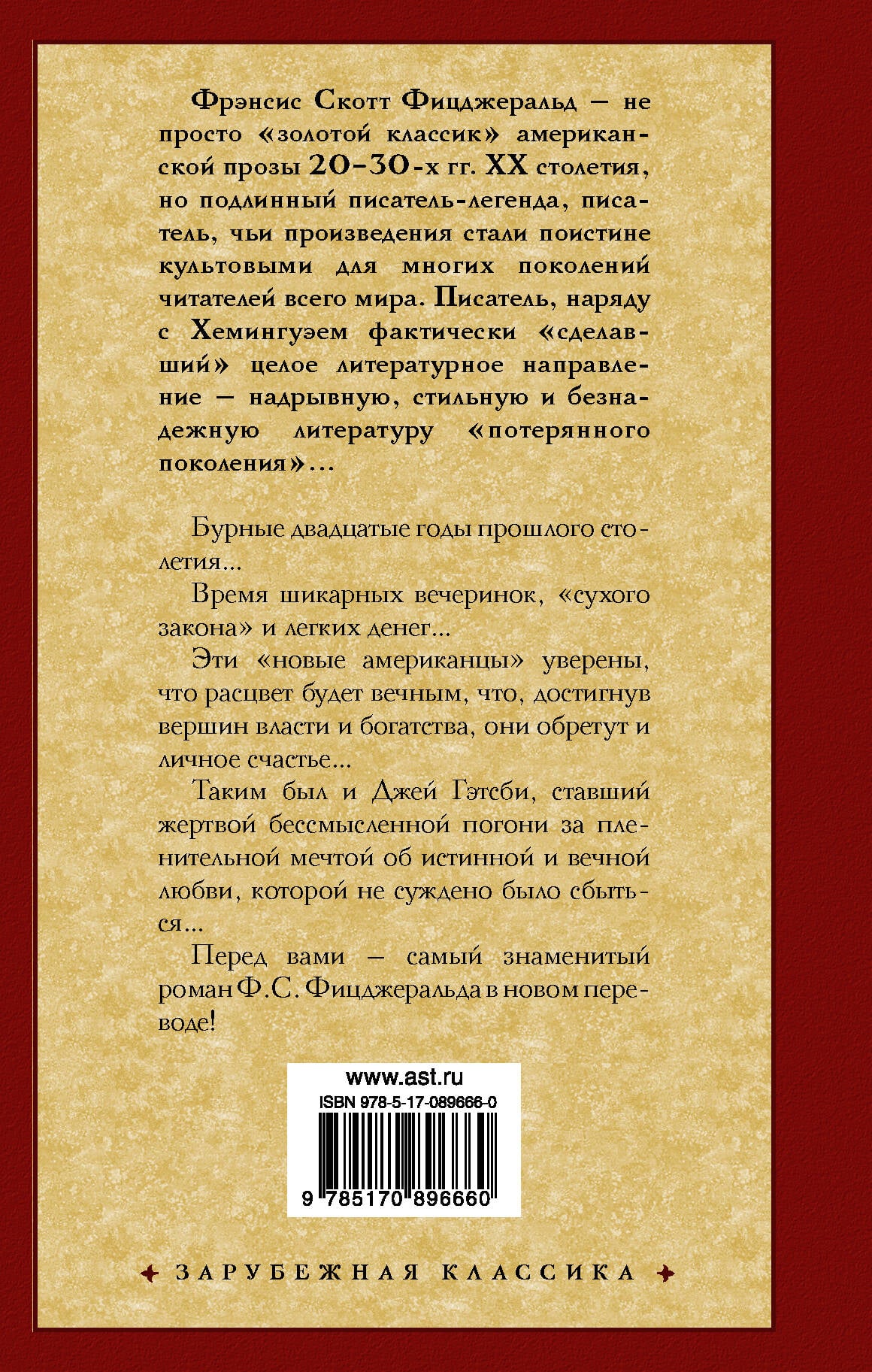 "Бурные" двадцатые годы прошлого столетия… Время шикарных вечеринок, "сухого закона" и "легких" денег… Эти "новые американцы" уверены, что расцвет будет вечным, что достигнув вершин власти и богатства, они обретут и личное счастье… Таким был и Джей Гэтсби, ставший жертвой бессмысленной погони за пленительной мечтой об истинной и вечной любви, которой не суждено было сбыться… Перед вами - самый знаменитый роман Ф.С. Фицджеральда в новом переводе!| Издательство | АСТ |