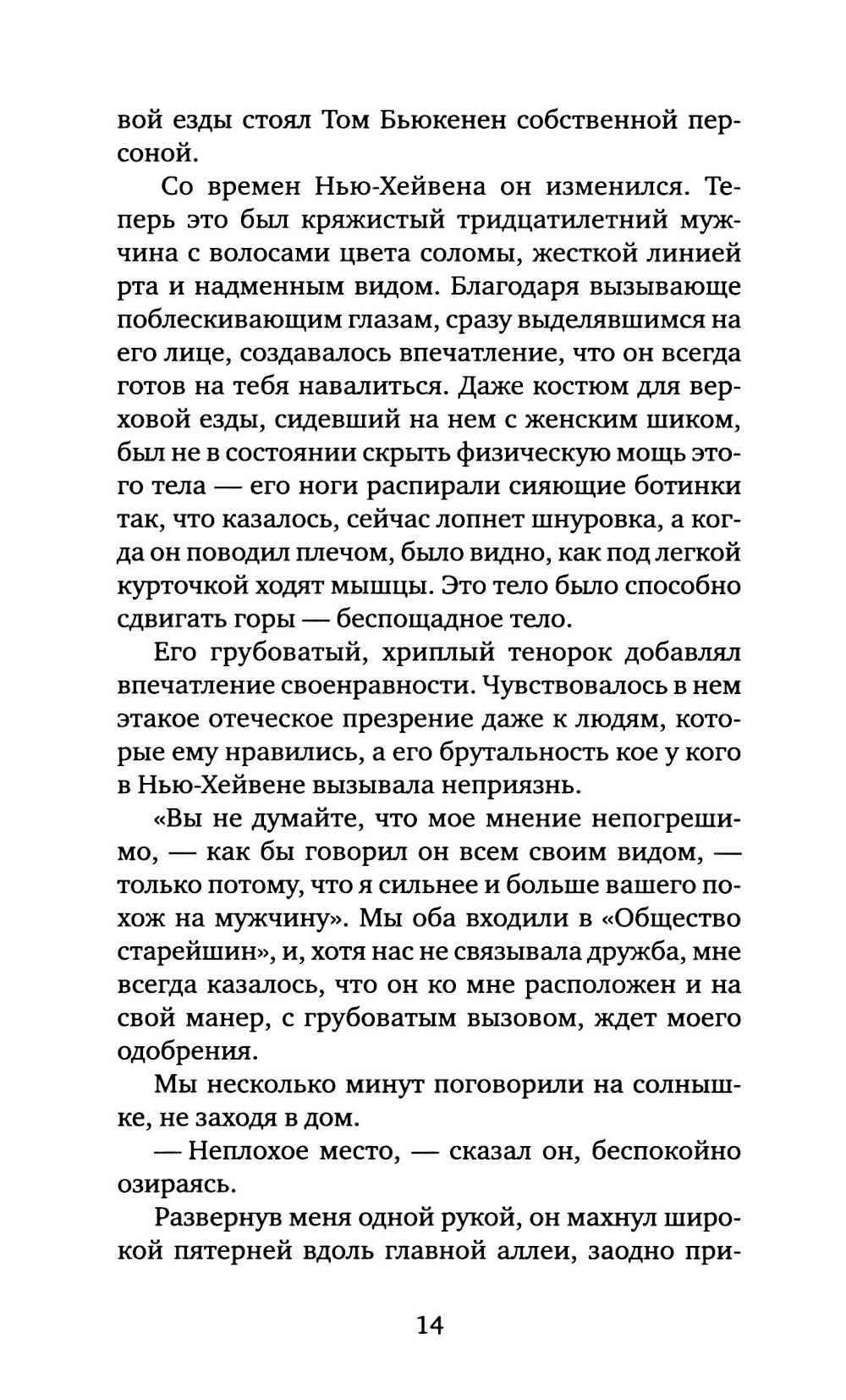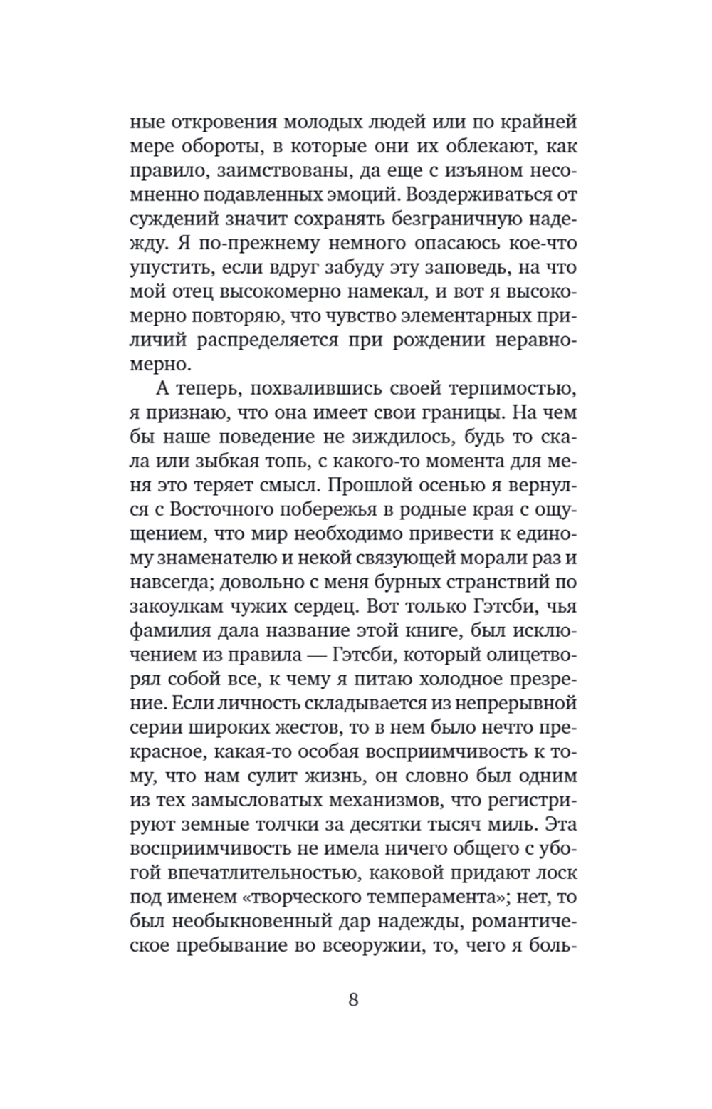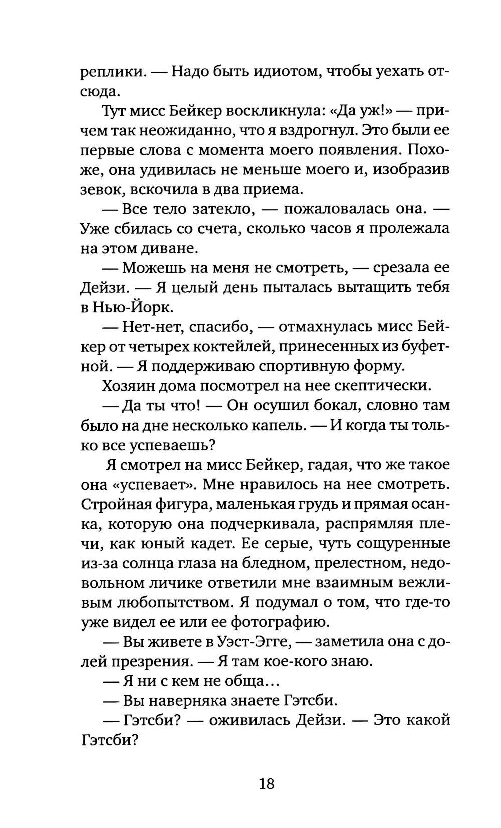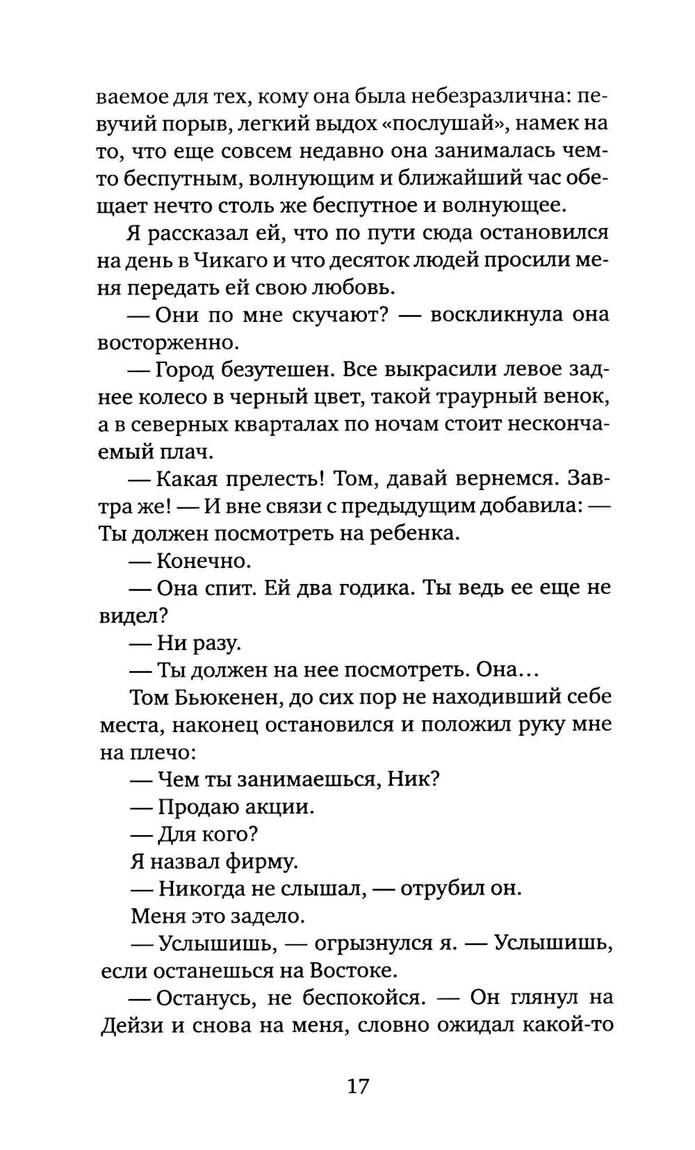 Роман Фрэнсиса Скотта Фицджеральда (1896-1940) «Великий Гэтсби»- один из шедевров американской литературы. Герой романа - воплощение двух противоположностей: наивный мечтатель, щедрый романтик, с одной стороны, с другой - делец, стремящийся к богатству и успеху. Вся его жизнь подчинена стремлению завоевать любовь молодой женщины Дейзи, ради этого он покупает виллу неподалеку от ее дома, устраивает бесконечные праздники, на которые приезжают толпы гостей. Но все напрасно: богатство и счастье отнюдь не одно и то же - после его смерти никто из людей, без зазрения совести пользующихся гостеприимством Гэтсби, и даже любимая женщина не пришли на его похороны. Таков трагический финал этого незаурядного мечтателя. Мой роман - о том, как растрачиваются иллюзии, которые придают миру такую красочность, что, испытав эту магию, человек становится безразличен к понятию об истинном и ложном.| Издательство | Текст |